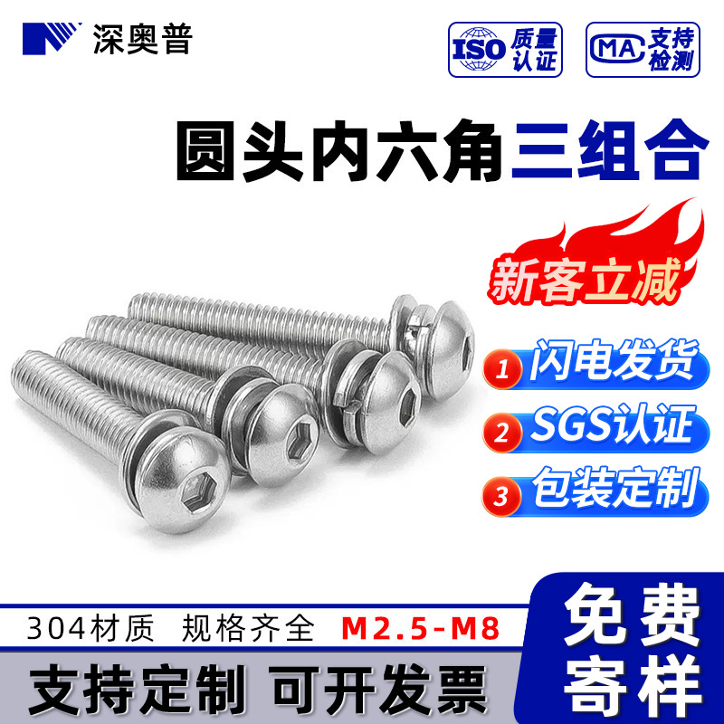 304 스테인레스 스틸 라운드 헤드 육각 소켓 헤드 3 개의 조합 나사 플랫 스프링 패드 M2.5M3M4M5-M8 둥근 헤드 볼트스토어 가기