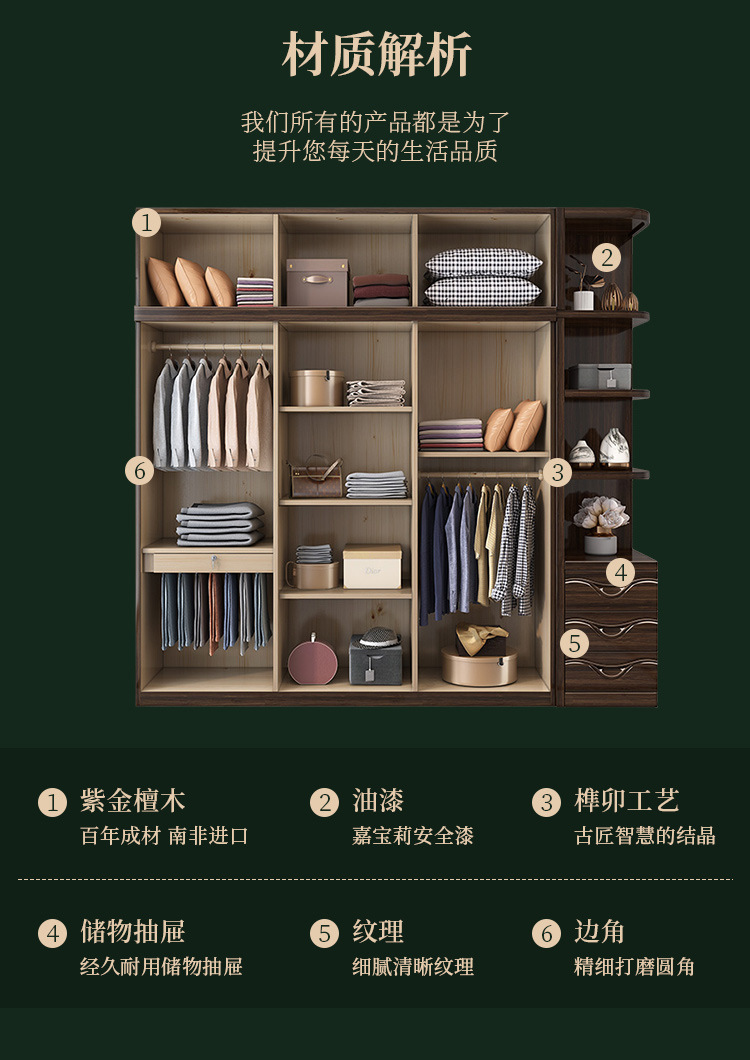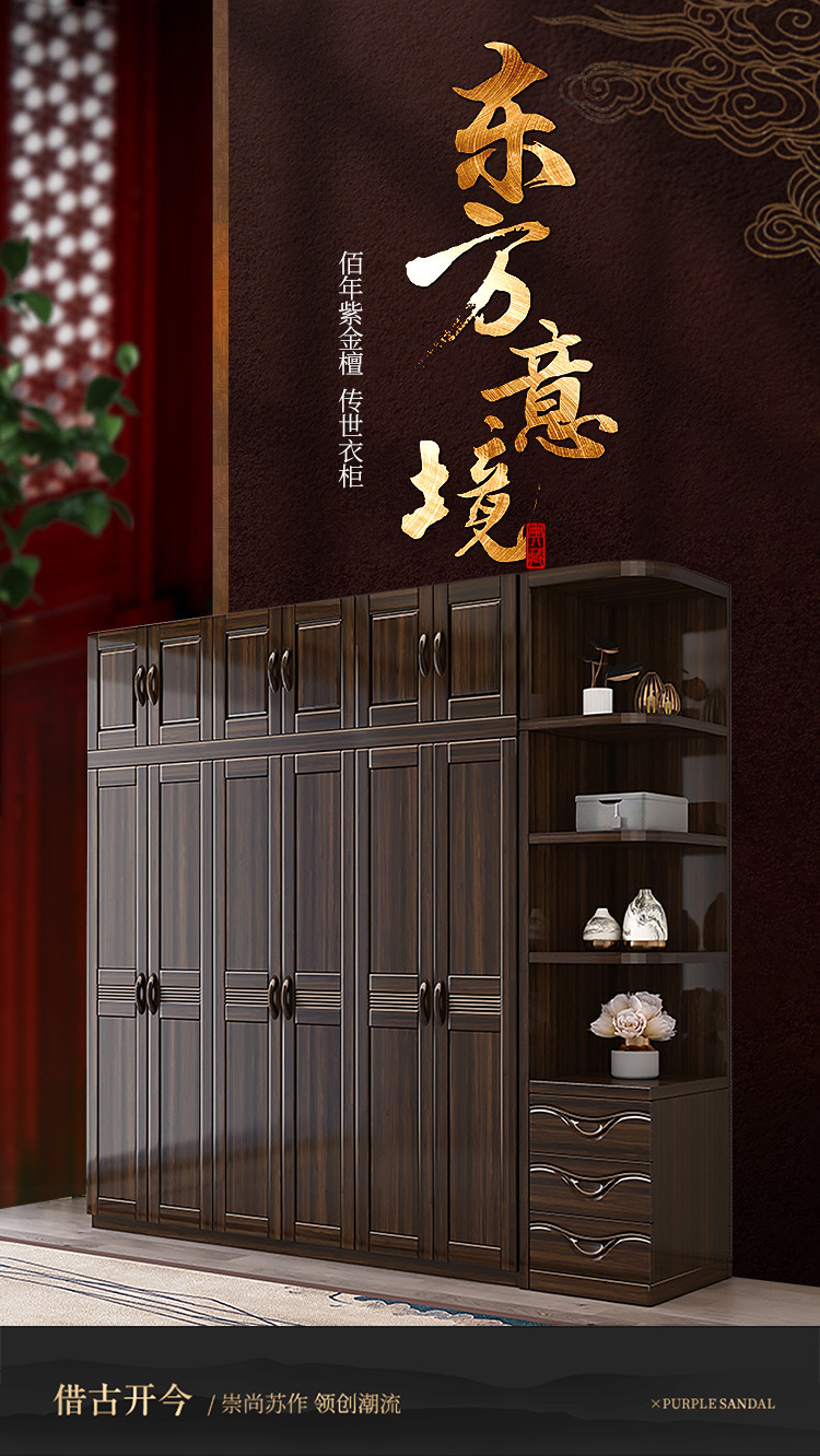 새로운 중국 스타일 풀 솔리드 우드 옷장 퍼플 골드 샌달 우드 라이트 럭셔리 현대 플랫 도어 가정용 보관 침실 나무 옷장