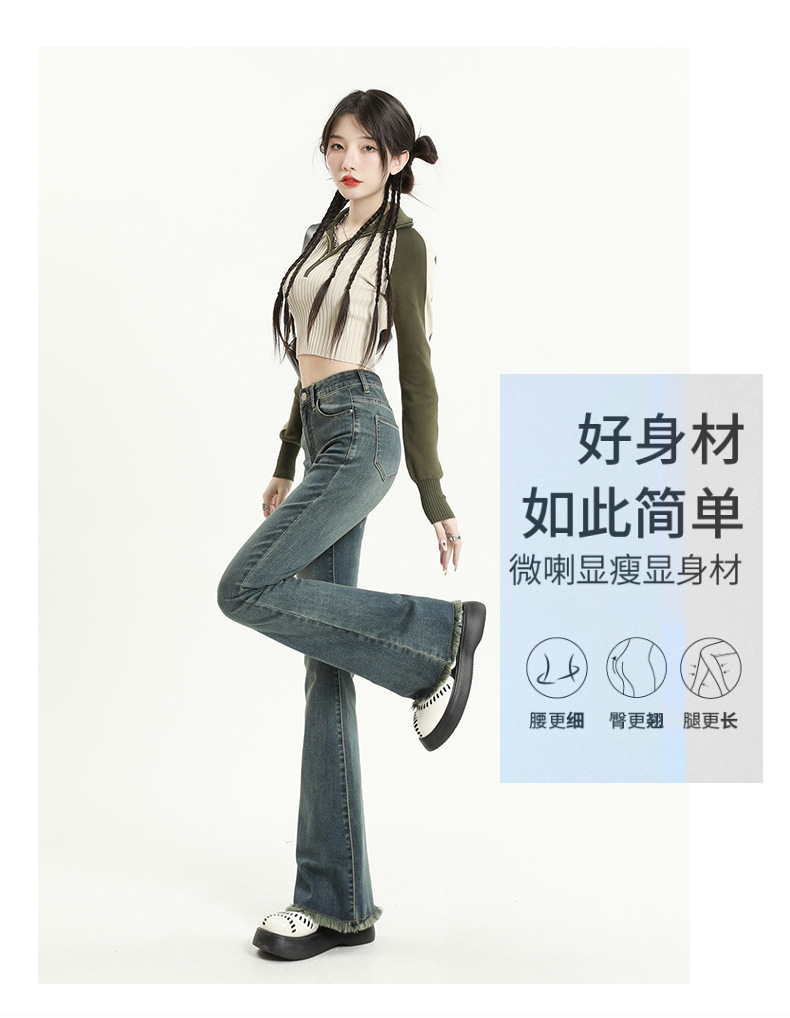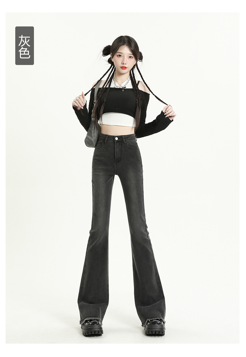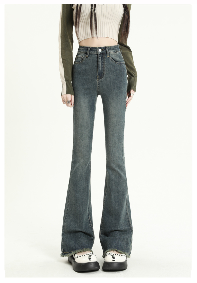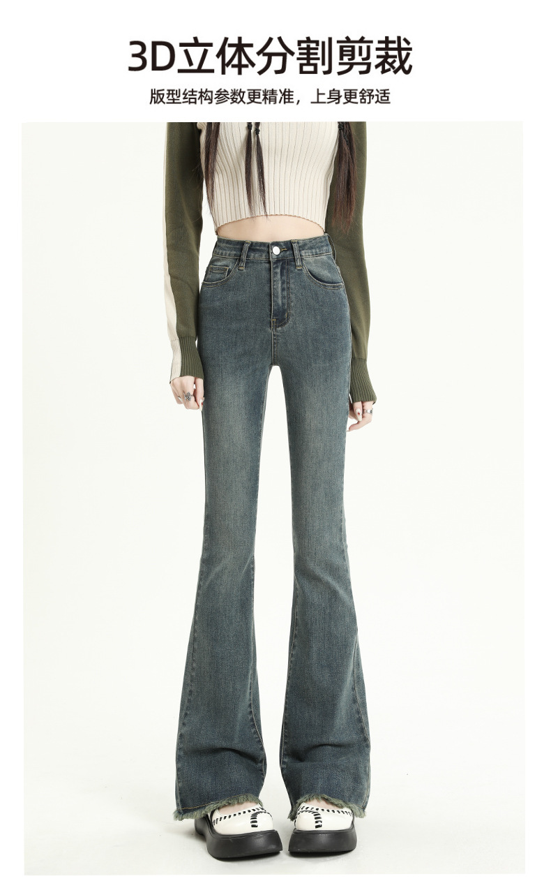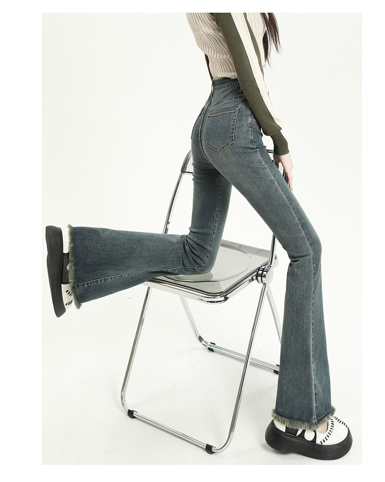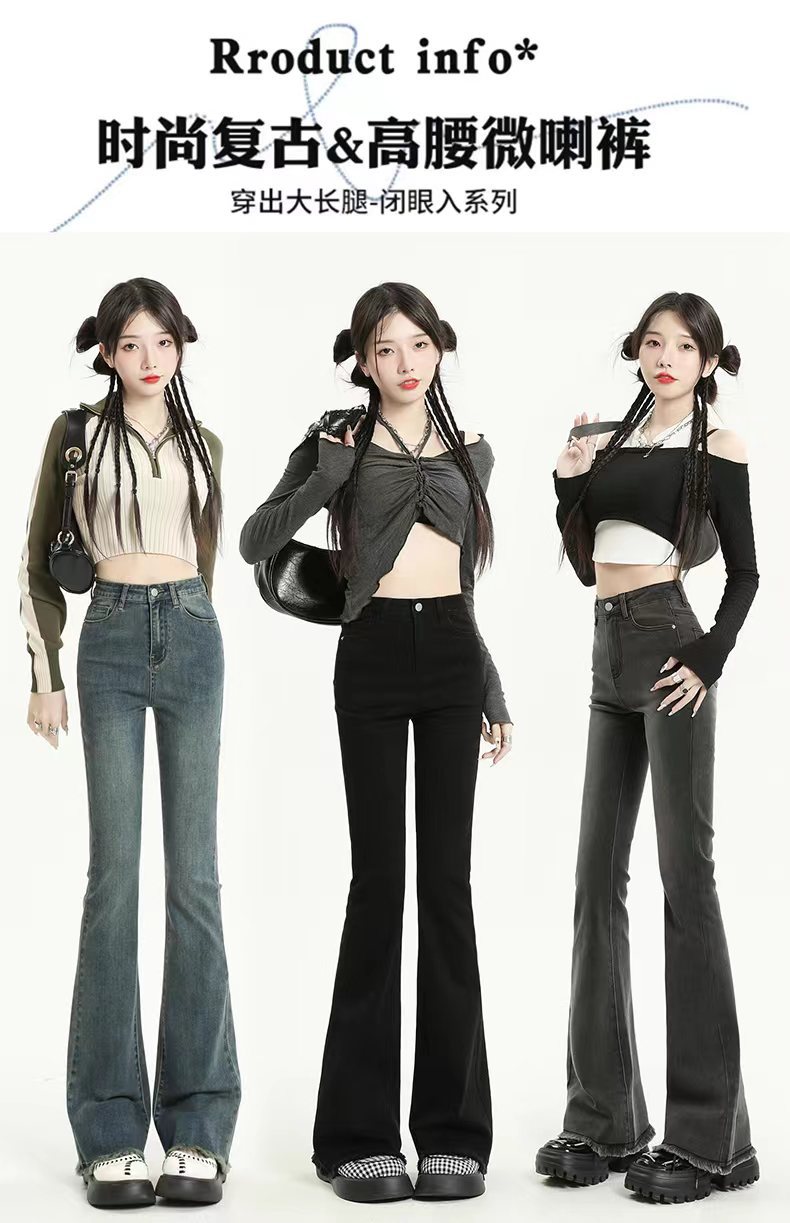 여성용 마이크로 플레어 진, 가을 신상, 한국 스타일, 슬림핏, 하이웨이스트, 키 작은 여성용, 데미지 플레어 팬츠스토어 가기