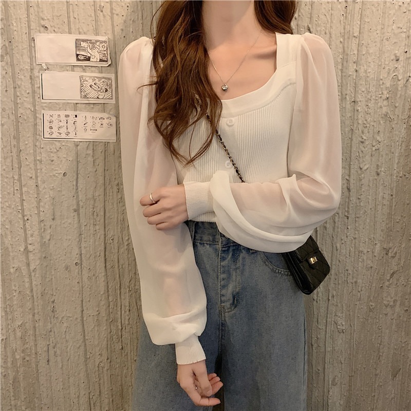 대외 무역 화이트 스퀘어 칼라 스웨터 2023 이른 봄 새로운 여성 의류 디자인 감각 틈새 짧은 탑 버블 슬리브스토어 가기