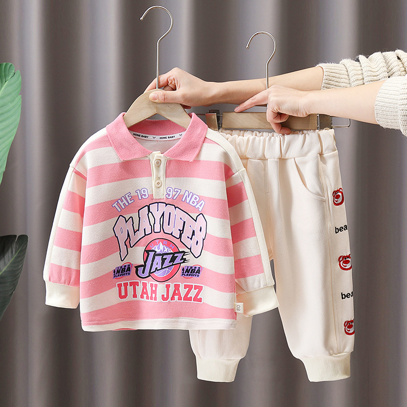 아기의 봄 스트라이프 핑크 곰 세트 어린이의 봄과 가을 세련된 캐주얼 투피스 소년 만화 스웨터 유행