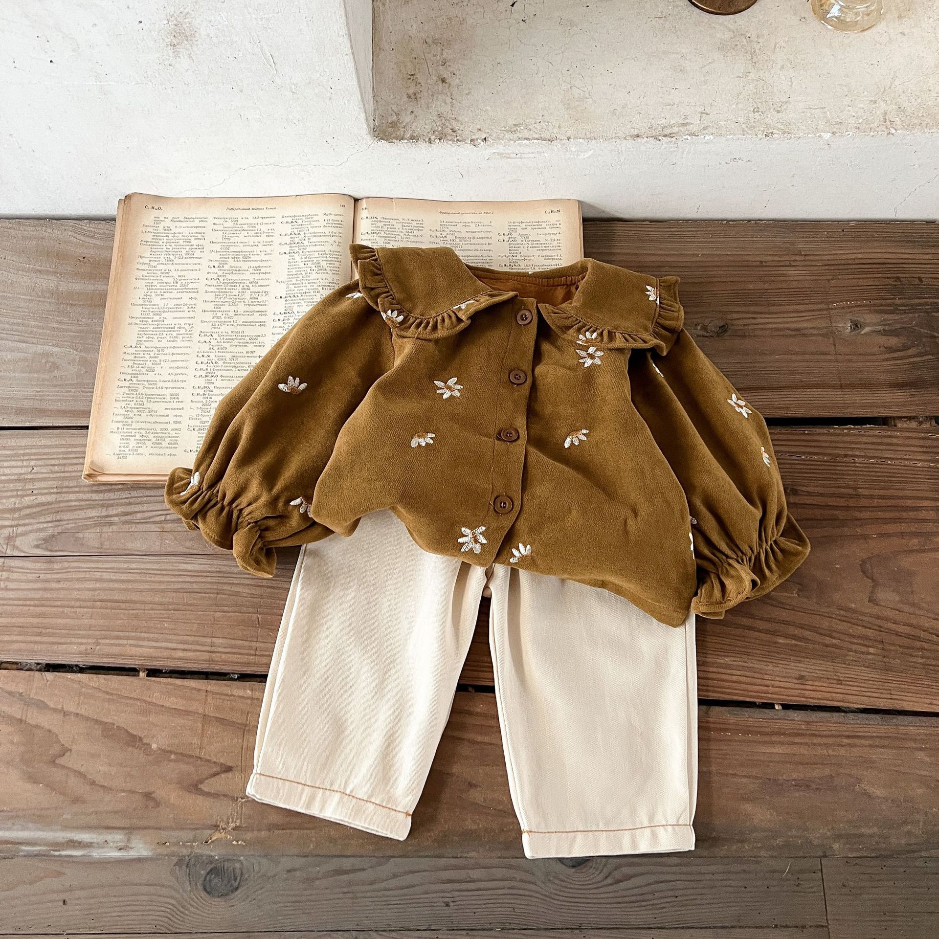 한국식 봄 소녀 코듀로이 자수 옷깃 셔츠 + 청바지 세트 면 느슨한 투피스 패션스토어 가기