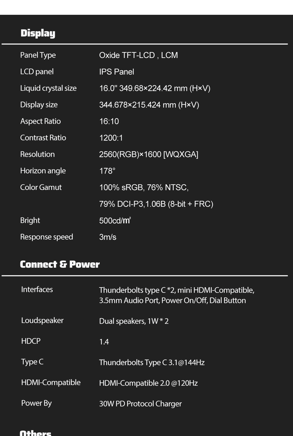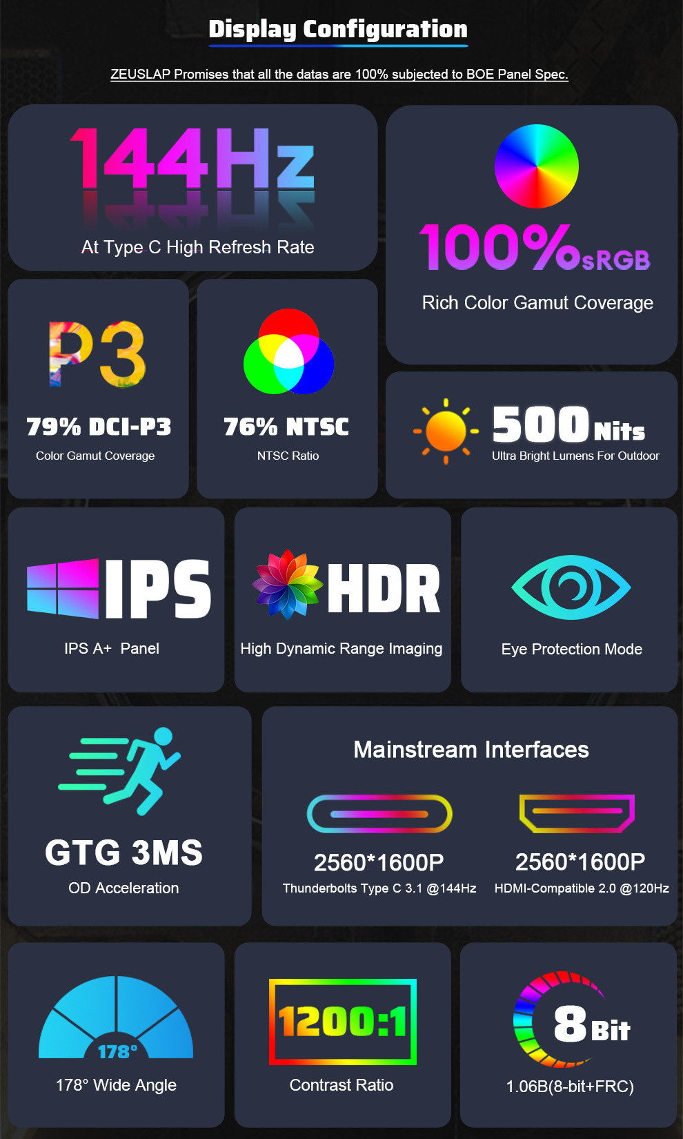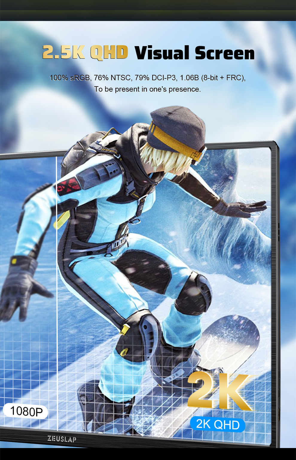 ZEUSLAP Zeus P16K 16 인치 휴대용 디스플레이 2.5K 144Hz 100 색 영역 500 밝기 Z16P