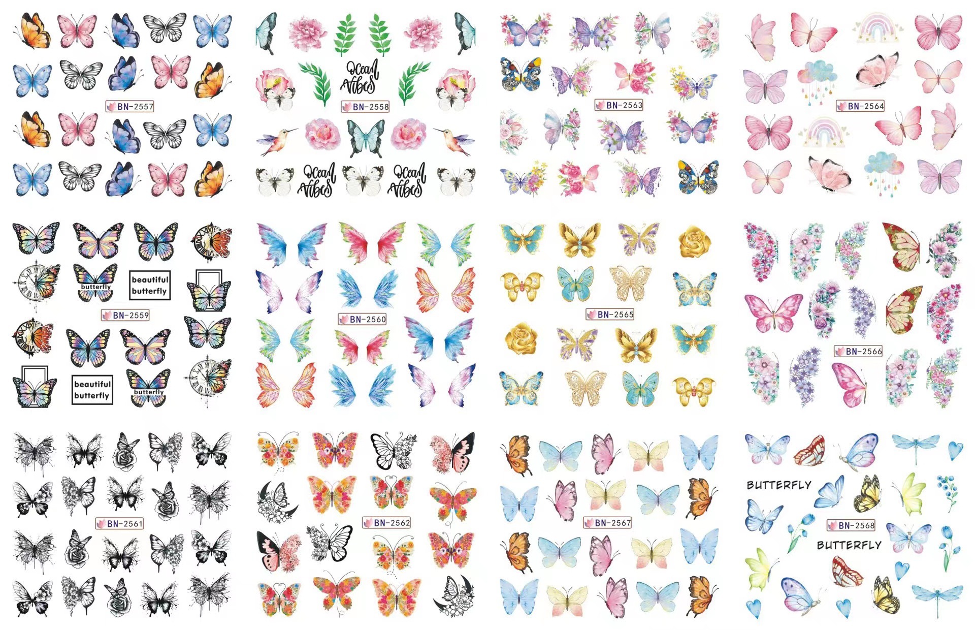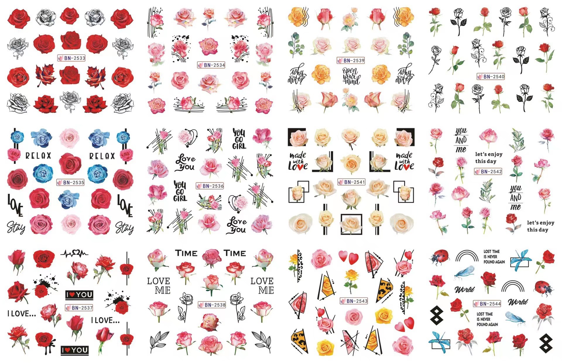 2023 크로스 보더 네일 아트 물 전송 인쇄 데칼 봄과 여름 꽃 장미 나비 12 작은 독립 절묘한 포장스토어 가기