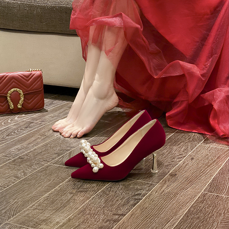 316-A89 빨간 웨딩 슈즈 여성 Xiuhe 신부 하이힐 메인 웨딩 원피스 스틸레토 힐 진주 피곤하지 않은 발 플러스 사이즈 신발스토어 가기