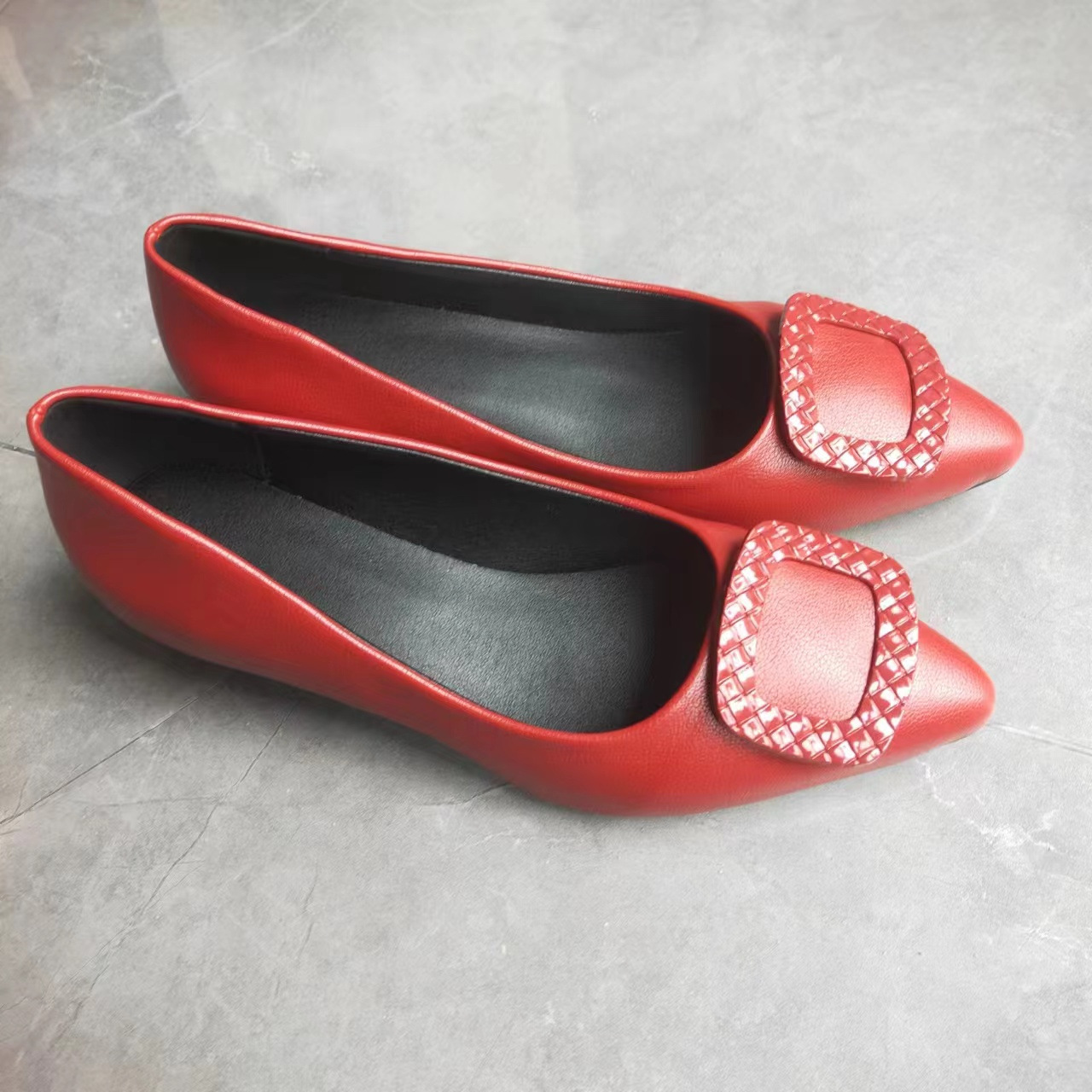 패션 싱글 레이어 신발 여성의 2024 봄 새로운 도착 얕은 입 솔리드 컬러 작업 신발 슬립 온 게으른 신발 스퀘어 버클 미드 힐 포인팅스토어 가기
