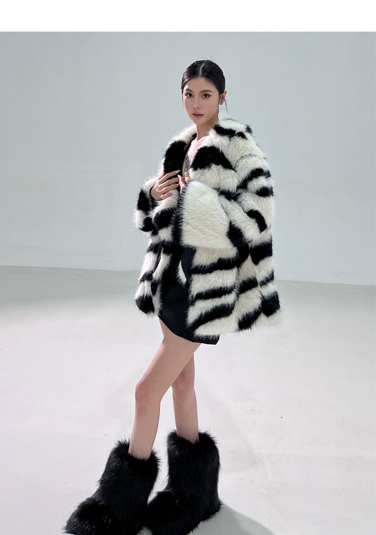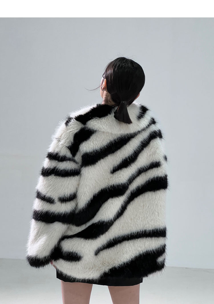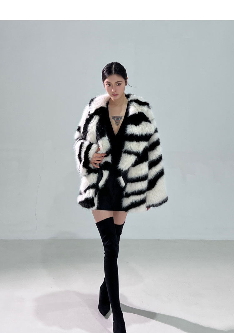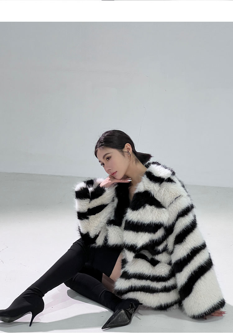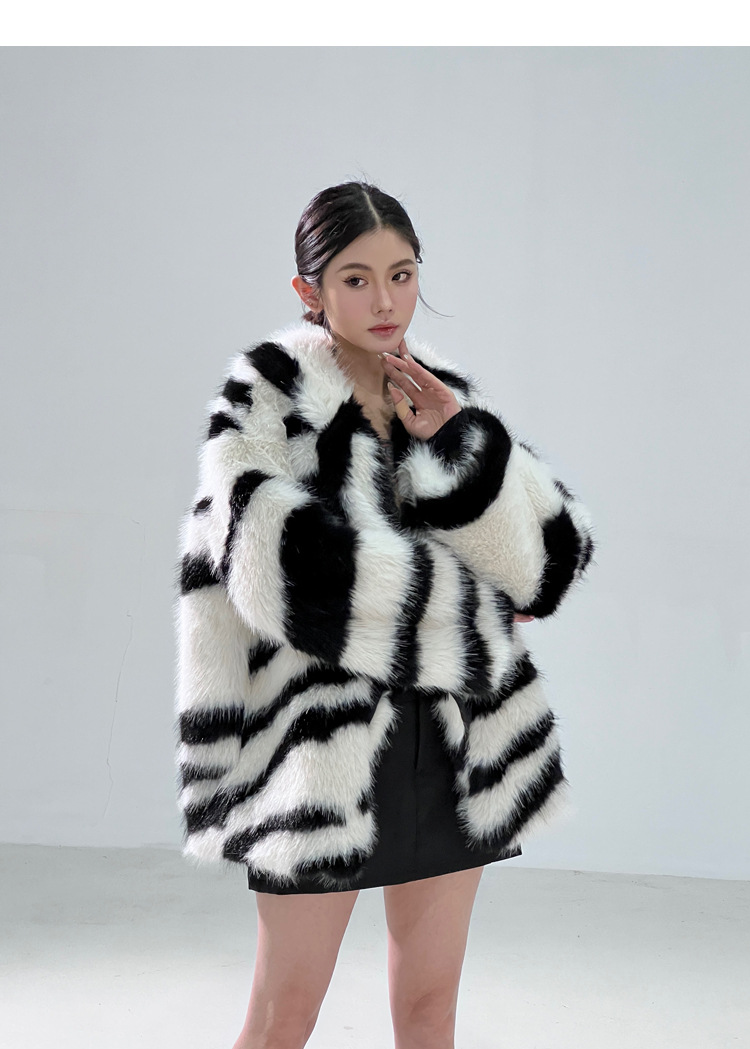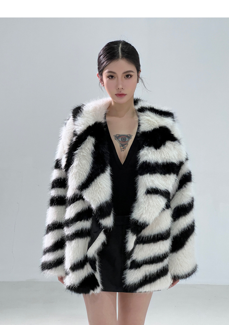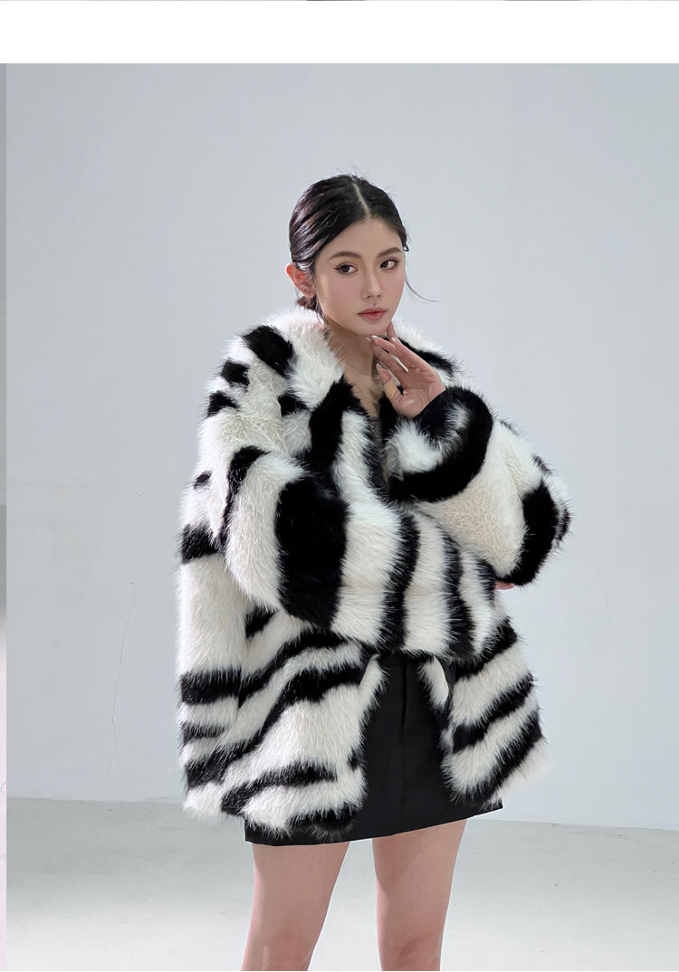 2023 겨울 신상 핫 걸 얼룩말 짧은 친환경 모피 여성용 고급 라펠 흑백 모피 코트 겨울스토어 가기