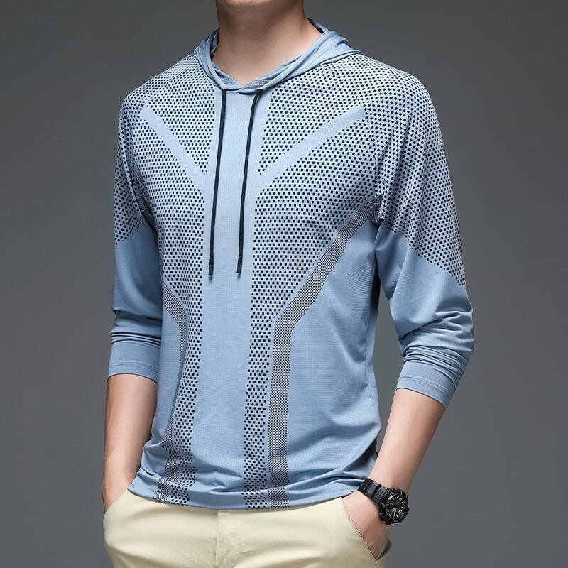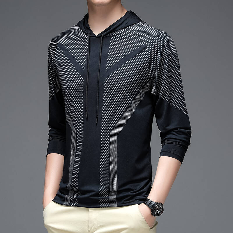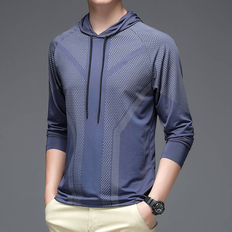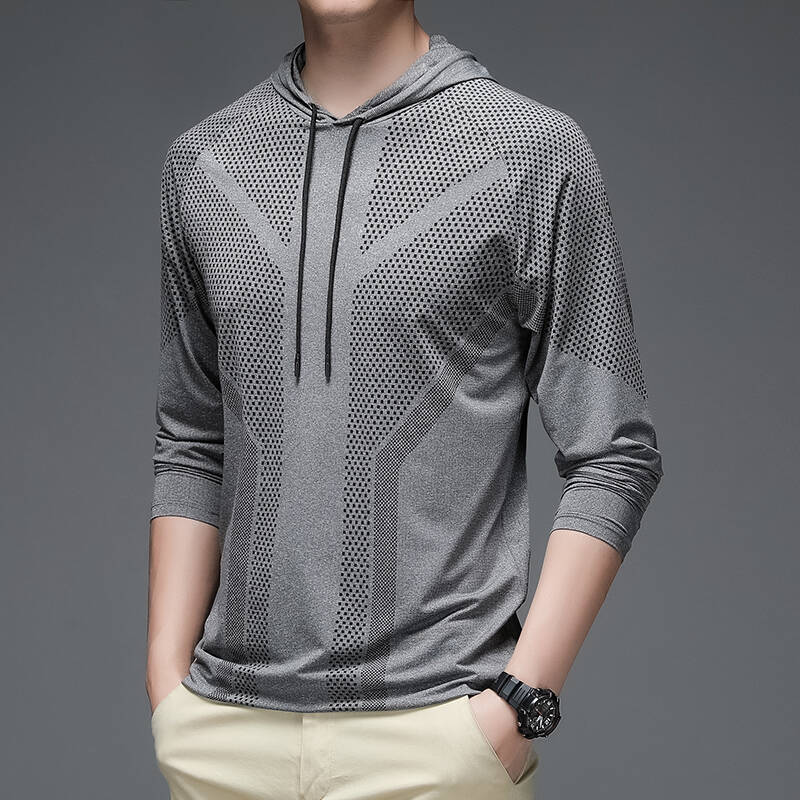 무료 배송 후드 긴팔 티셔츠 남성용 얇은 봄과 여름 새로운 통기성 아이스 실크 티셔츠 남성용 피트니스 탄성 스포츠 티셔츠