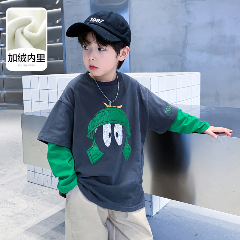 만화 유행 아동 의류 소년 긴팔 티셔츠 가을 2025 새로운 어린이 가짜 투피스 바닥 셔츠 중대형 아동 가을 의류스토어 가기