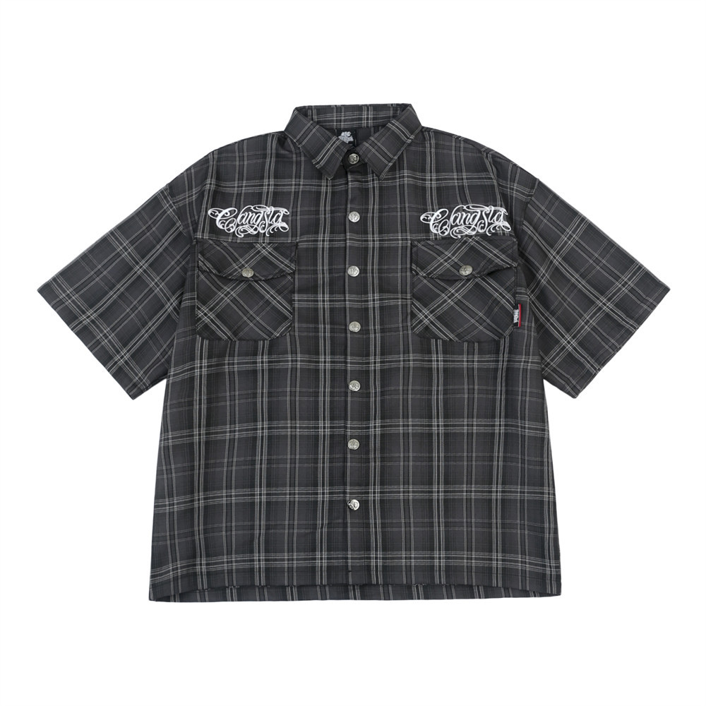 높은 거리 자수 편지 짧은 소매 셔츠 남성 캐주얼 옷깃 반 소매 슬릿 탑 여름 외부 셔츠스토어 가기