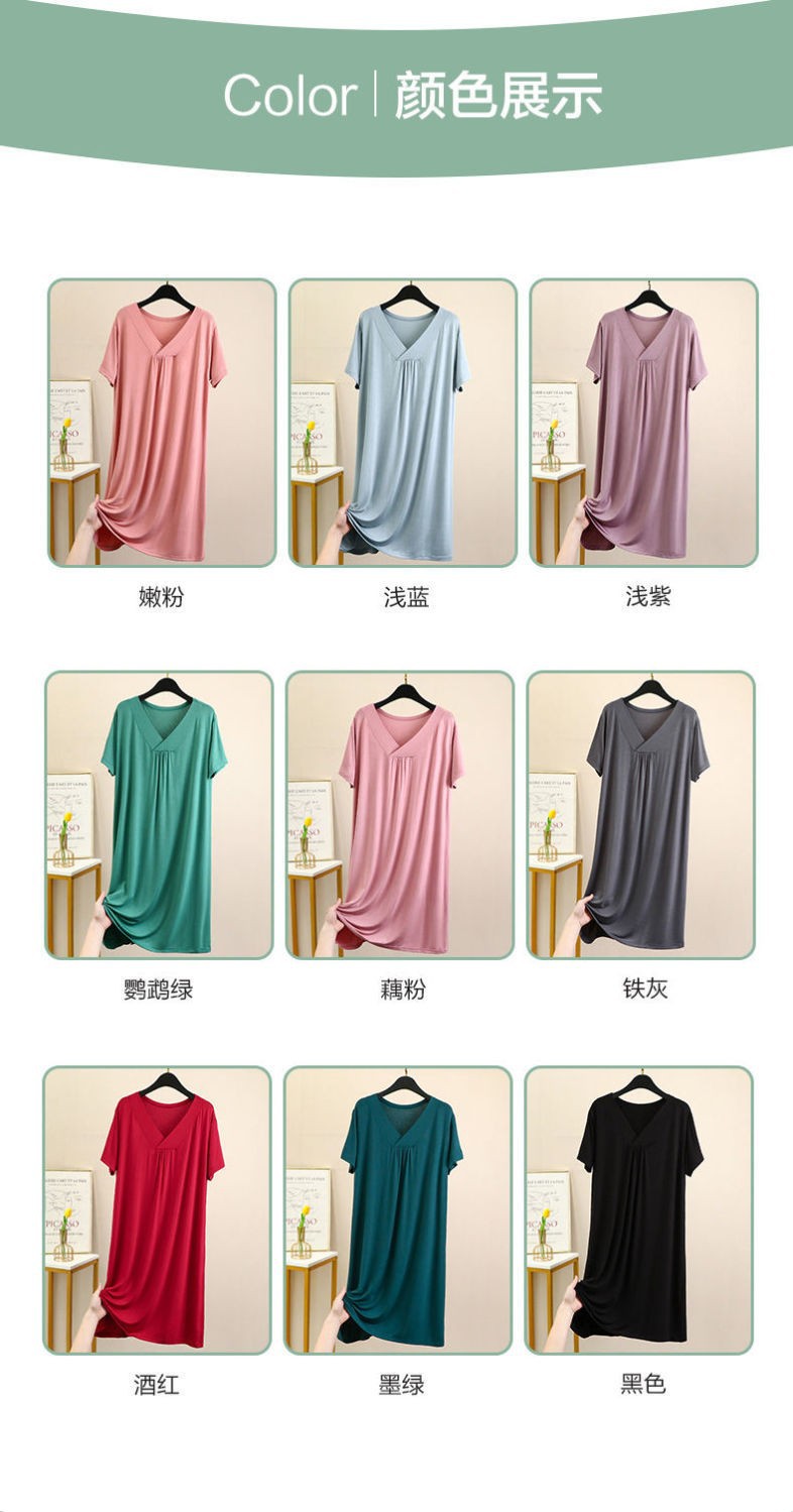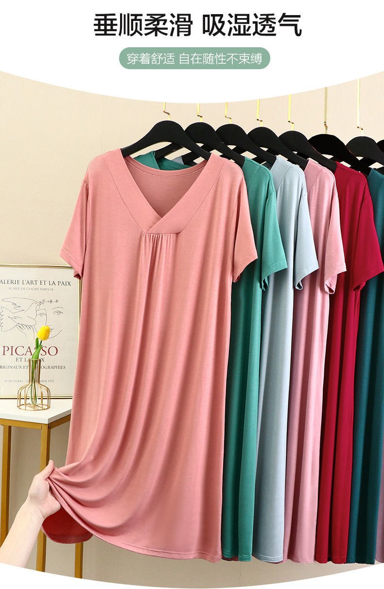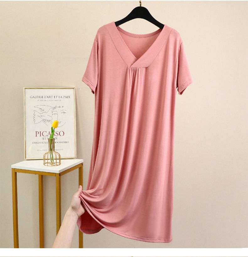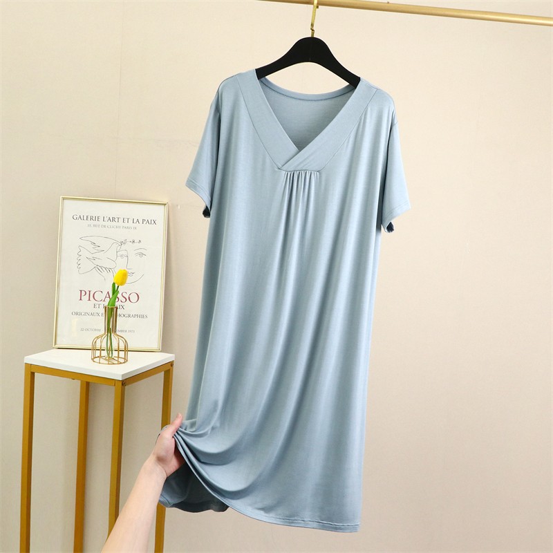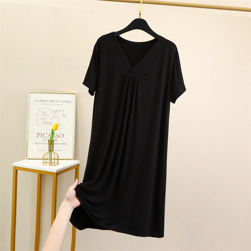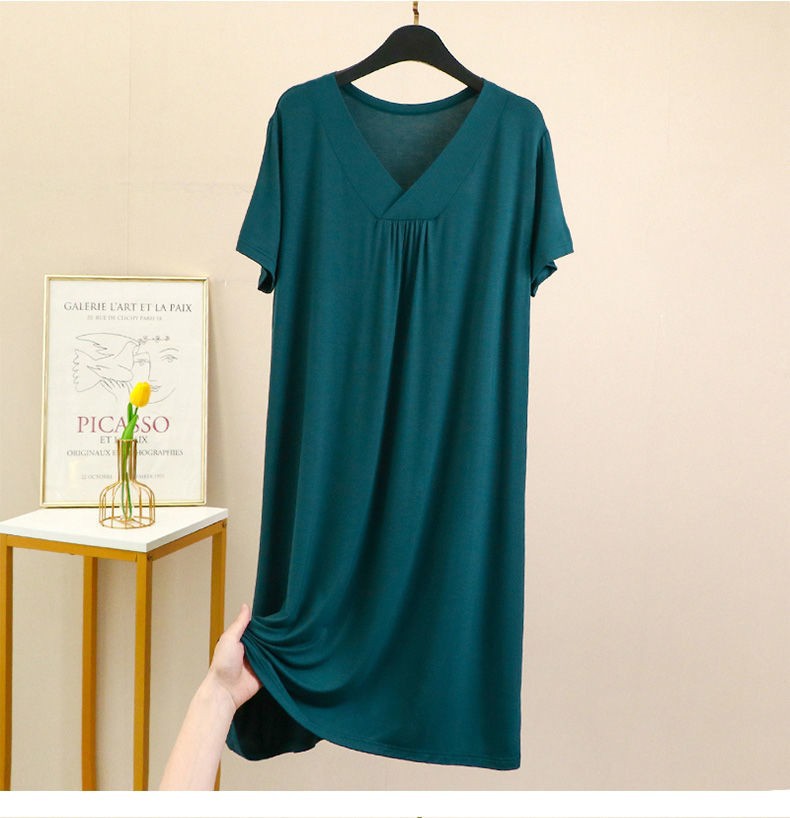모달 얇은 V-넥 중간 길이 원피스 여름 플러스 사이즈 반팔 잠옷 느슨한 큰 스윙 원피스 홈 원피스 A-라인 원피스
