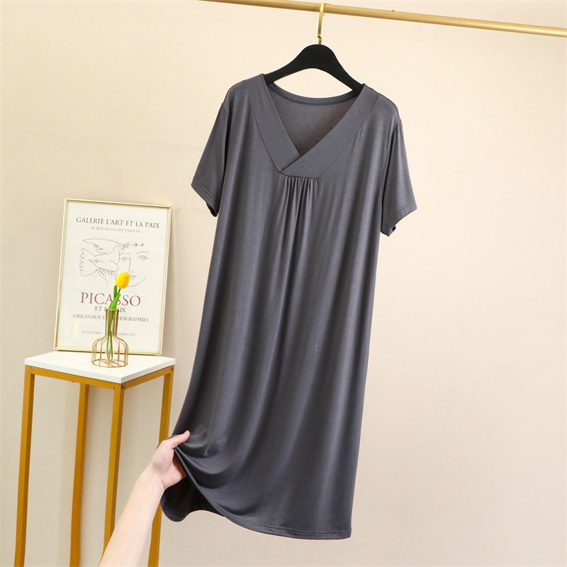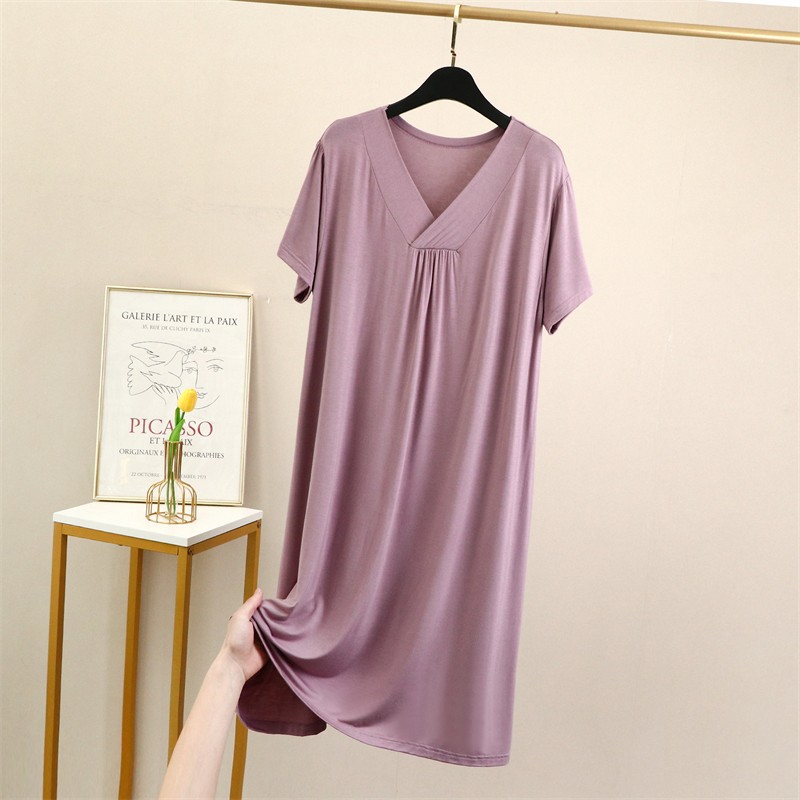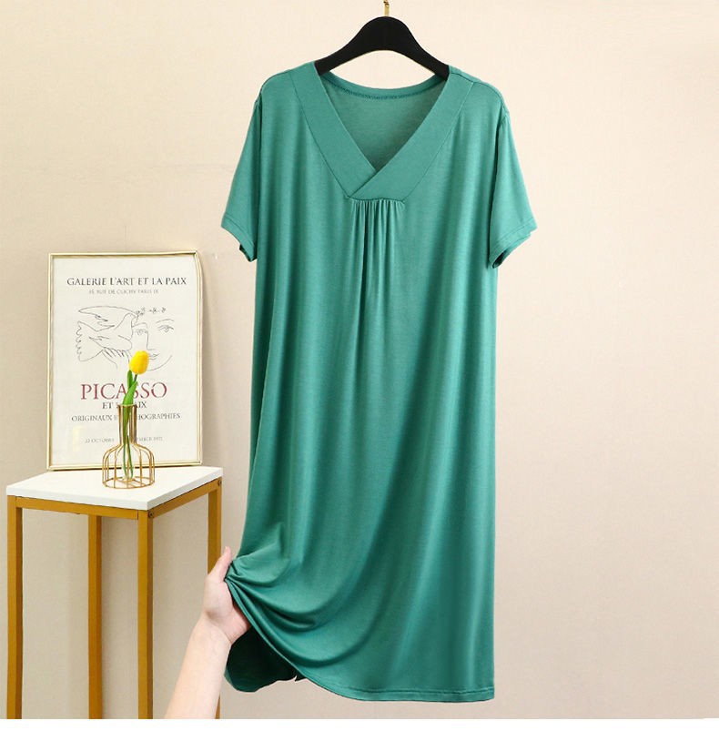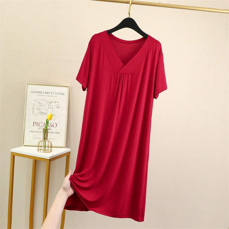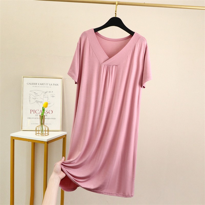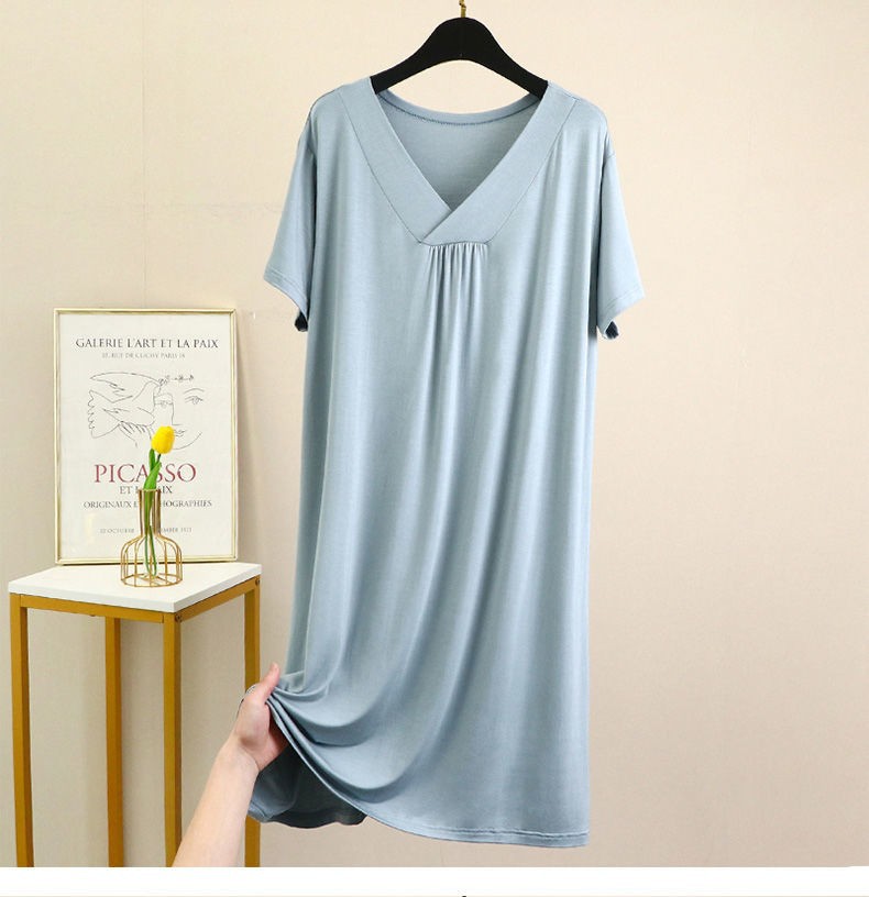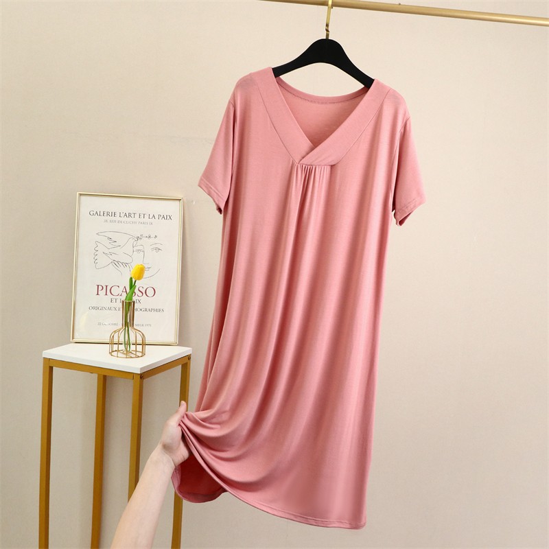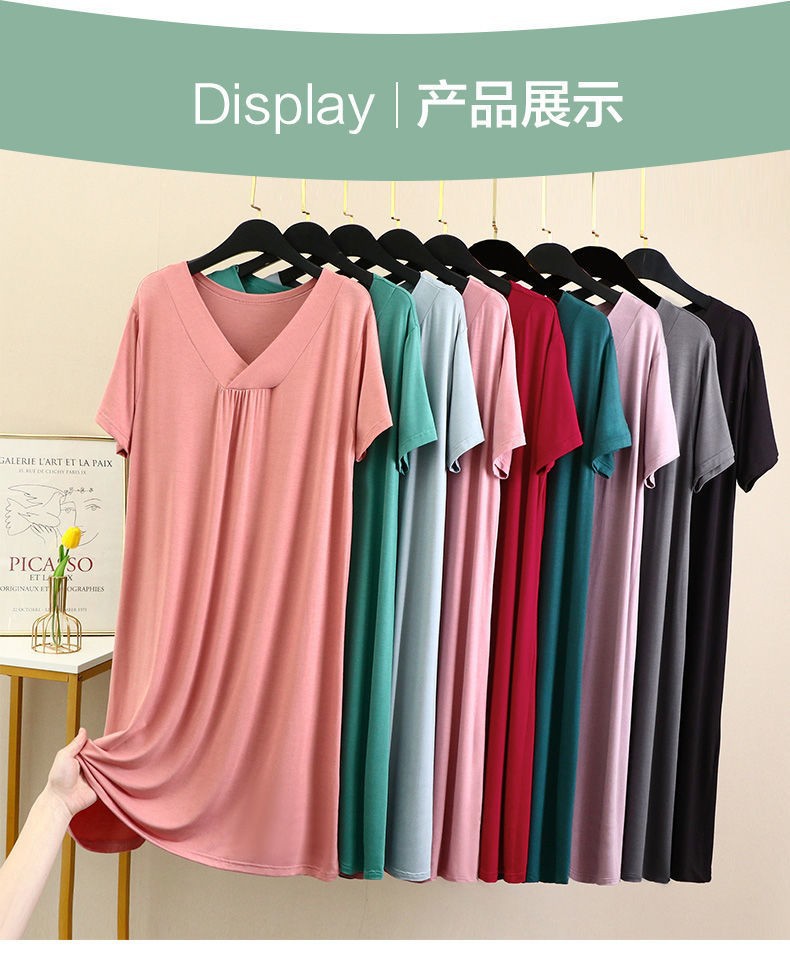 모달 얇은 V-넥 중간 길이 원피스 여름 플러스 사이즈 반팔 잠옷 느슨한 큰 스윙 원피스 홈 원피스 A-라인 원피스