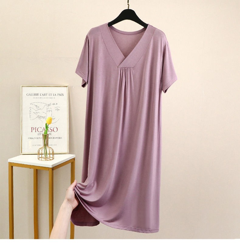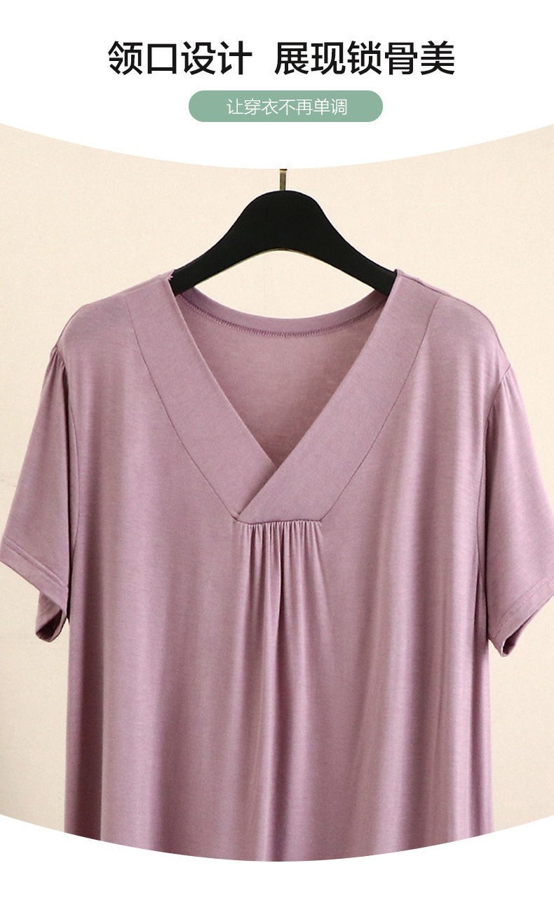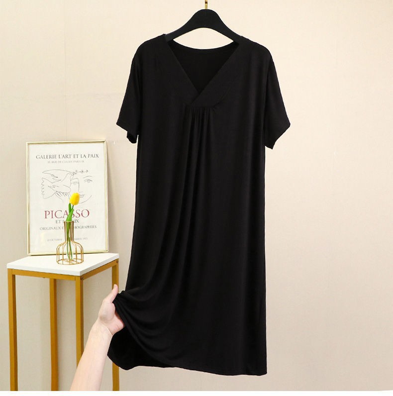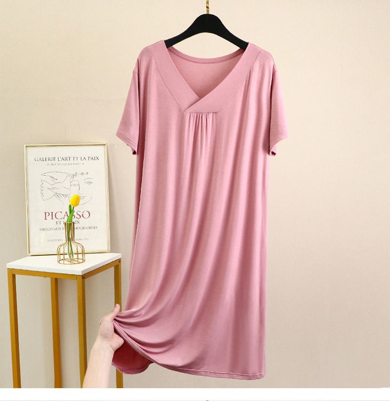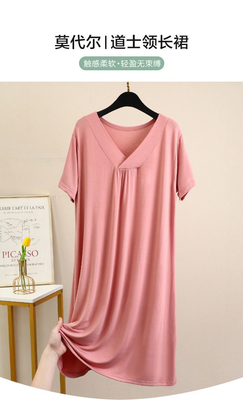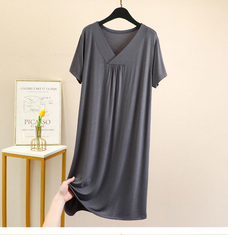모달 얇은 V-넥 중간 길이 원피스 여름 플러스 사이즈 반팔 잠옷 느슨한 큰 스윙 원피스 홈 원피스 A-라인 원피스