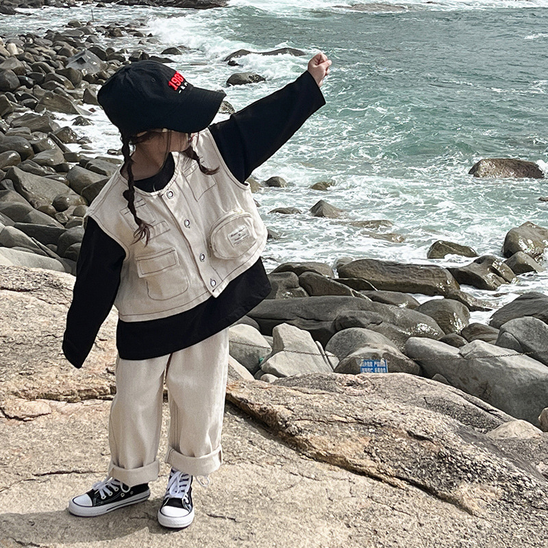 Miao Xuan 아동복 아동 조끼 봄과 가을 아우터 2023 새로운 한국 스타일 소녀의 캐주얼 아우터 봄 민소매 재킷스토어 가기