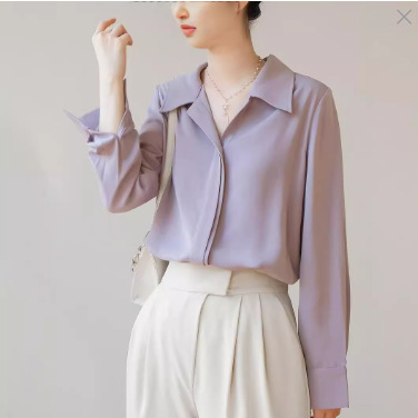 2025 봄 가을 보라색 셔츠 여성용 뒤트임 디자인 독특한 넓은 앞면 긴소매 출근용 블라우스 카라 우아한 분위기스토어 가기