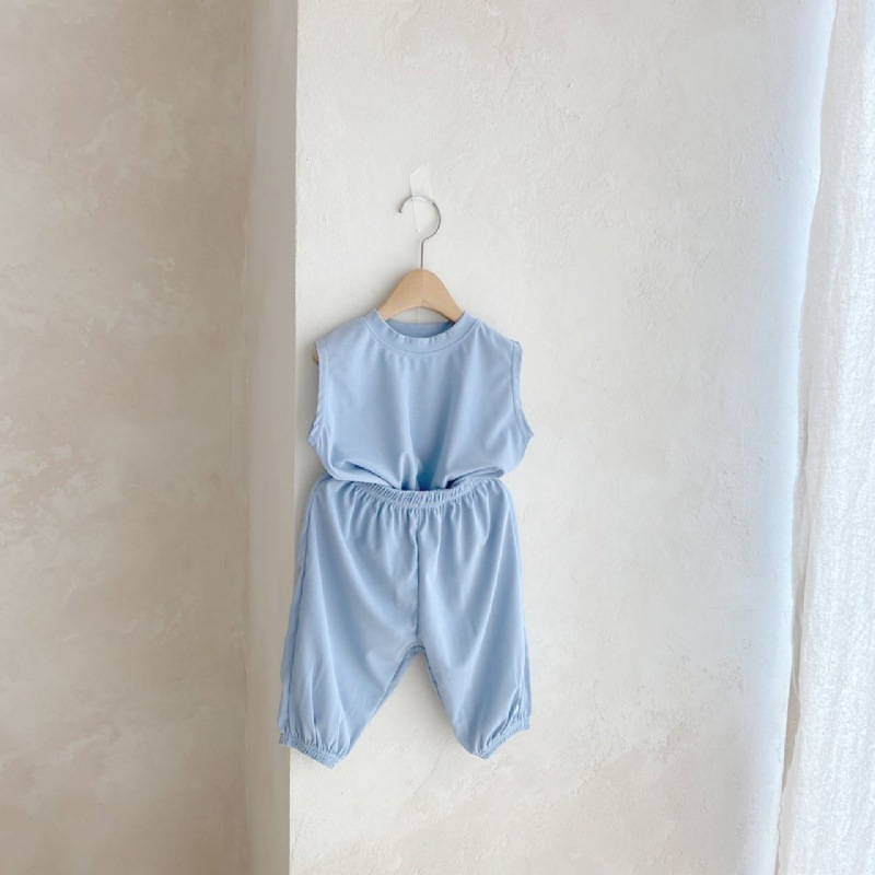 한국 어린이 세트 in 소년 소녀 여름 2023 새로운 모든 경기 단색 얇은 면 티셔츠 통 바지 투피스 세트