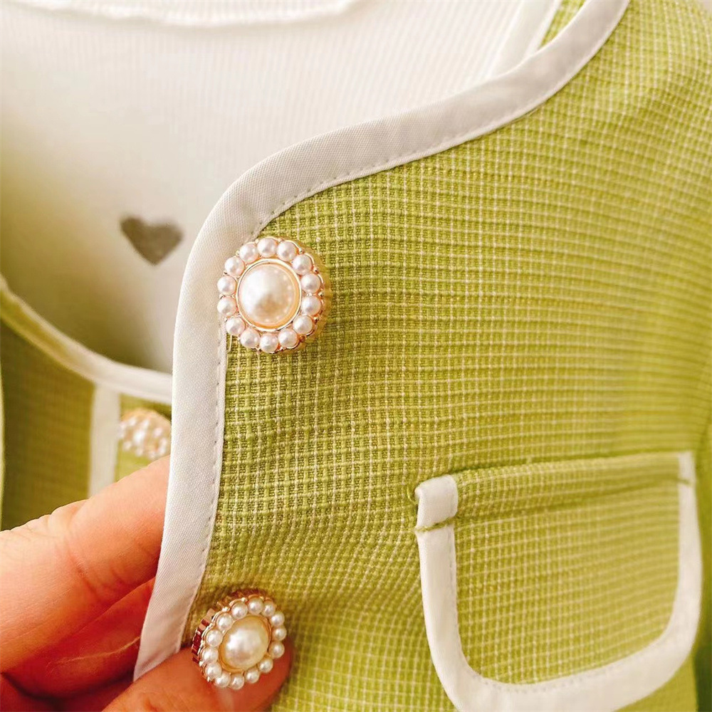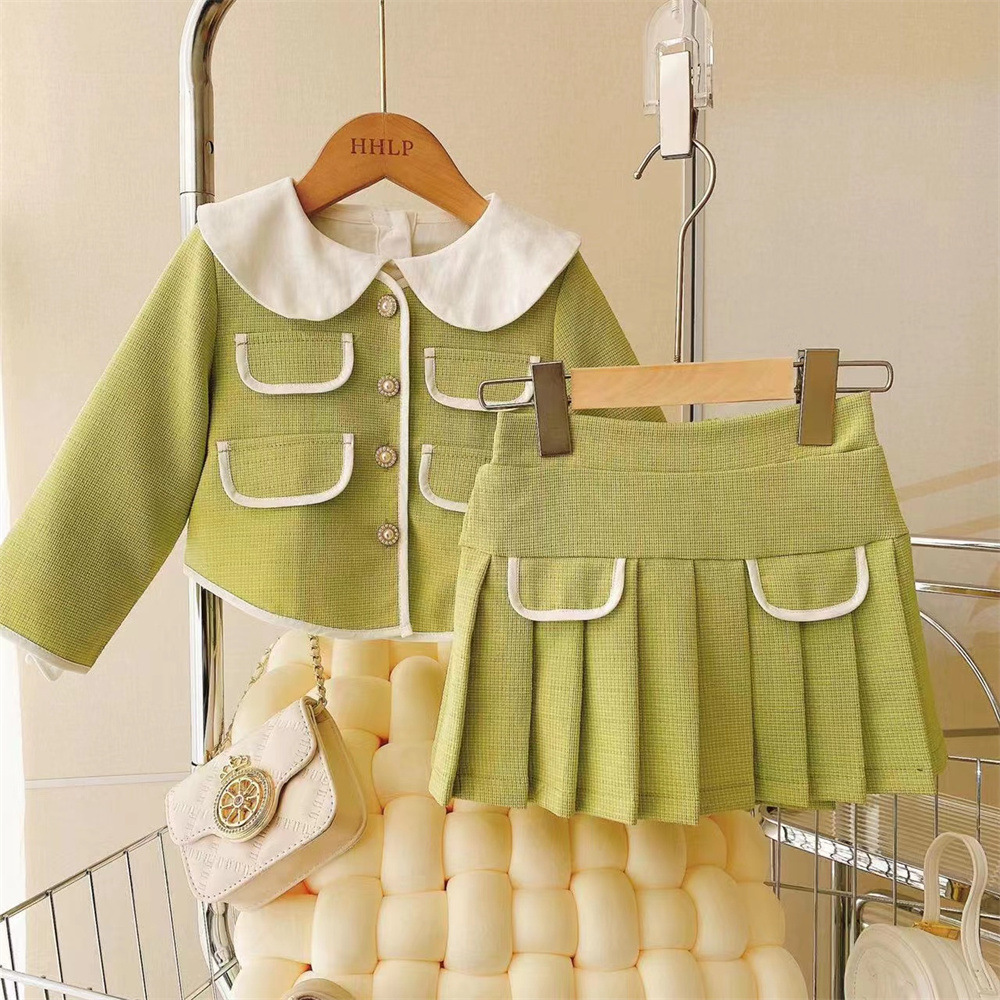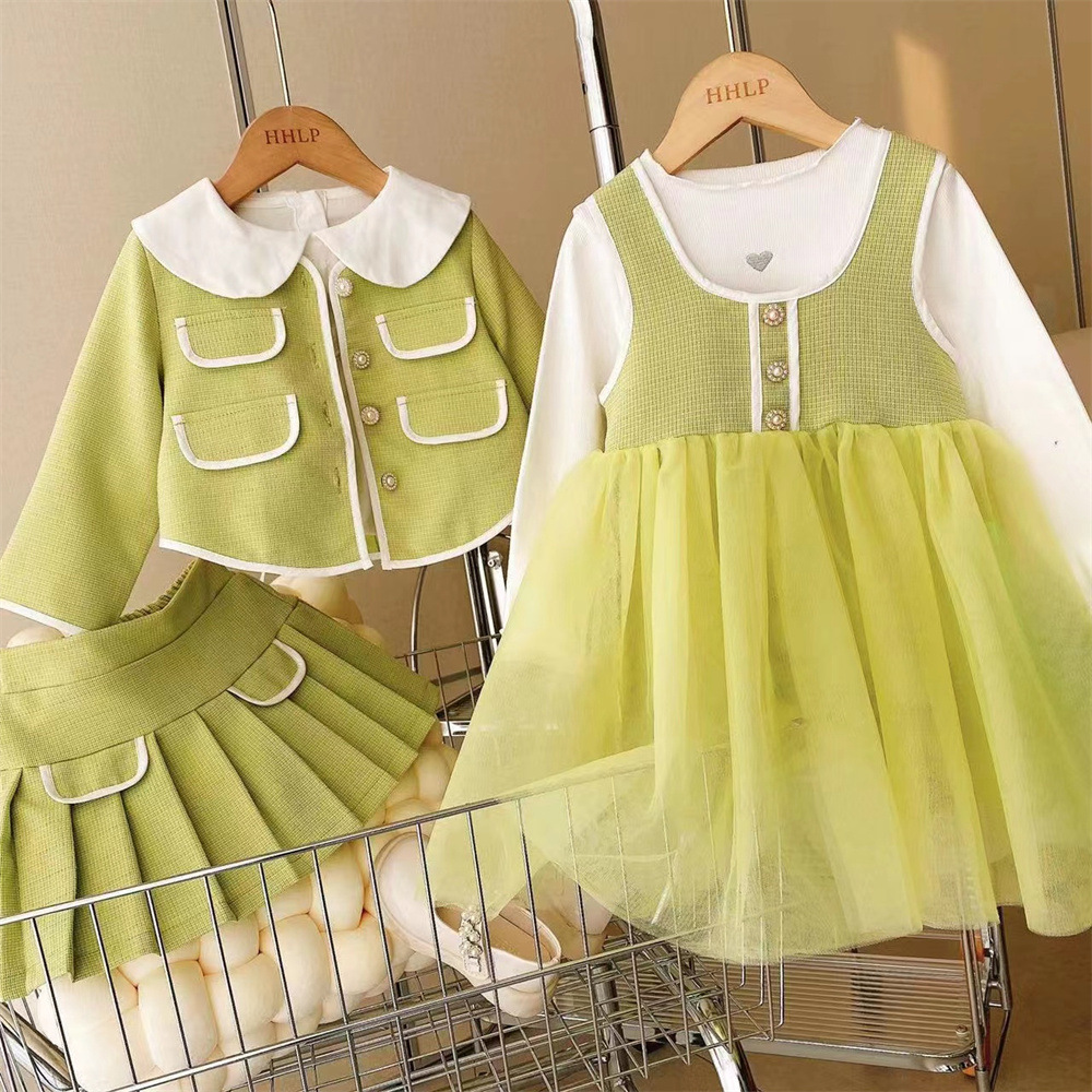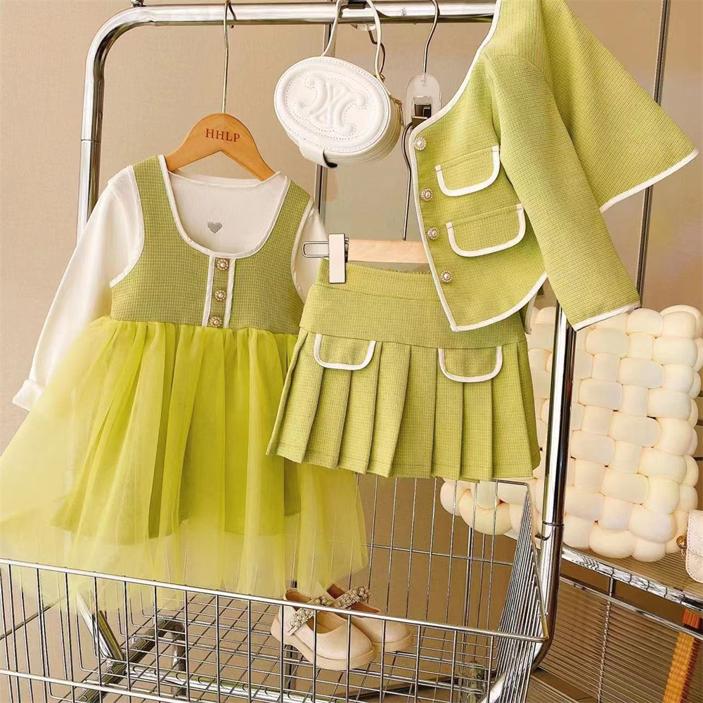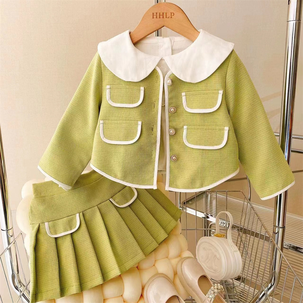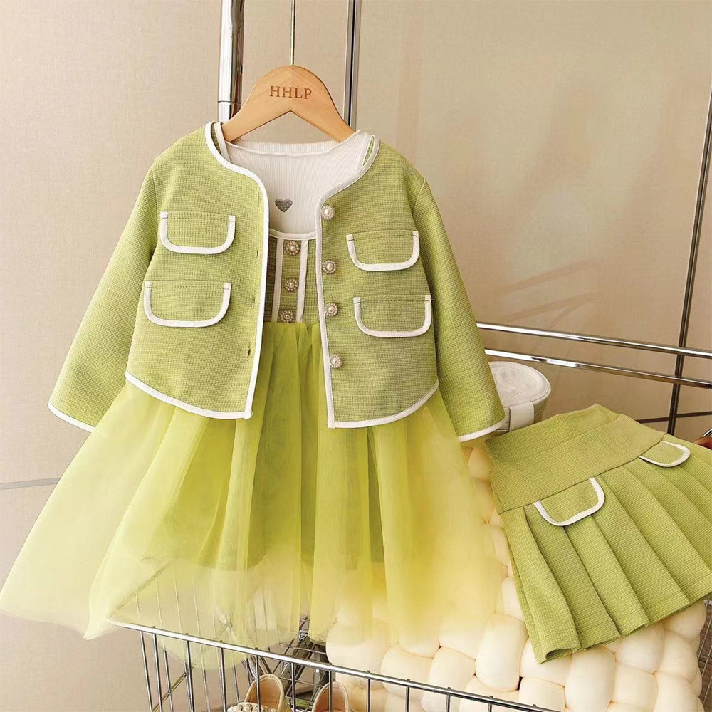 새로운 소녀의 우아한 샤넬 스타일 코트 회전 원사 조끼 스커트 쓰리 피스 세트 2023 봄과 가을 스타일