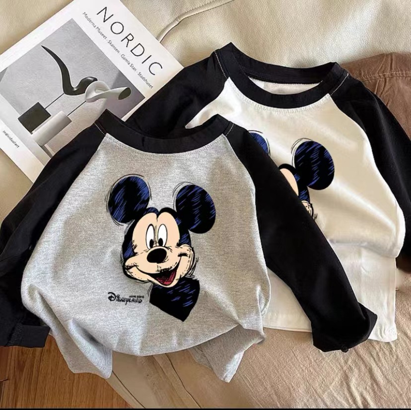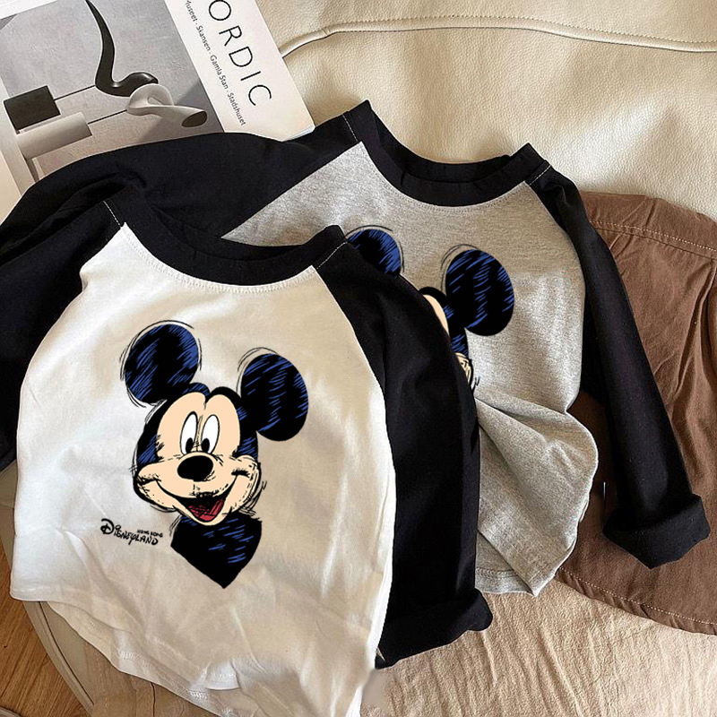 순면 남아 및 여아용 하의 셔츠, 긴팔 티셔츠, 신상 봄 베이비 상의, 어린이 및 중년 어린이를 위한 만화 미키 상의