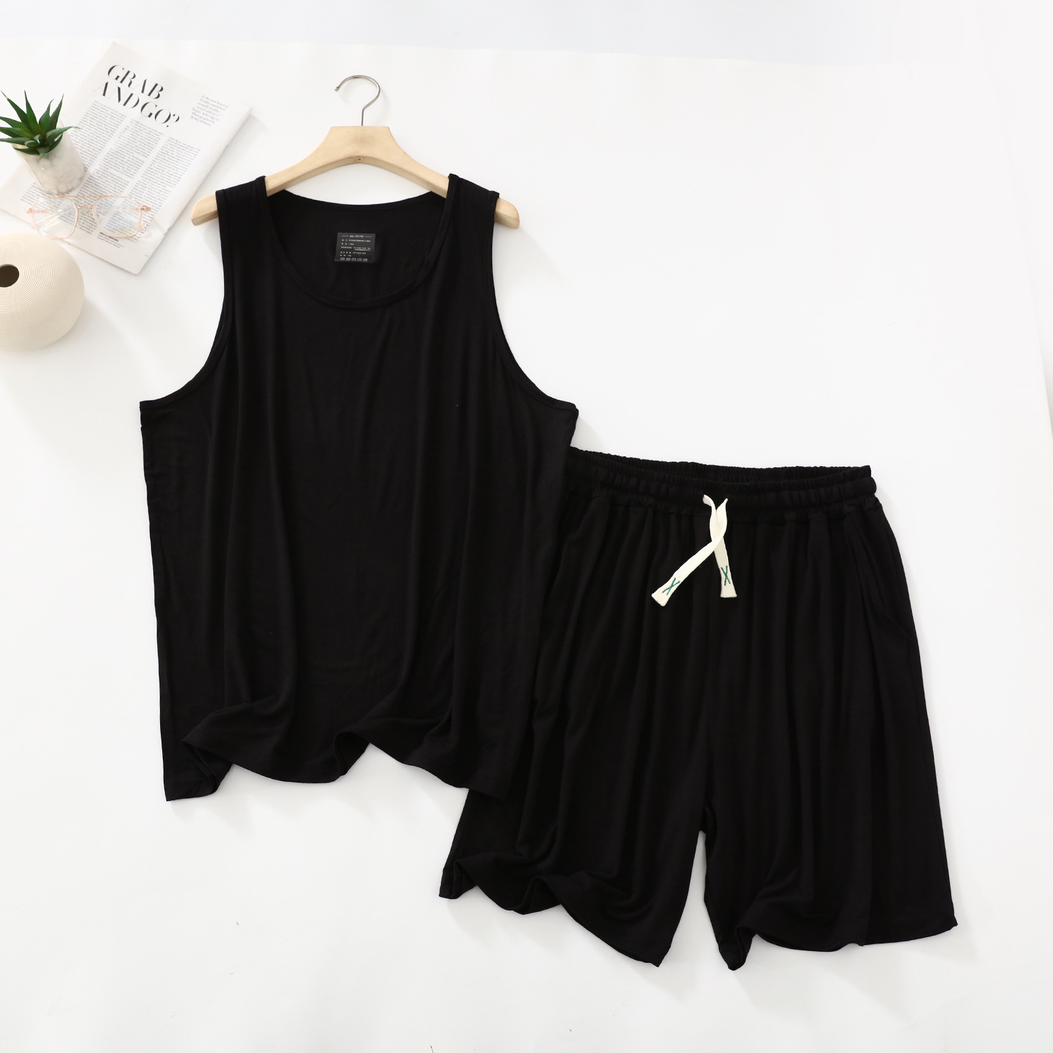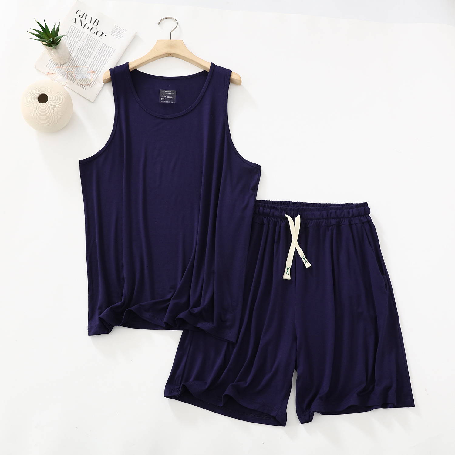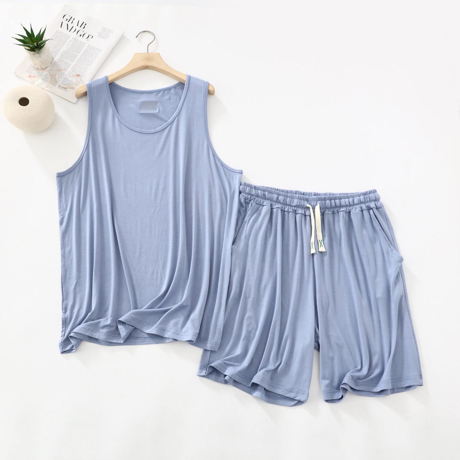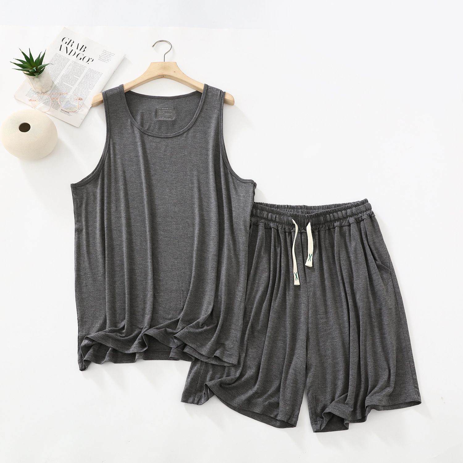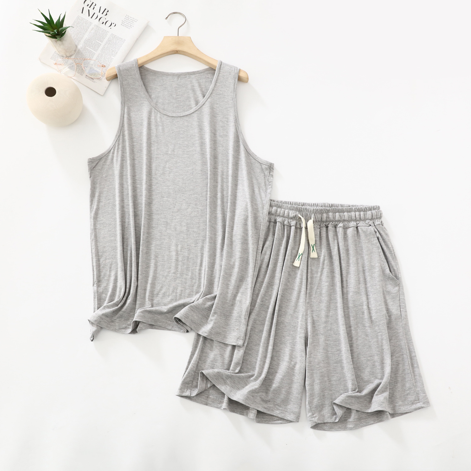 남자의 잠옷 여름 얇은 모달 캐주얼 세트 플러스 사이즈 느슨한 조끼 반바지 라운드 넥 민소매 가정 의류스토어 가기