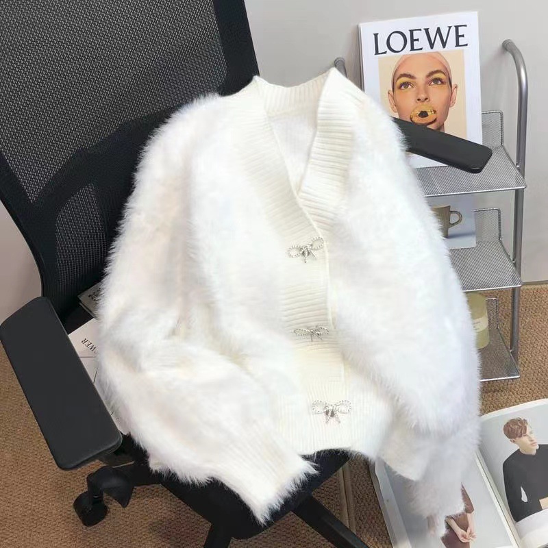 고급 밍크 벨벳 핑크 스웨터 코트 여성의 가을과 겨울 새로운 두꺼운 느슨한 우아한 V-넥 니트 가디건
