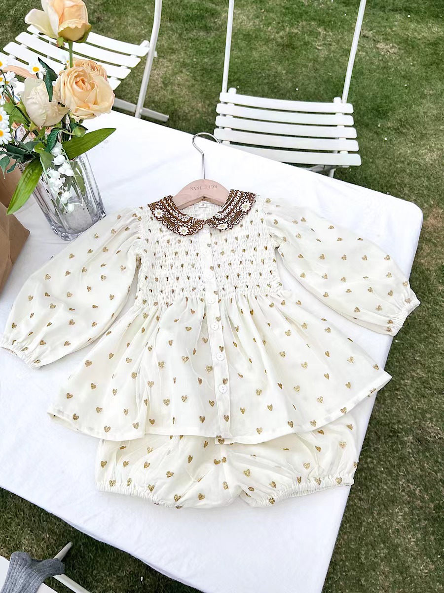 2023 봄과 여름 새로운 세트 메쉬 더블 레이어 셔츠 탑 표면 중공업 자수 브론징 인형 셔츠 반바지 세트