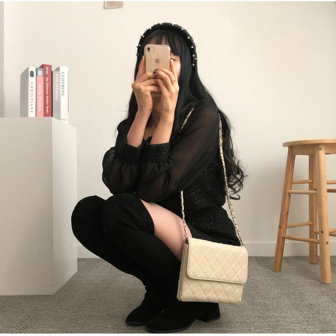 한국 세련된 봄 스퀘어 칼라 싱글 브레스트 버블 슬리브 관점 원사 우아한 우아한 유행 샤넬 스타일 세트 여성스토어 가기