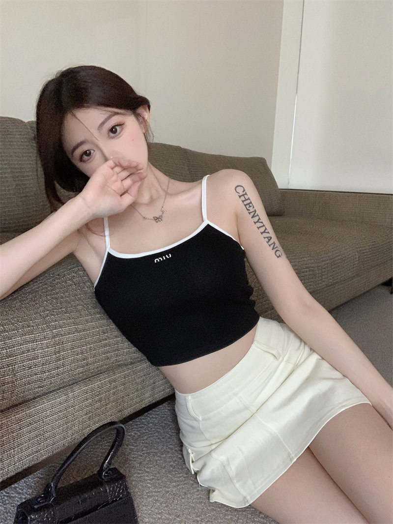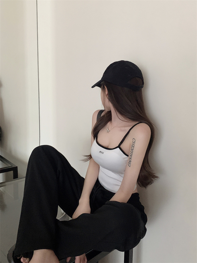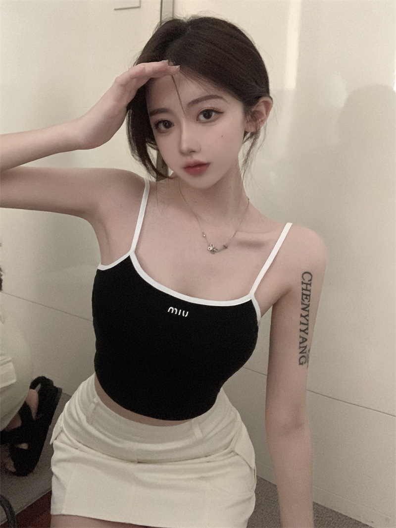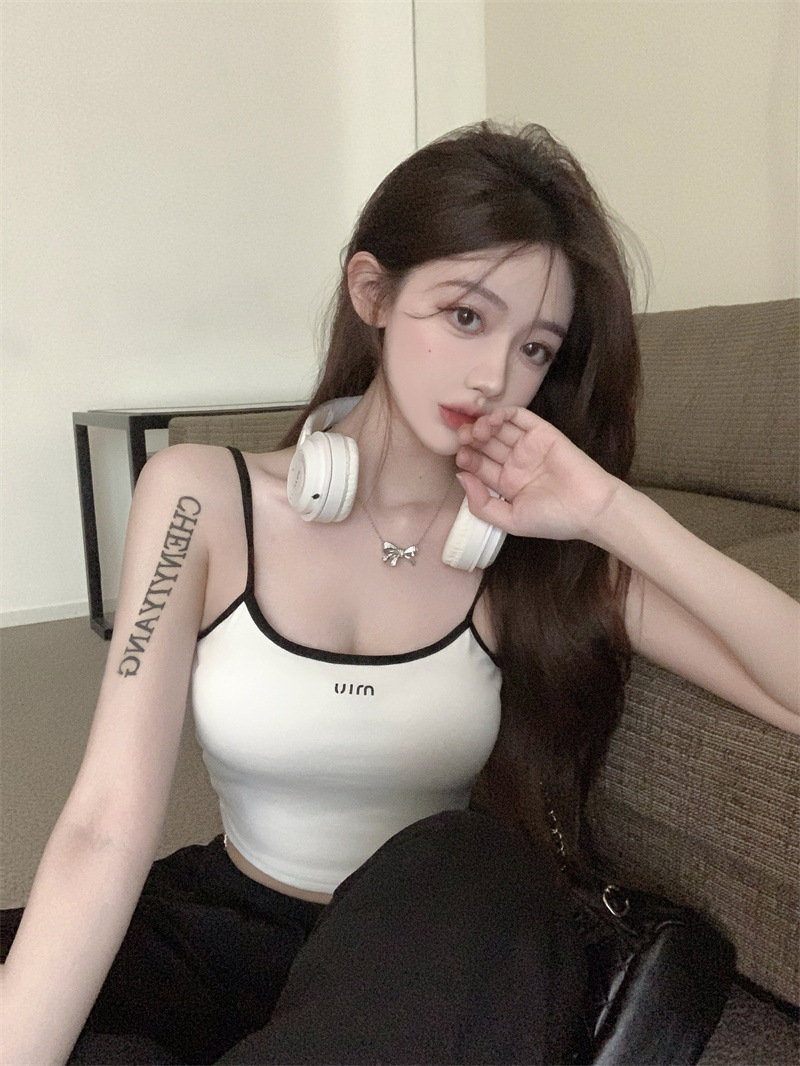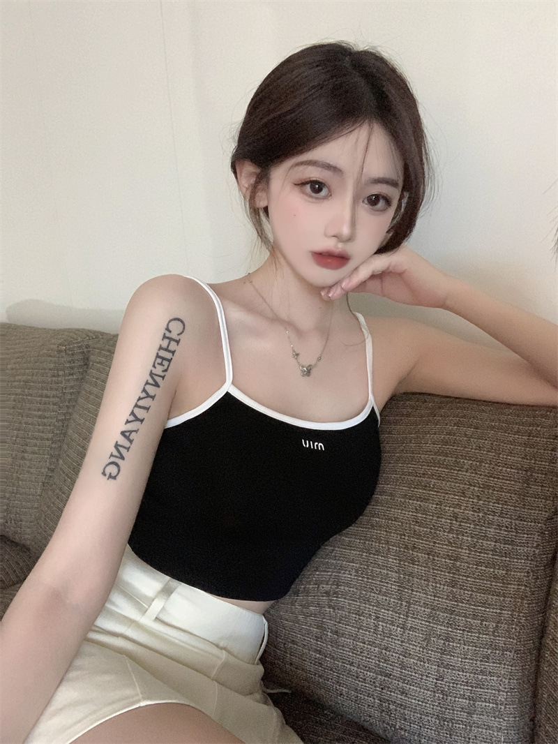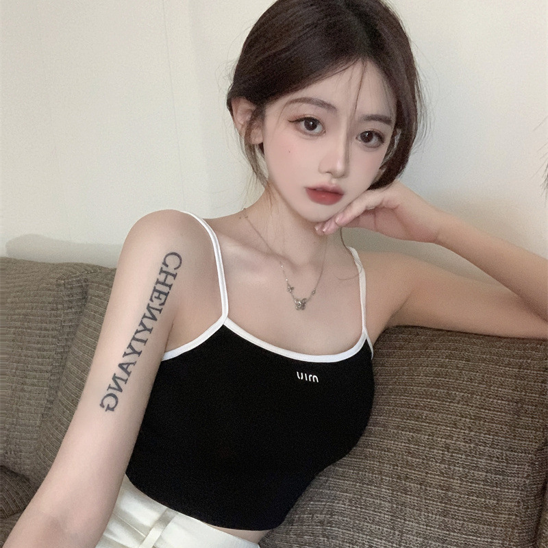 홍콩 스타일 스파이스 걸 대조 색상 캐미솔 여성용 봄 아우터 타이트 레터 프린트 가슴 패드가있는 짧은 내부 탑