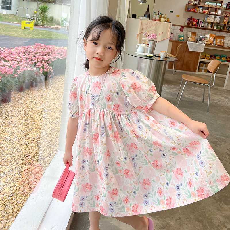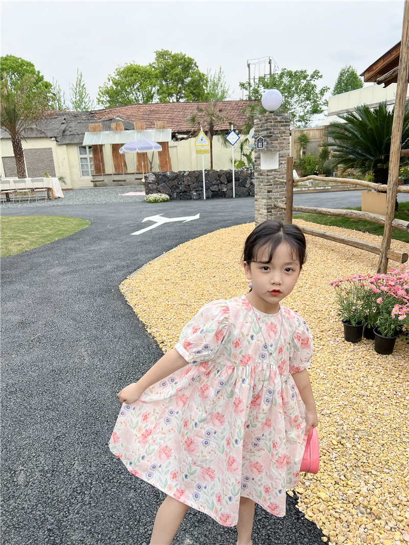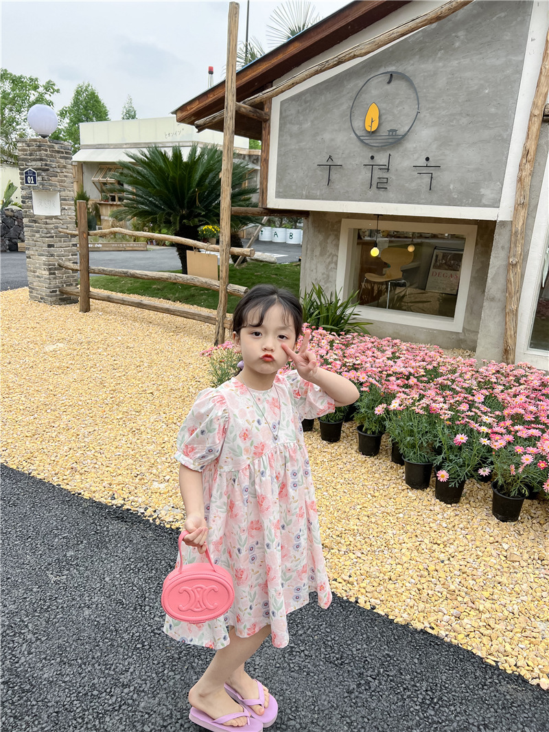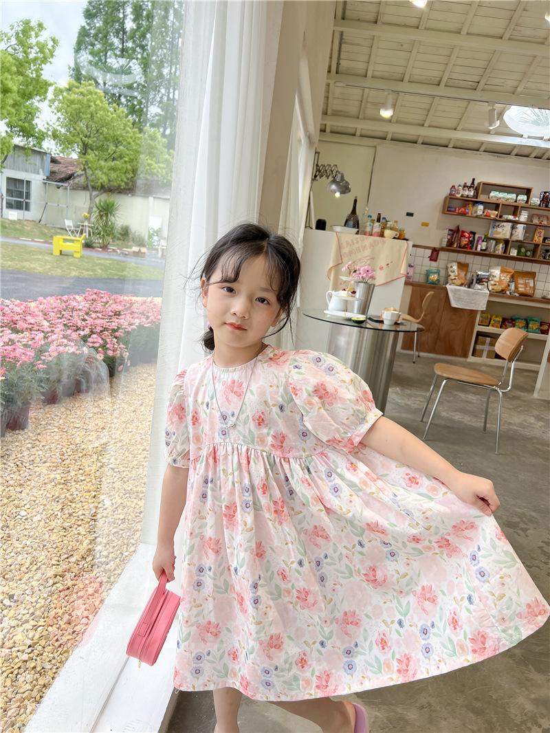 2023 여름 새로운 한국 소녀 핑크 꽃 원피스 외국 스타일 어린이 반팔 치마 Q177B