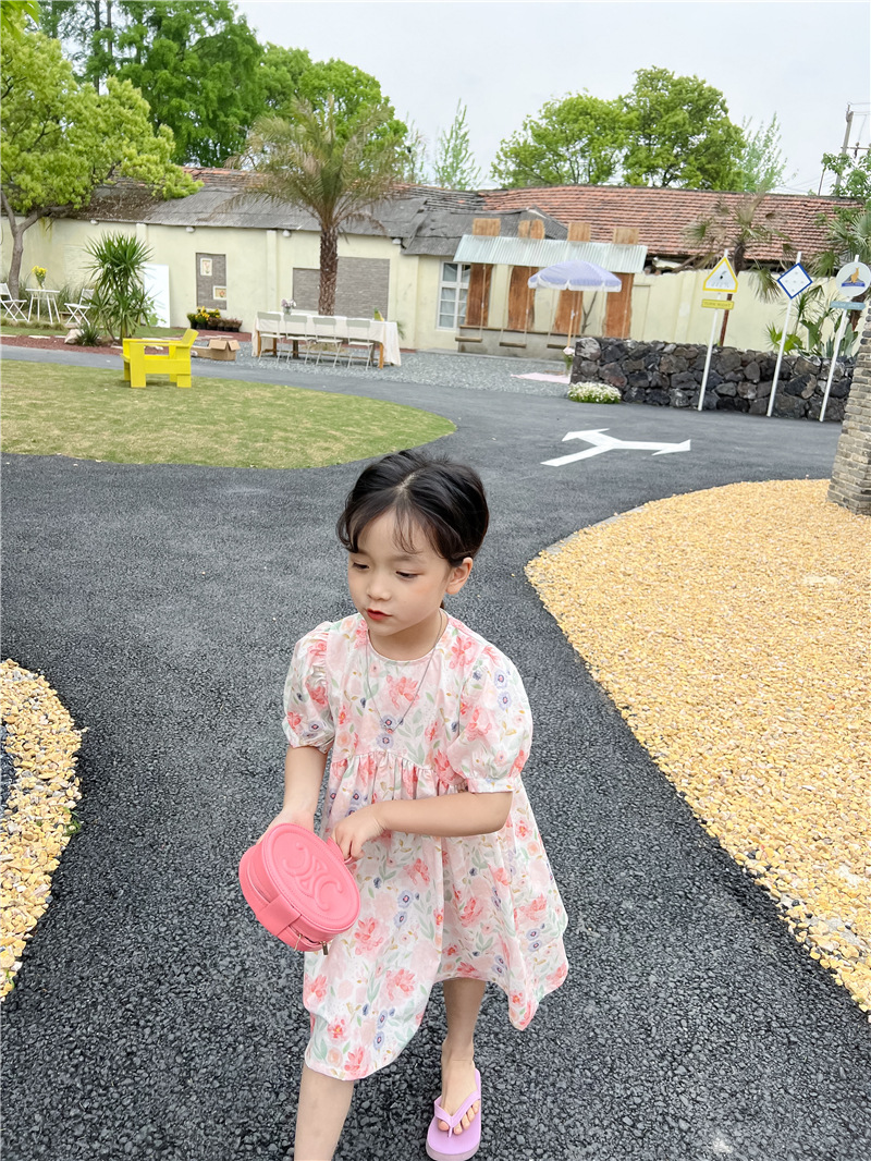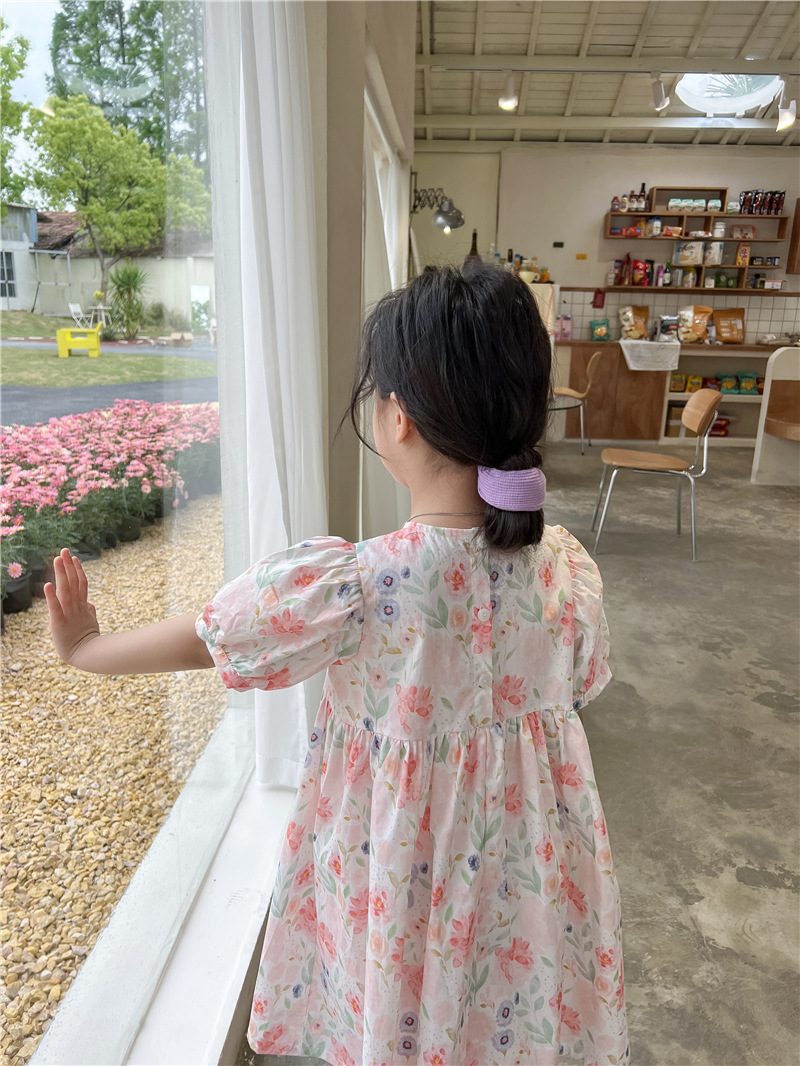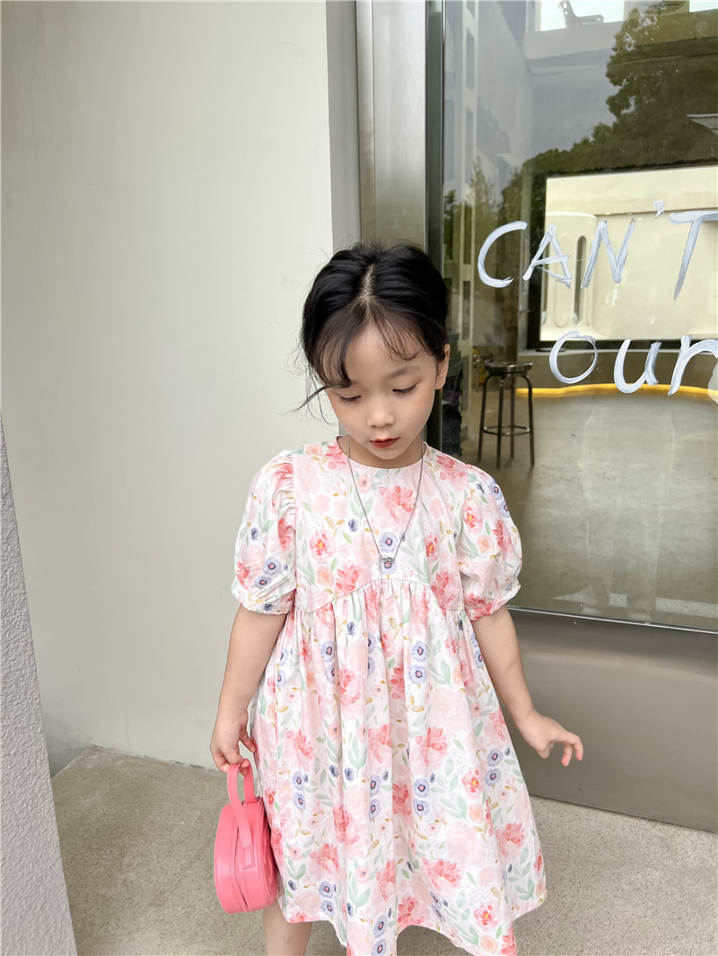 2023 여름 새로운 한국 소녀 핑크 꽃 원피스 외국 스타일 어린이 반팔 치마 Q177B스토어 가기