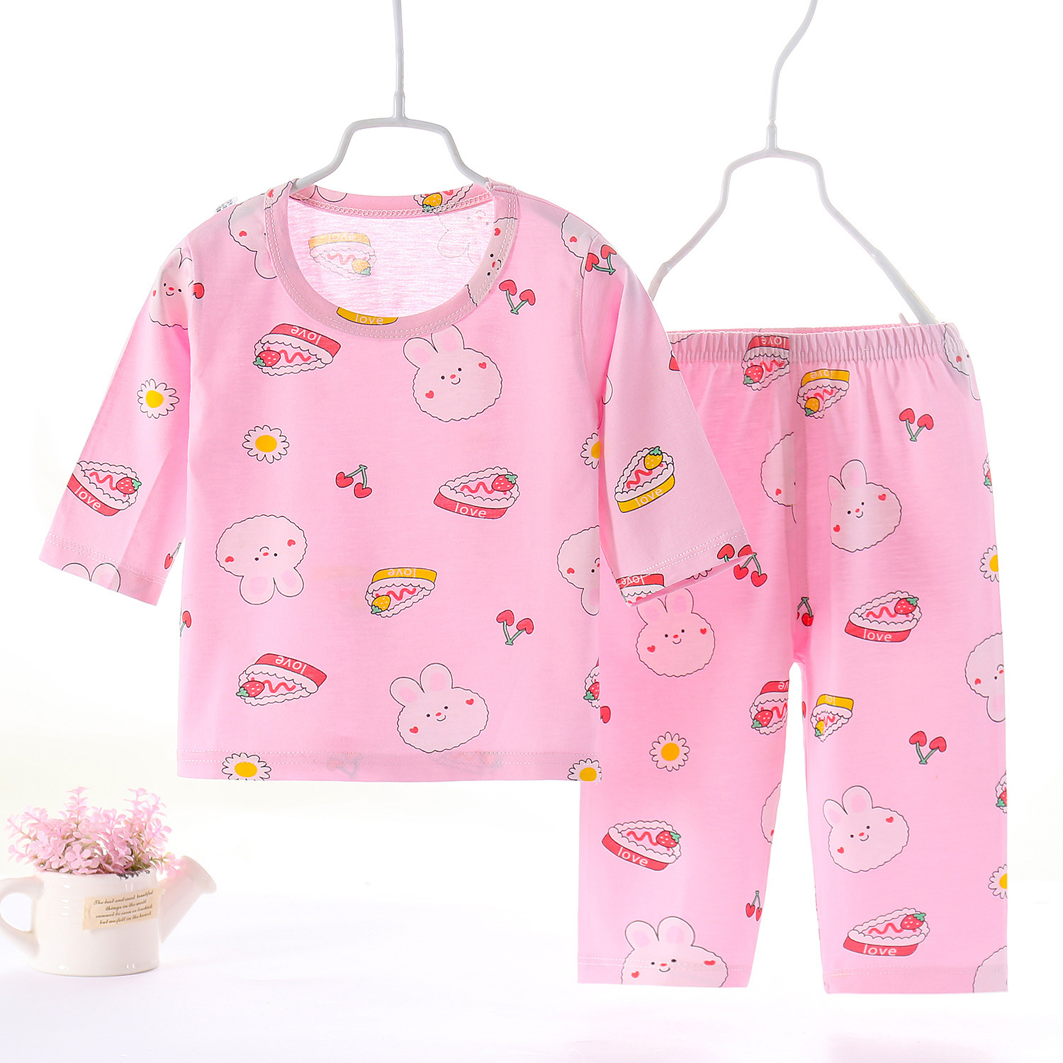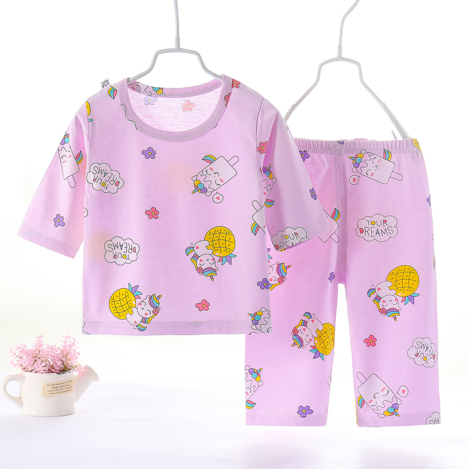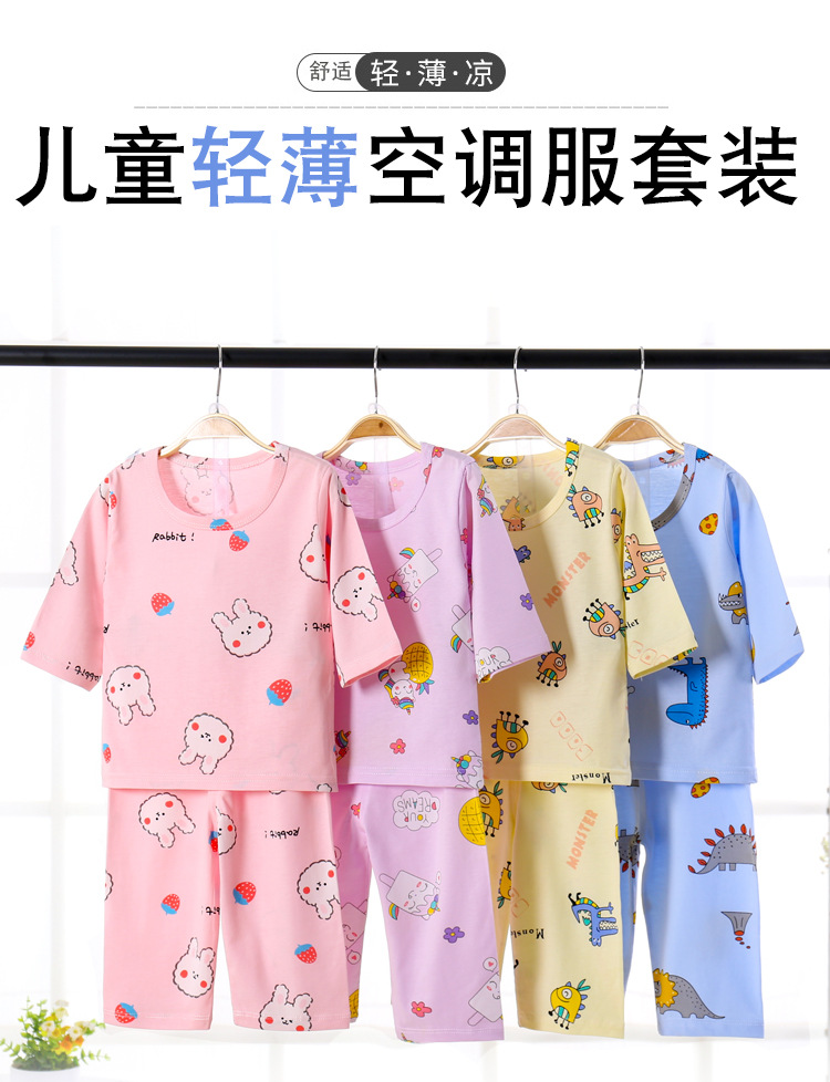 시원한 여름 아이슬란드 어 면 7 소매 바지 세트 중간 긴 소매 중간 긴 바지 소년 소녀 홈 의류 에어컨 의류