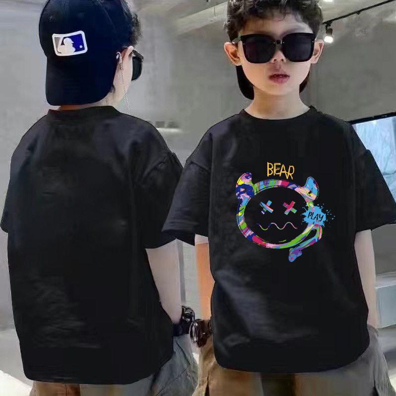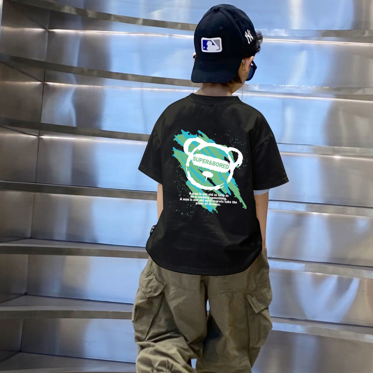 남아 여름 반팔 티셔츠 순면 프린트 반팔 2023 새로운 스타일 중형 어린이 라운드 넥 탑 여름 착용 얇은 배치스토어 가기