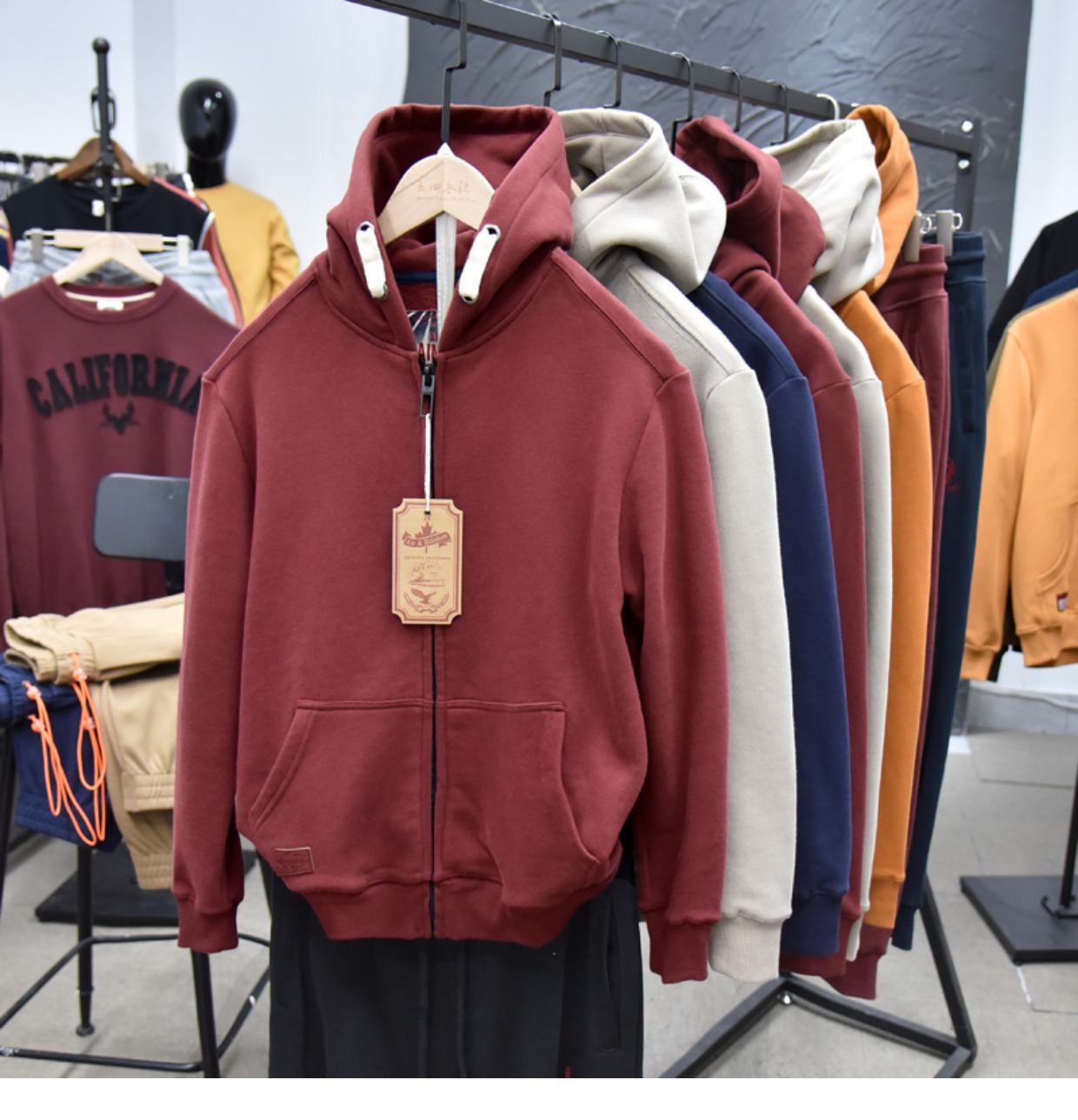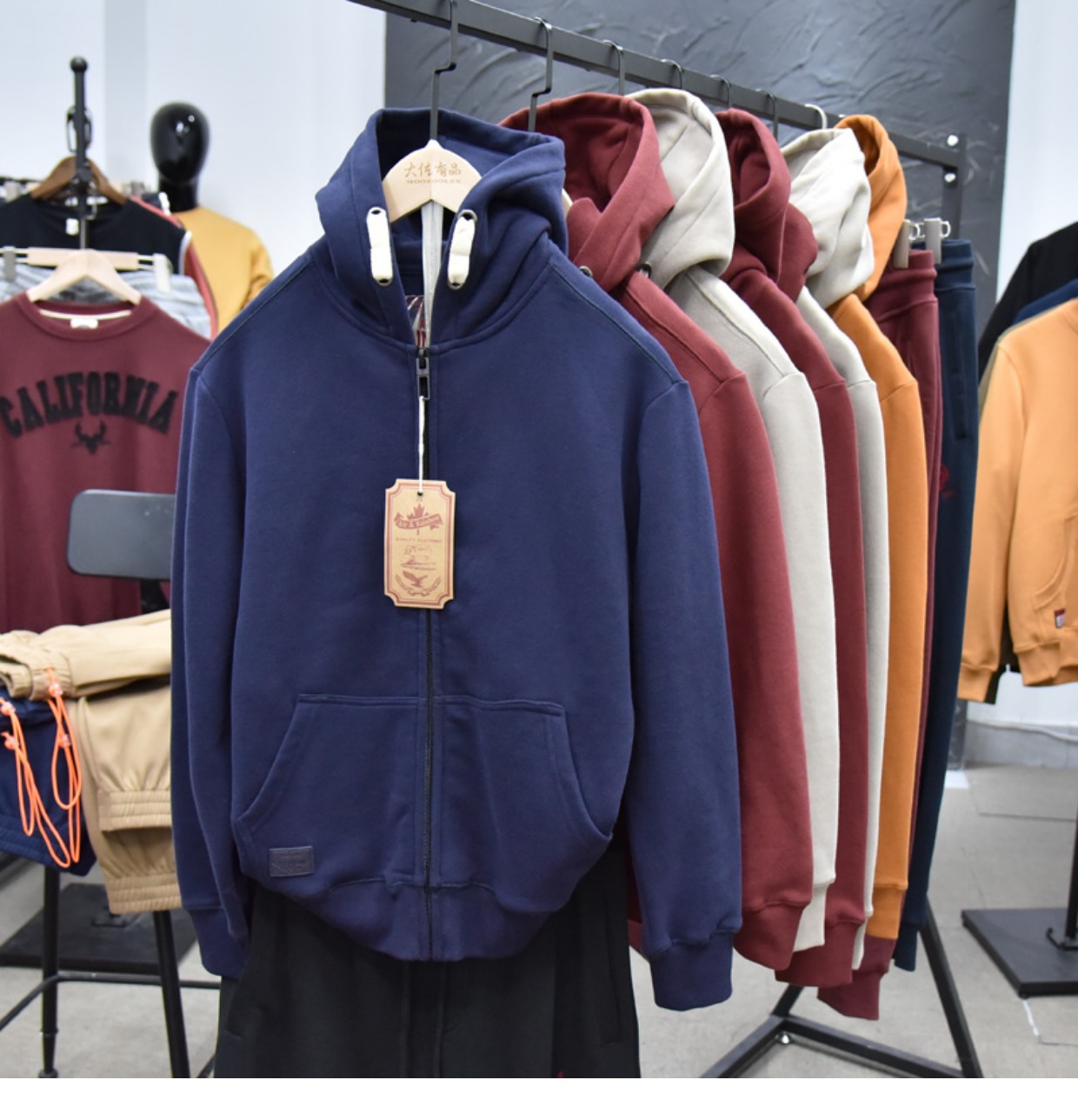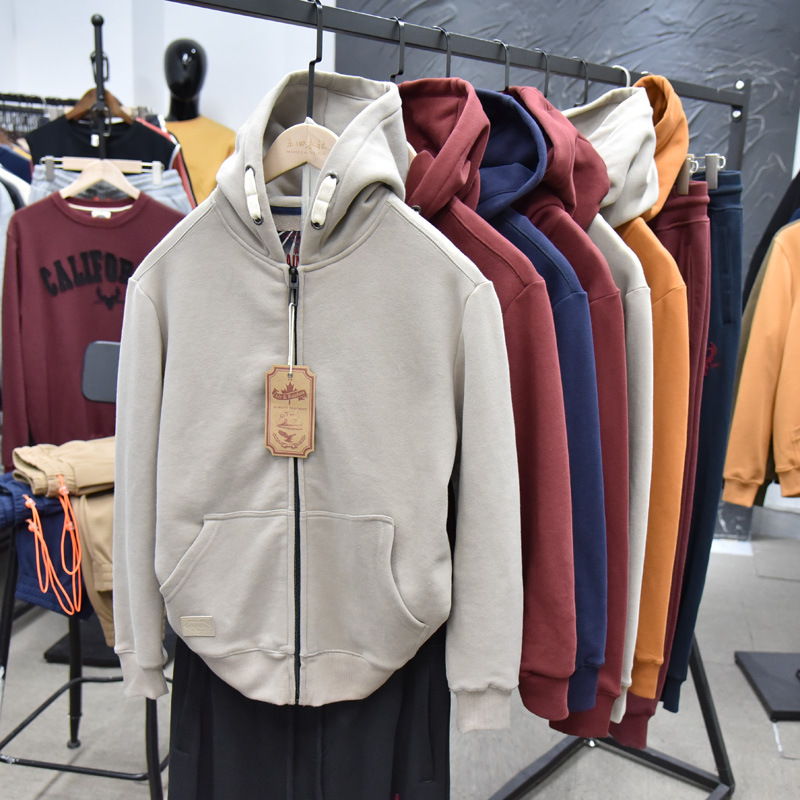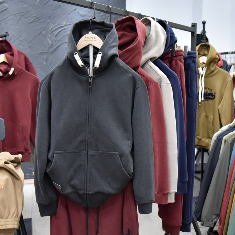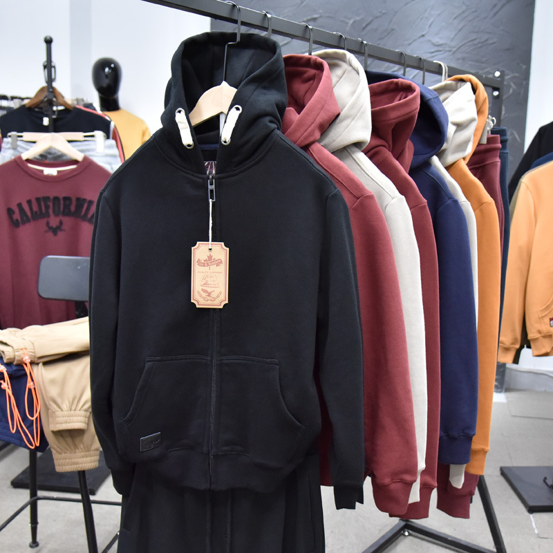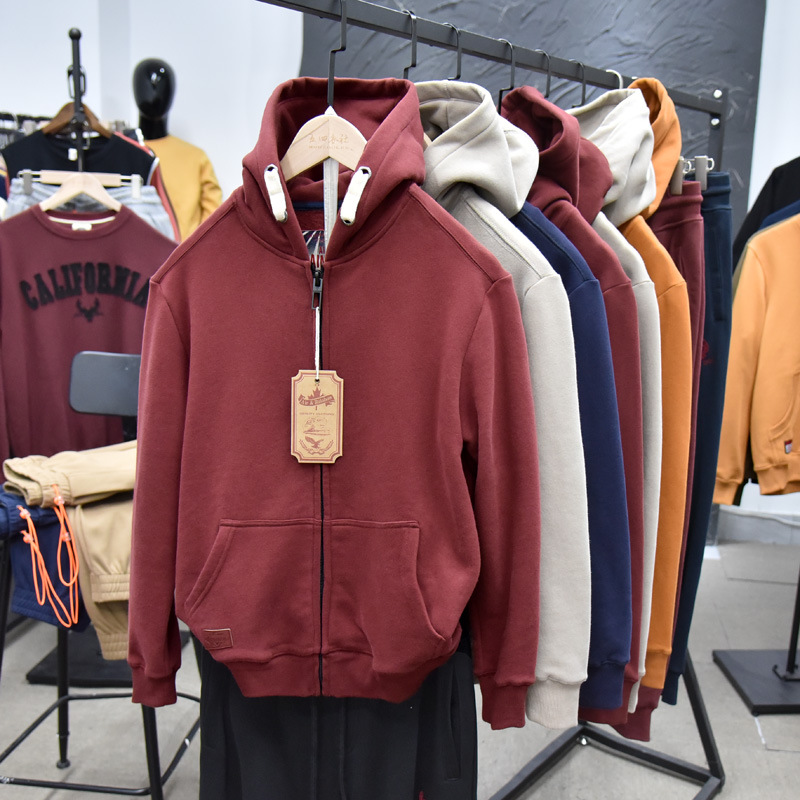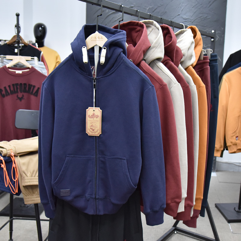 무거운 디자인 감각! 가을과 겨울 샌딩 코튼 기모 후드 스웨트 남성용 루즈 캐주얼 커플 지퍼 재킷스토어 가기
