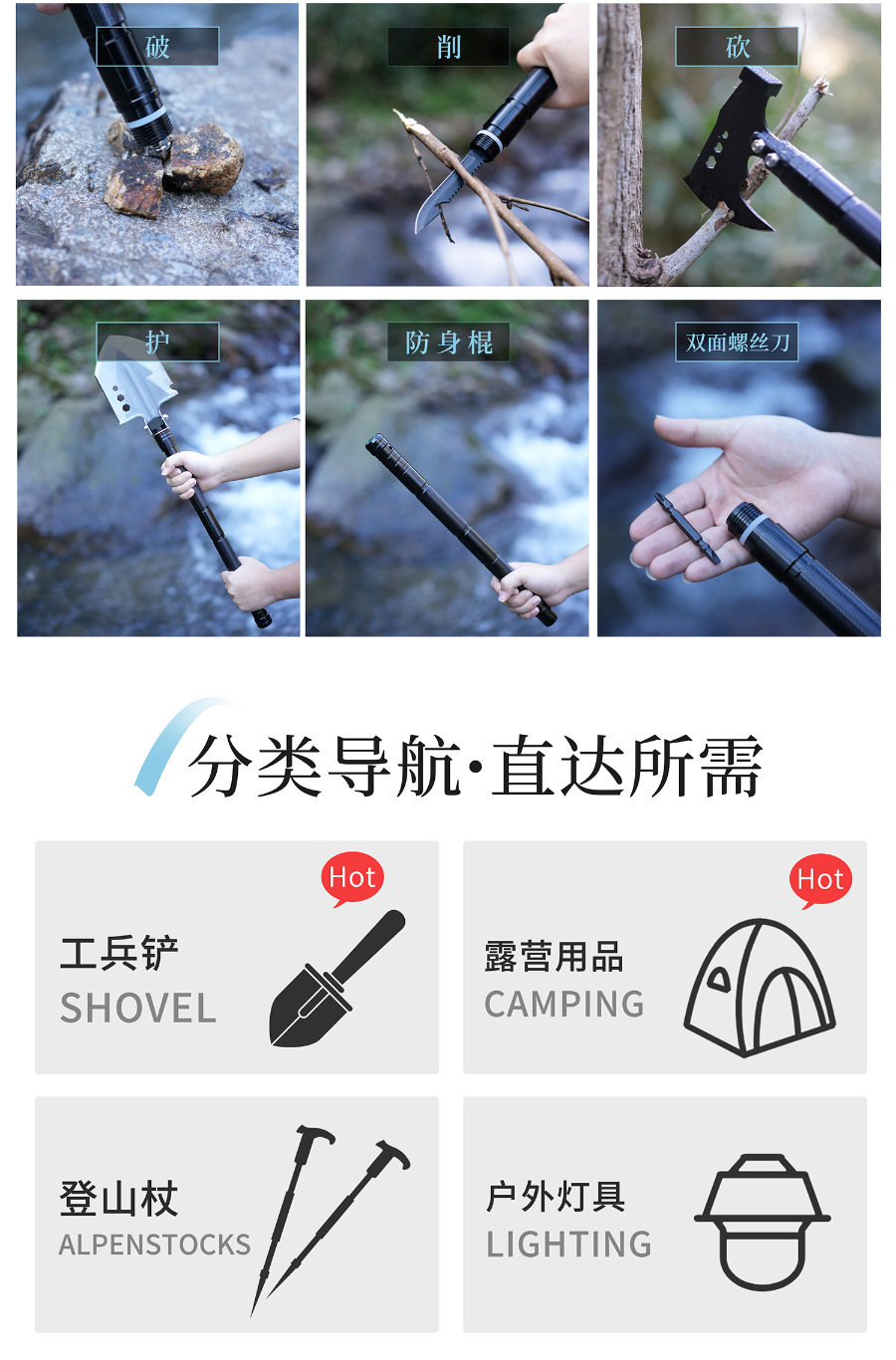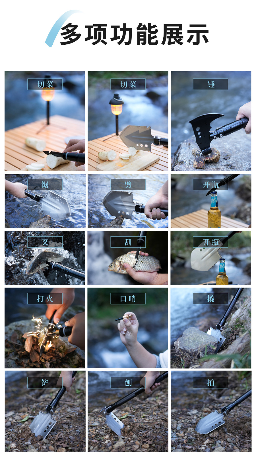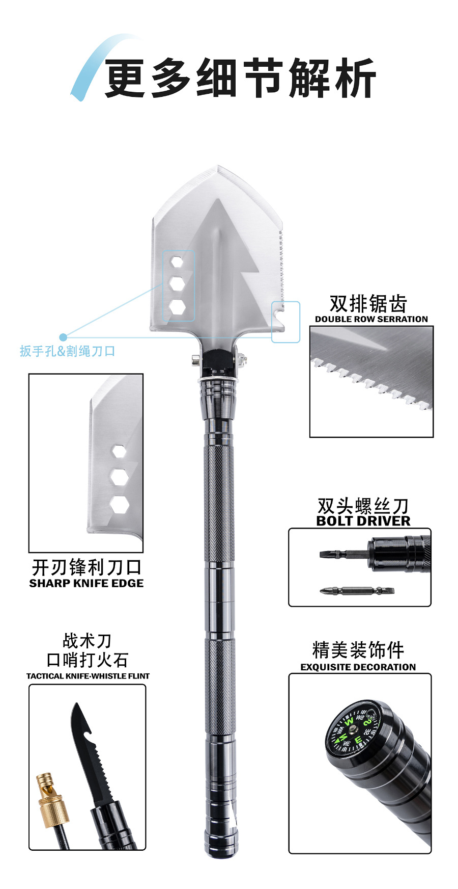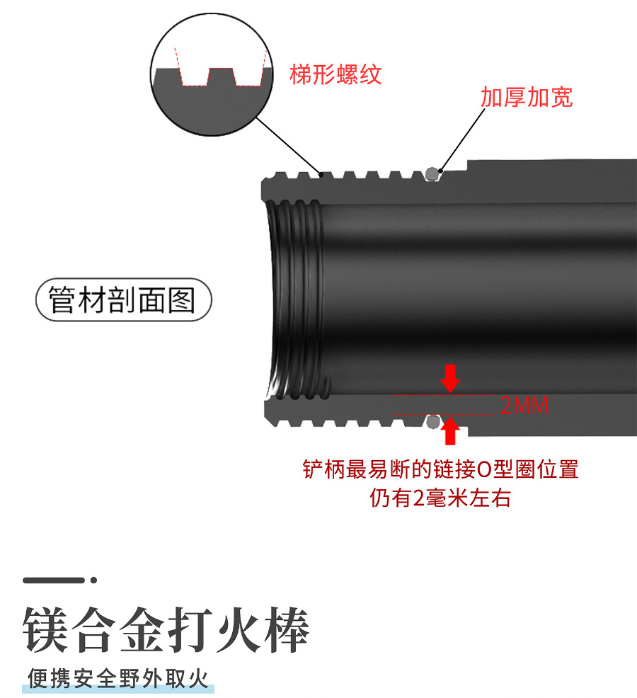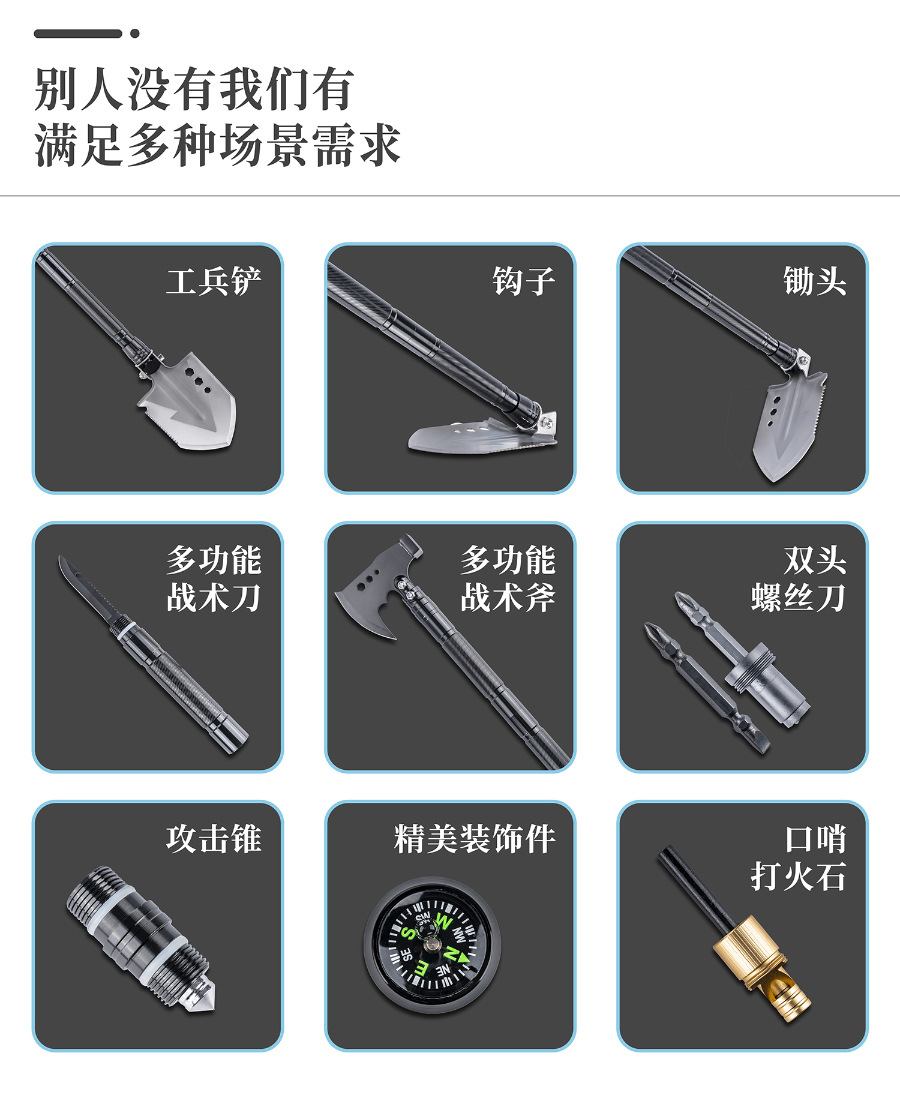 1. 避免误伤:折叠工兵铲的铲头、小刀带刀口,打火石在摩擦时也可能产生高温或火花。使用和收纳过程中,务必注意远离身体,尤其是眼睛、颈部、四肢等部位,防止意外割伤、刺伤或烫伤。