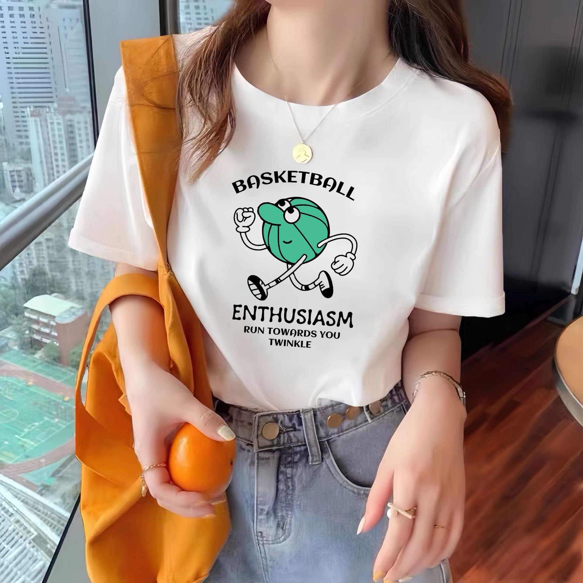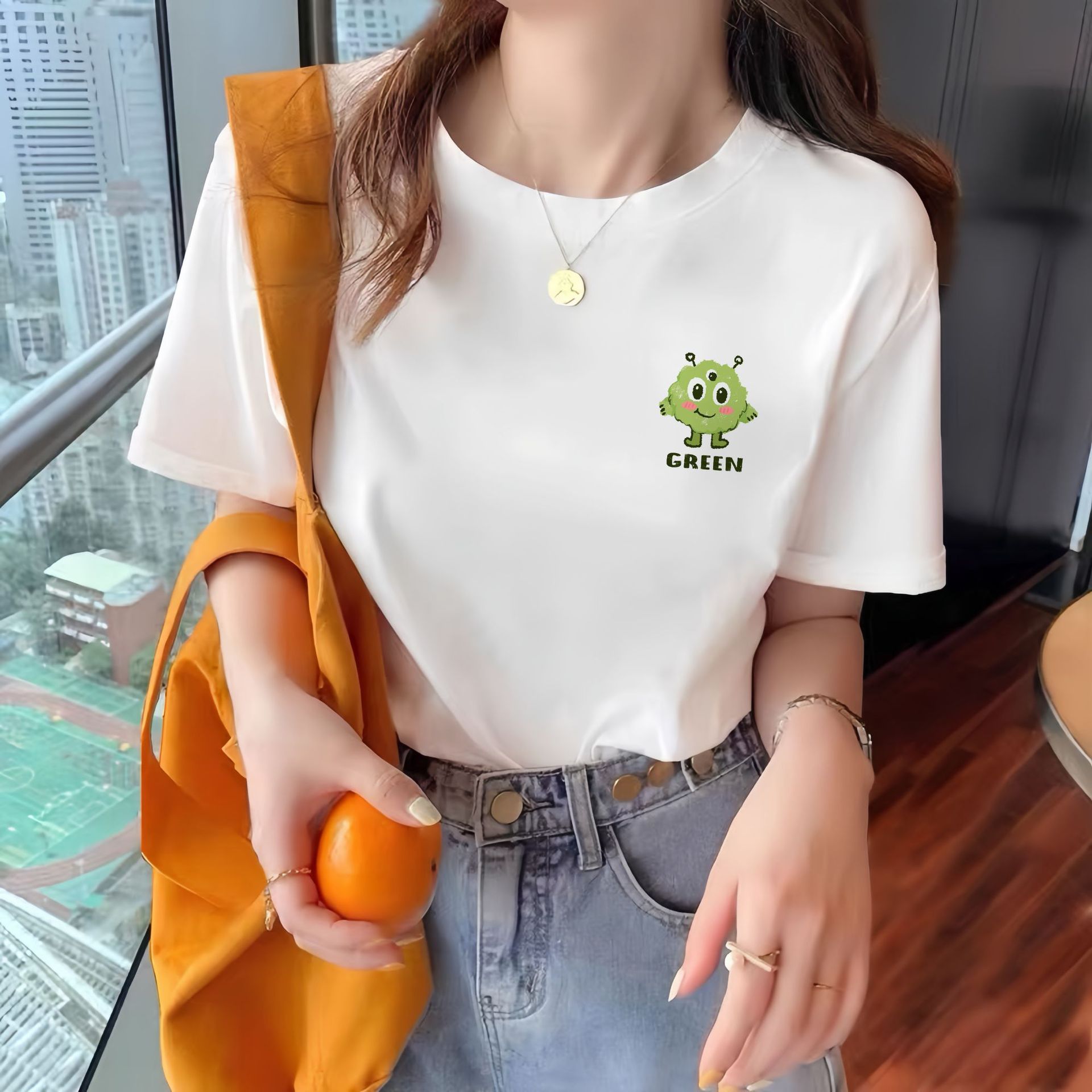 퓨어 코튼 반팔 티셔츠 여성 여름 한국식 루즈 라운드 넥 스타일 인쇄 올매치 하라주쿠 스타일 유행 여성 탑스토어 가기