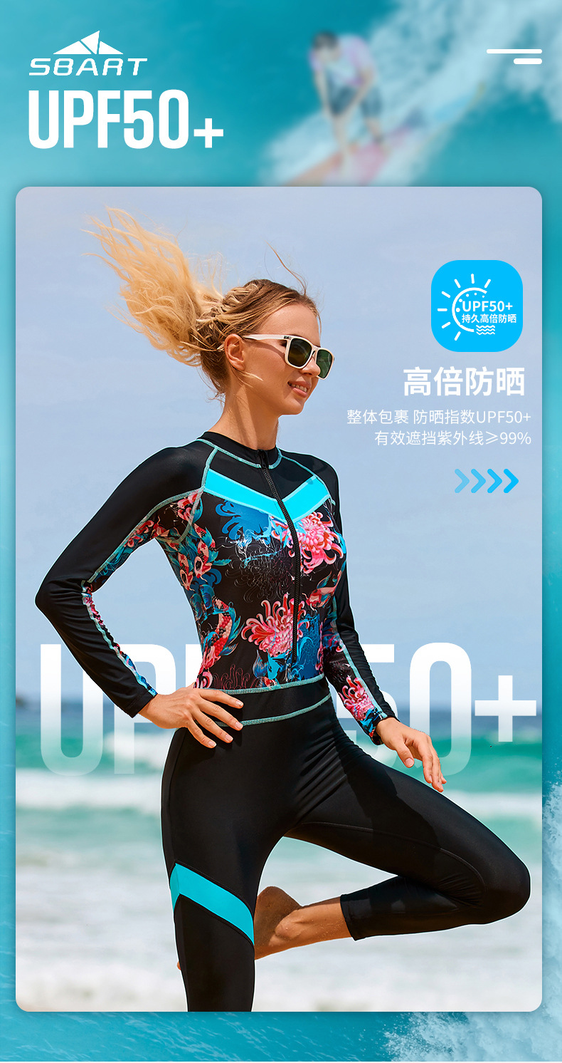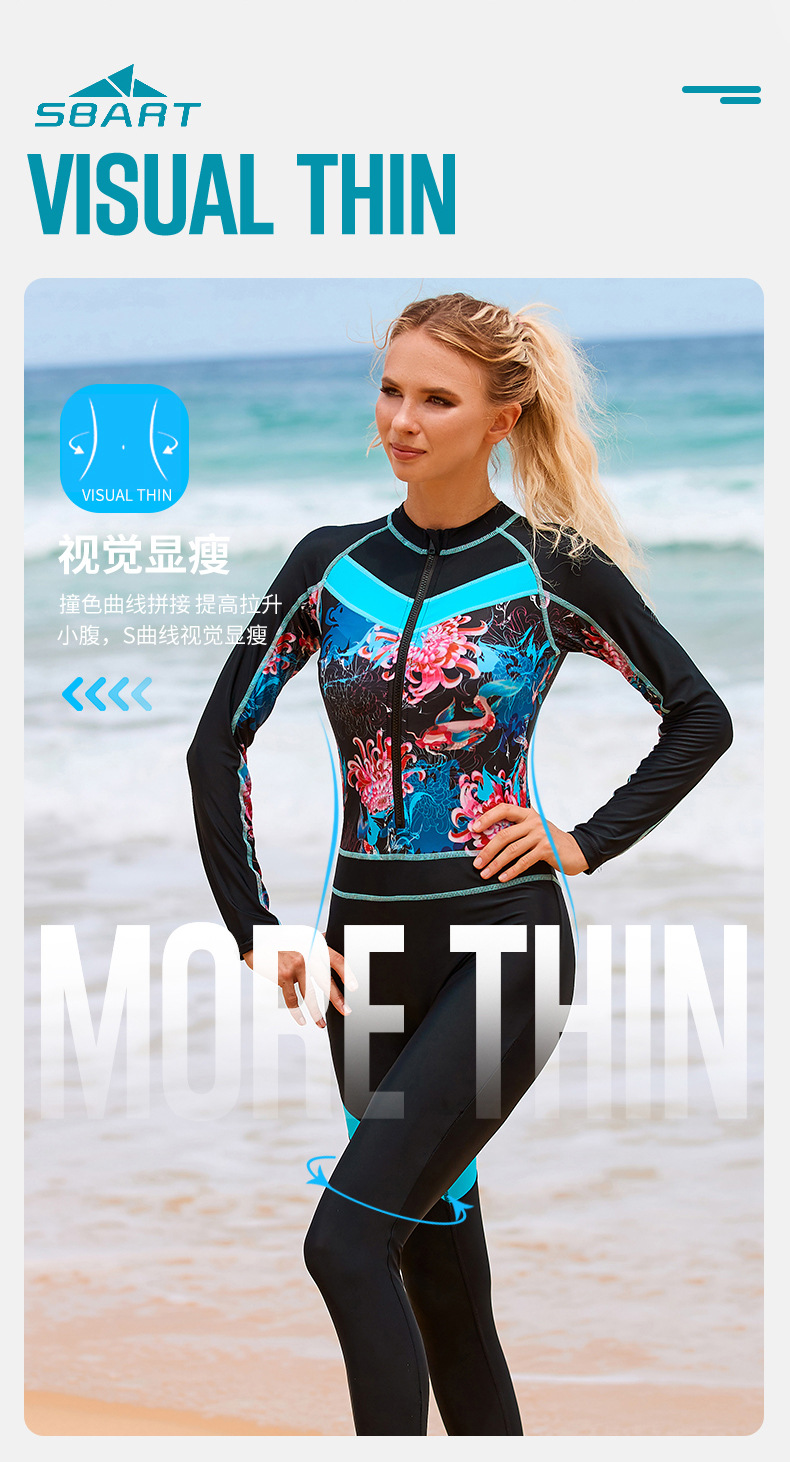 배를 덮고 슬리밍하는 긴팔 프린트 온천 수영복, 여성용 자외선 차단 속건 서핑 슈트, 스노클링 여성용 원피스 수영복