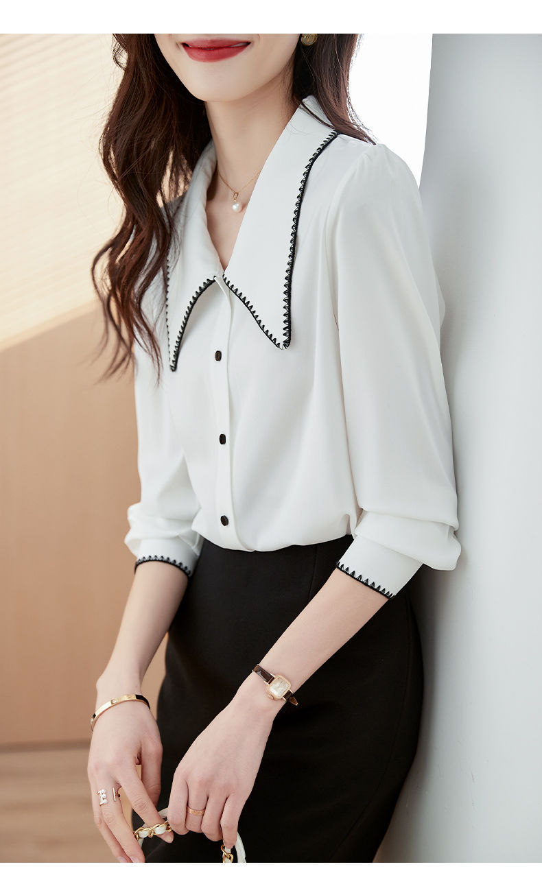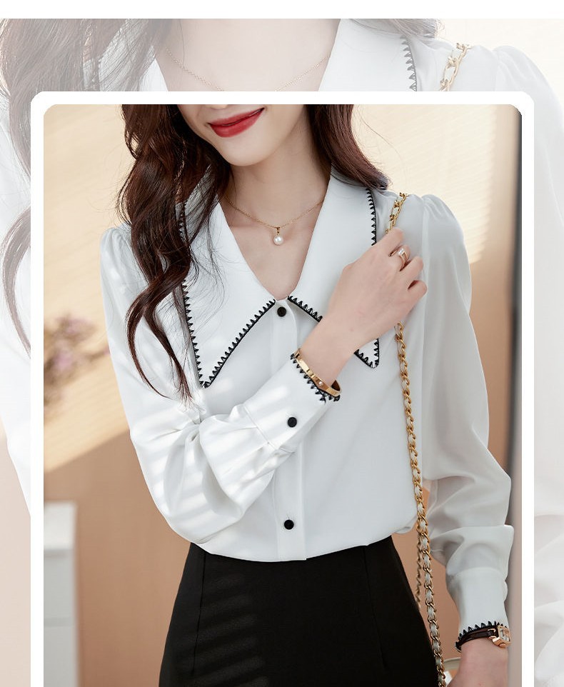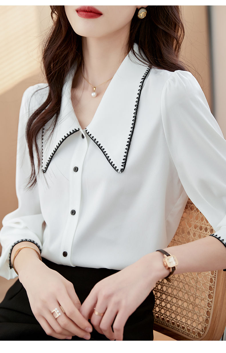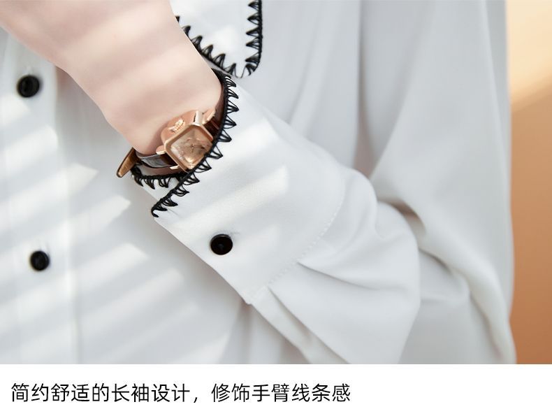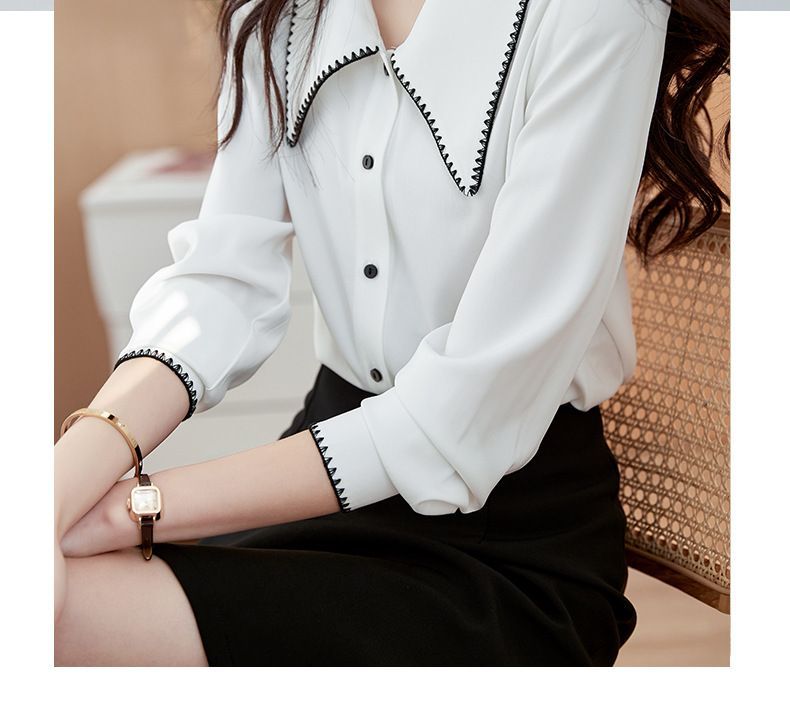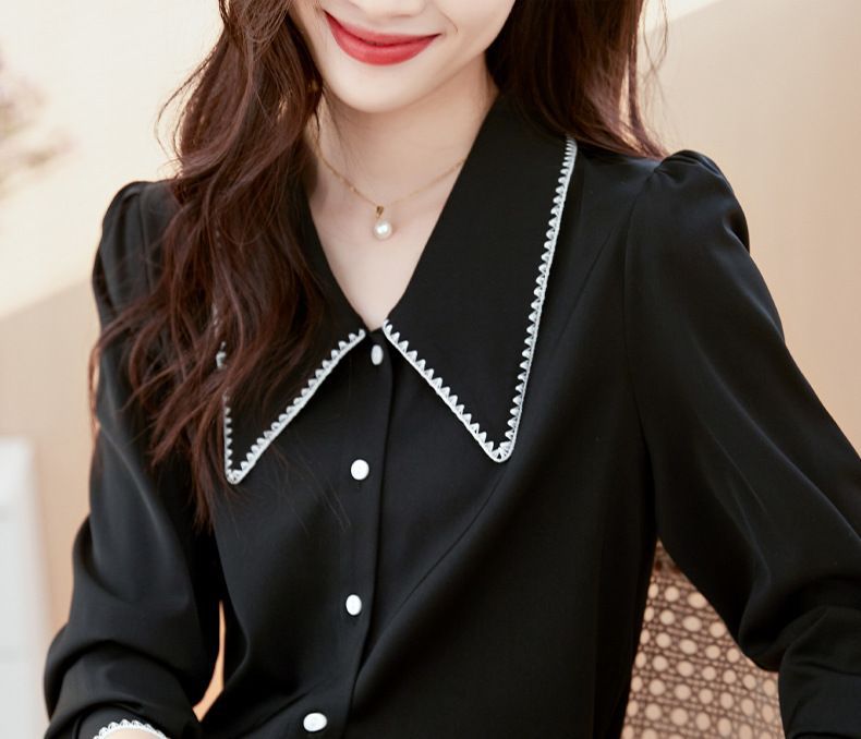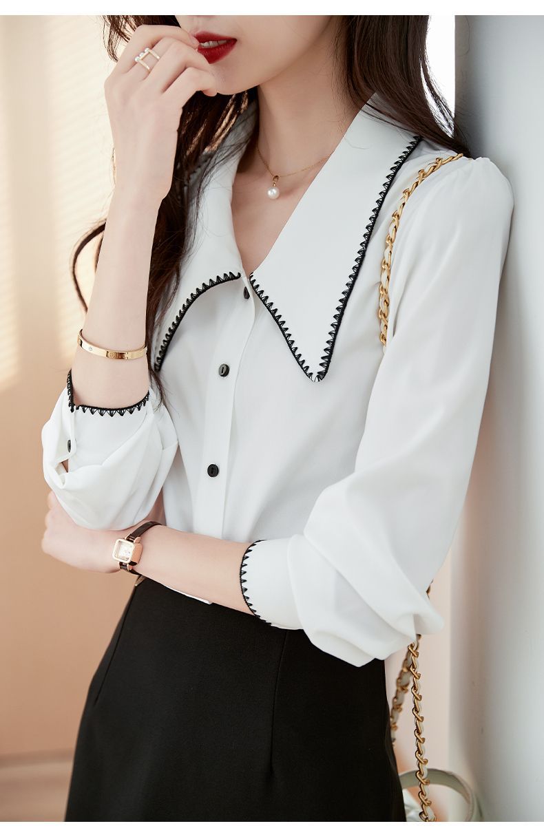 초봄 의류 2023 신상 긴팔 인형 칼라 쉬폰 셔츠 여성용 독특한 상의 예쁘고 세련된 단색 셔츠스토어 가기