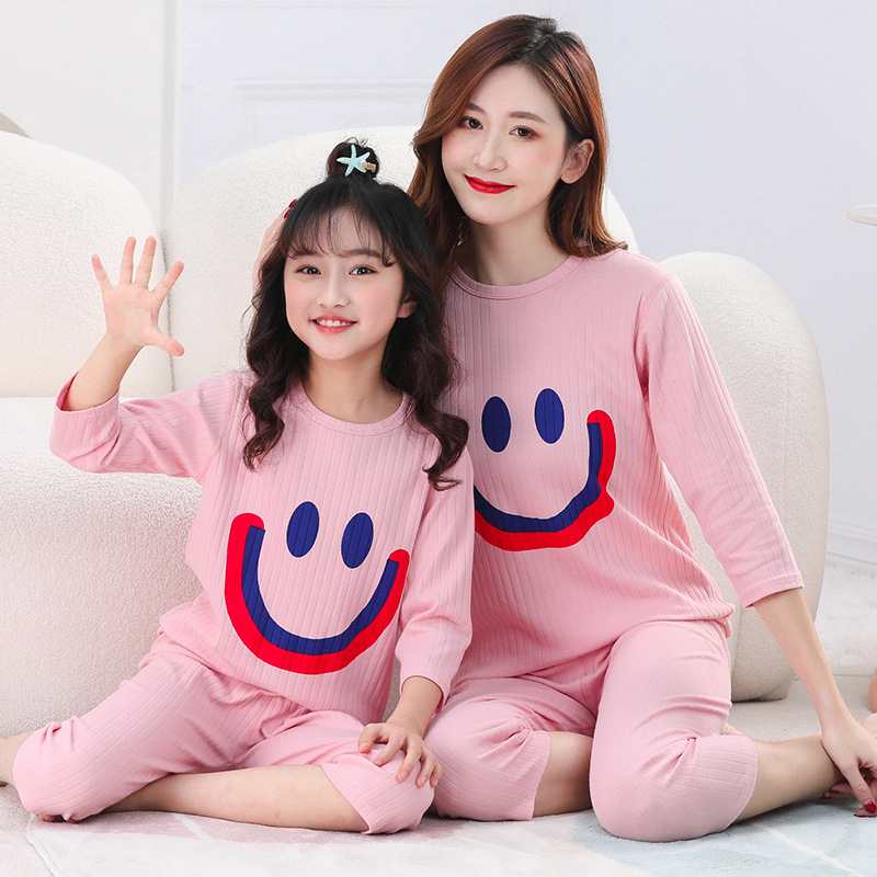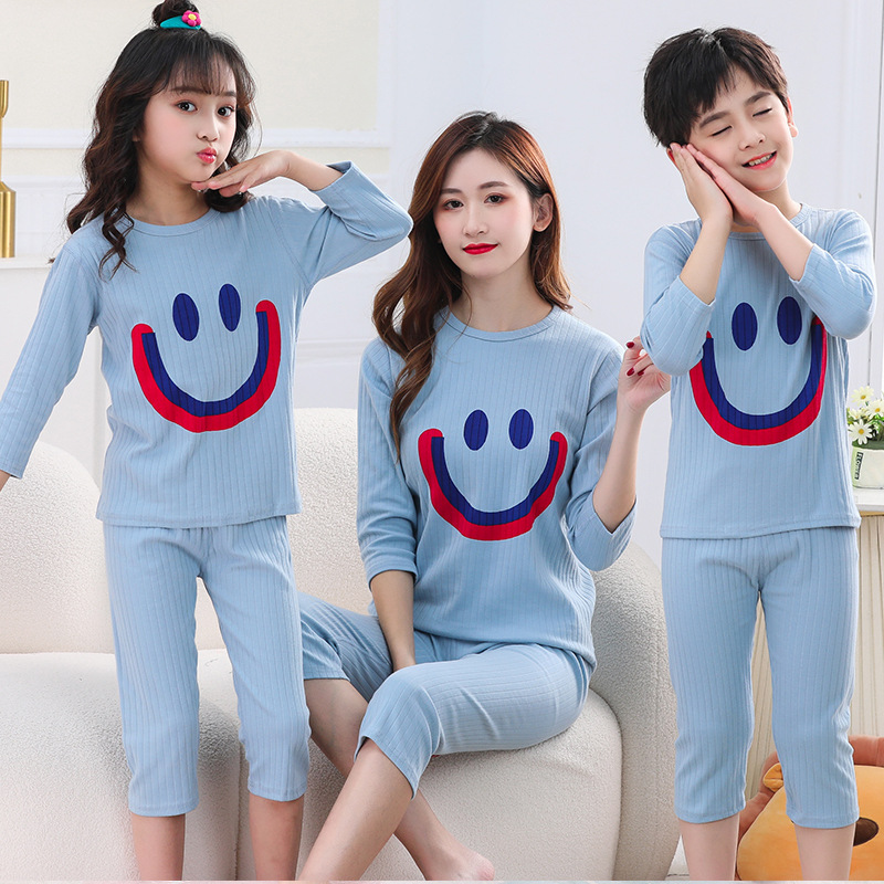 2023 가족 의류 봄과 여름 자른 소매 자른 바지 소년 소녀 스마일 인쇄 면 에어컨 의류 가정 의류 세트스토어 가기