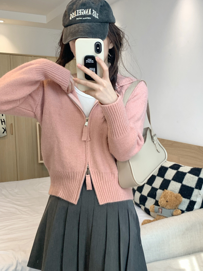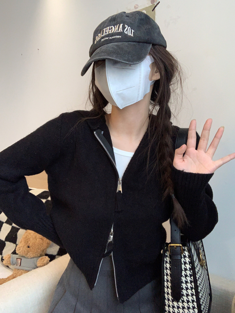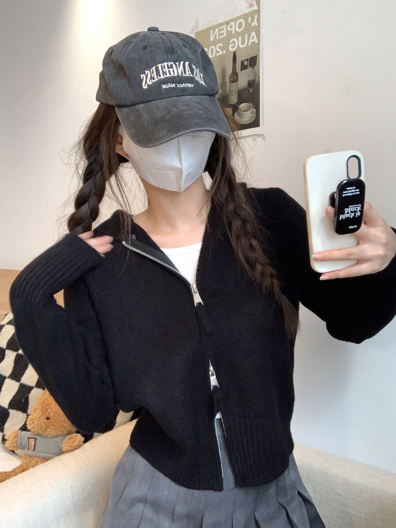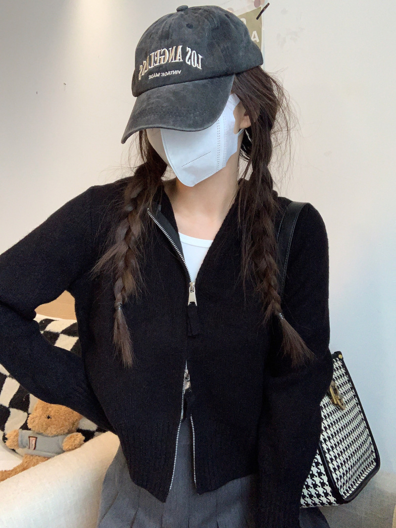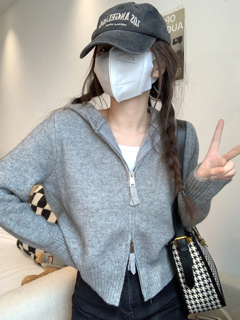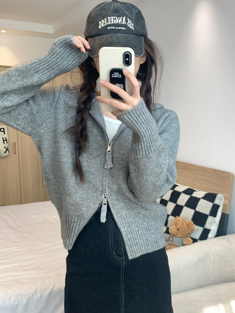 순수한 매력의 회색 긴팔 니트 가디건 여성용 가을 2025 신상 더블 지퍼 슬림핏 숏탑스토어 가기