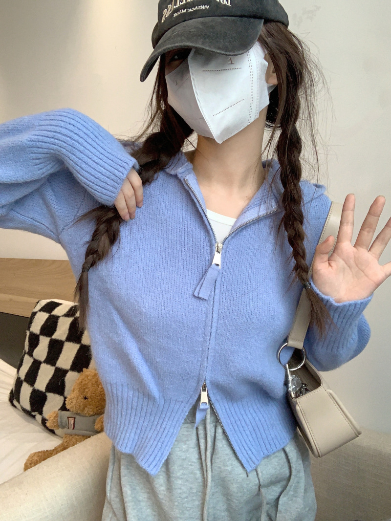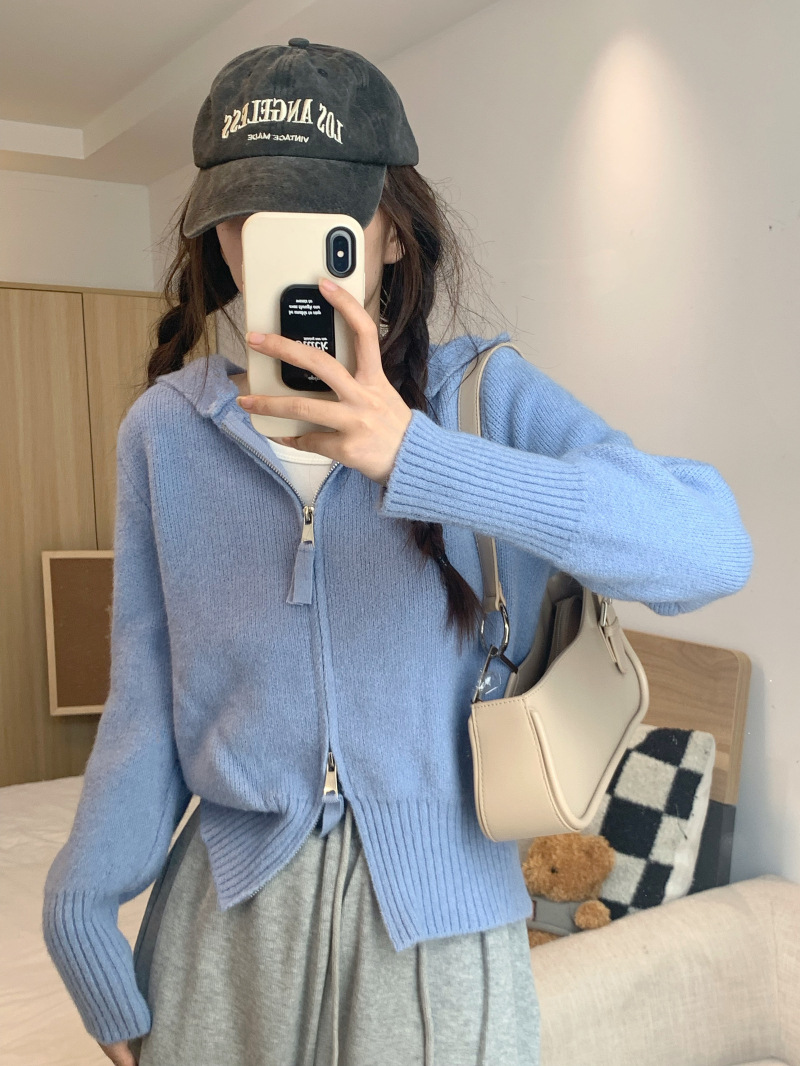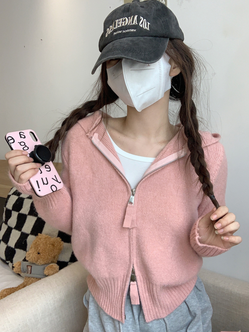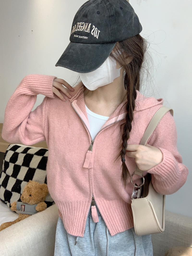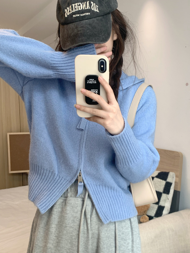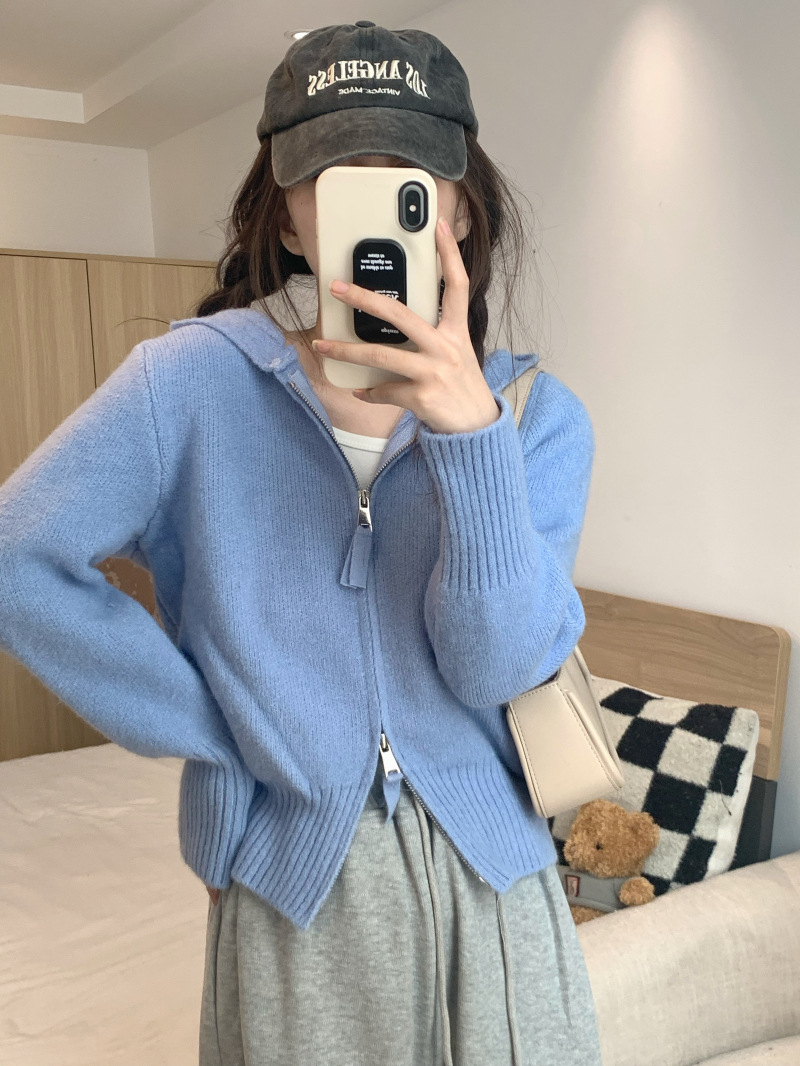 순수한 매력의 회색 긴팔 니트 가디건 여성용 가을 2025 신상 더블 지퍼 슬림핏 숏탑스토어 가기