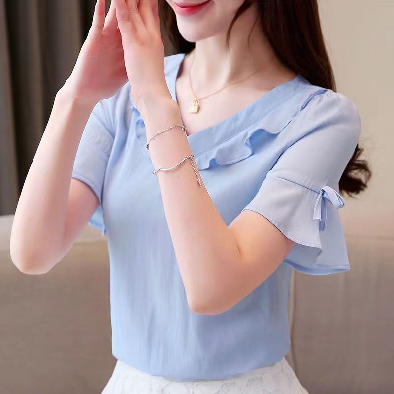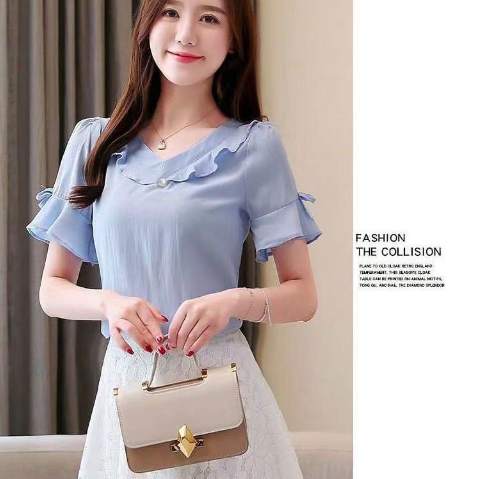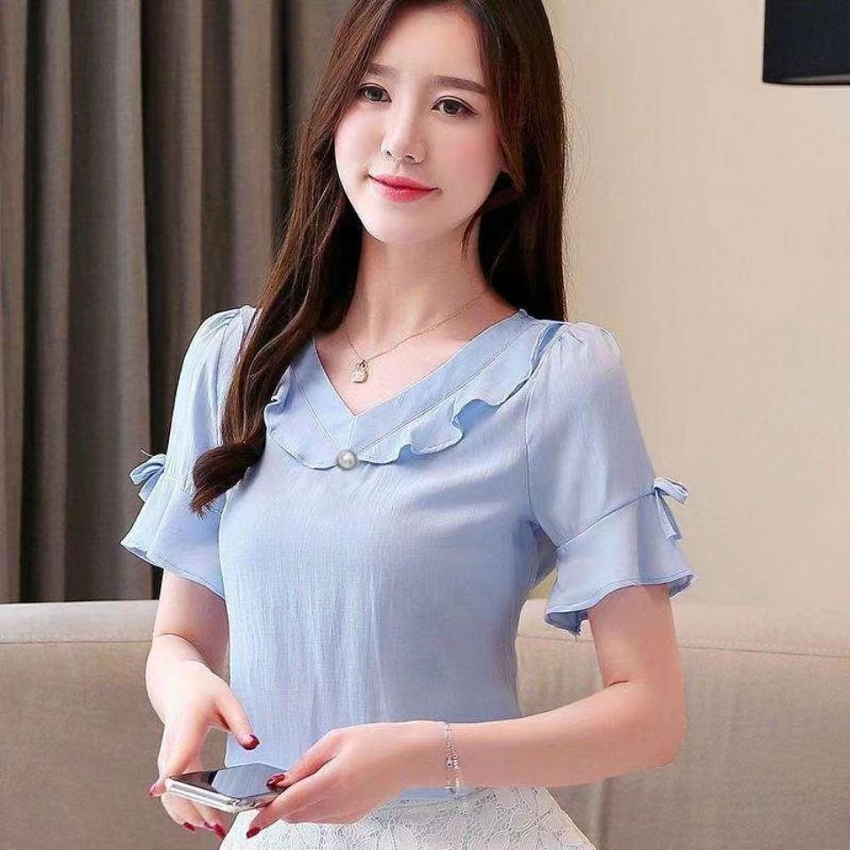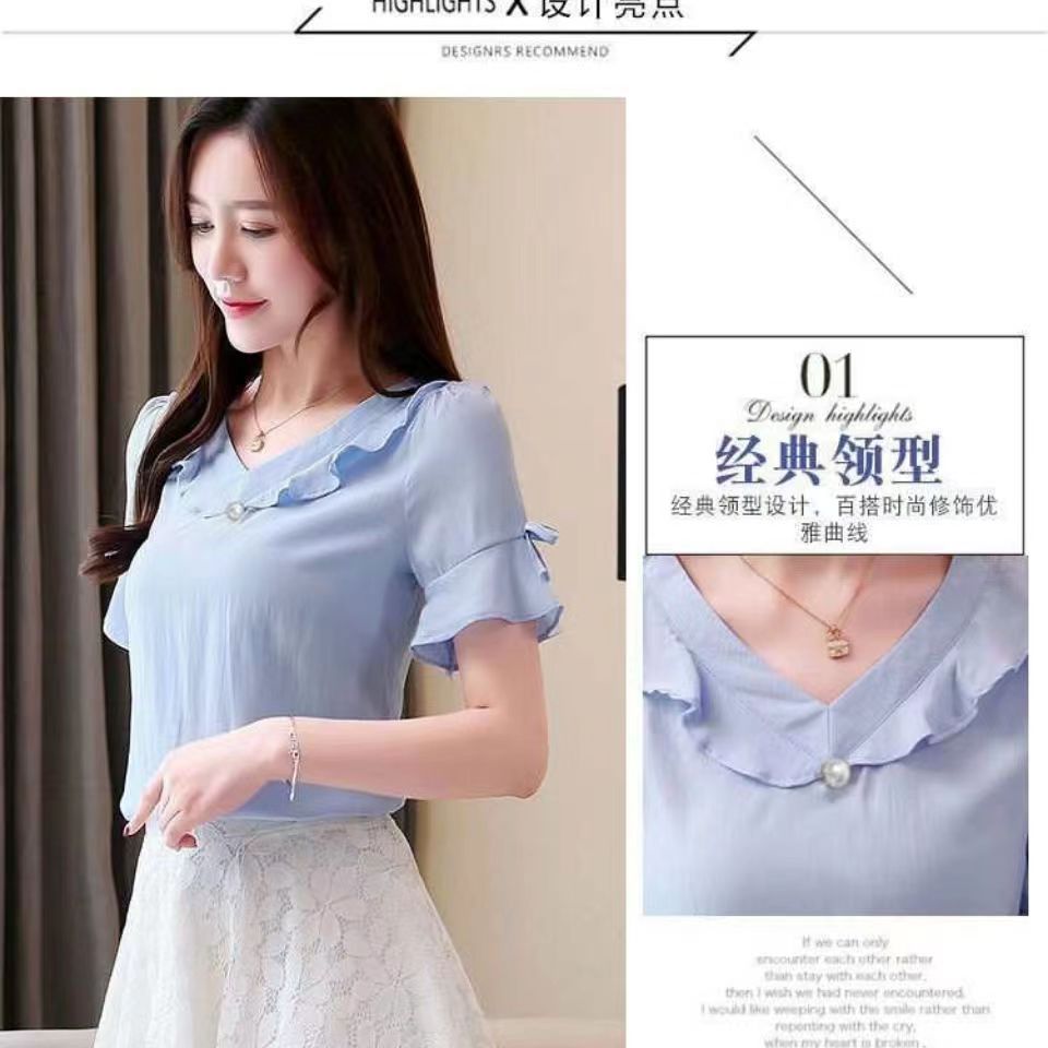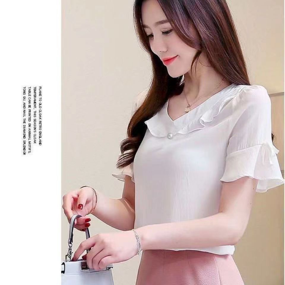 새로운 반팔 셔츠 달콤한 플러스 사이즈 느슨한 쉬폰 셔츠 여성 최고의 서양식 올 매치 티셔츠