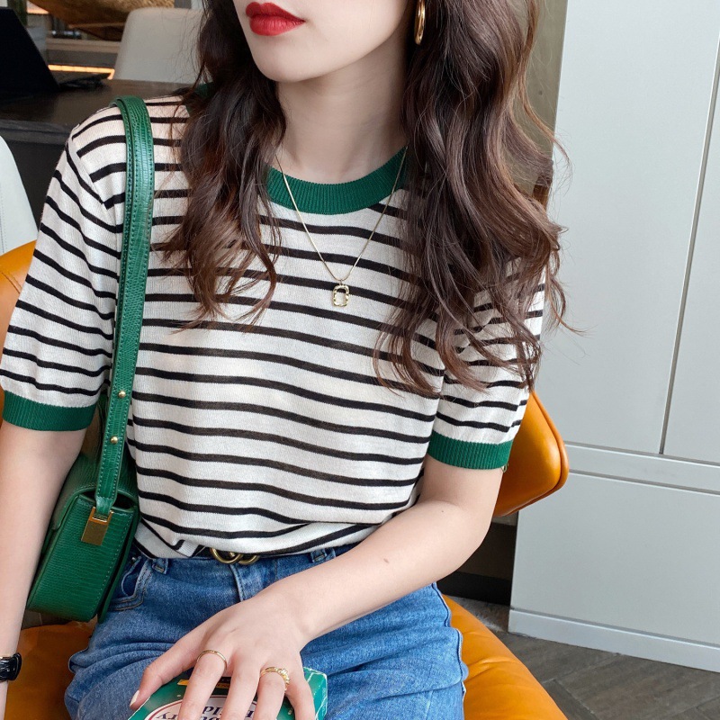 아이스 실크 반팔 스웨터 여성 얇은 스트라이프 티셔츠 대형 한국 스타일 바닥 반팔 여름 신작 탑스토어 가기