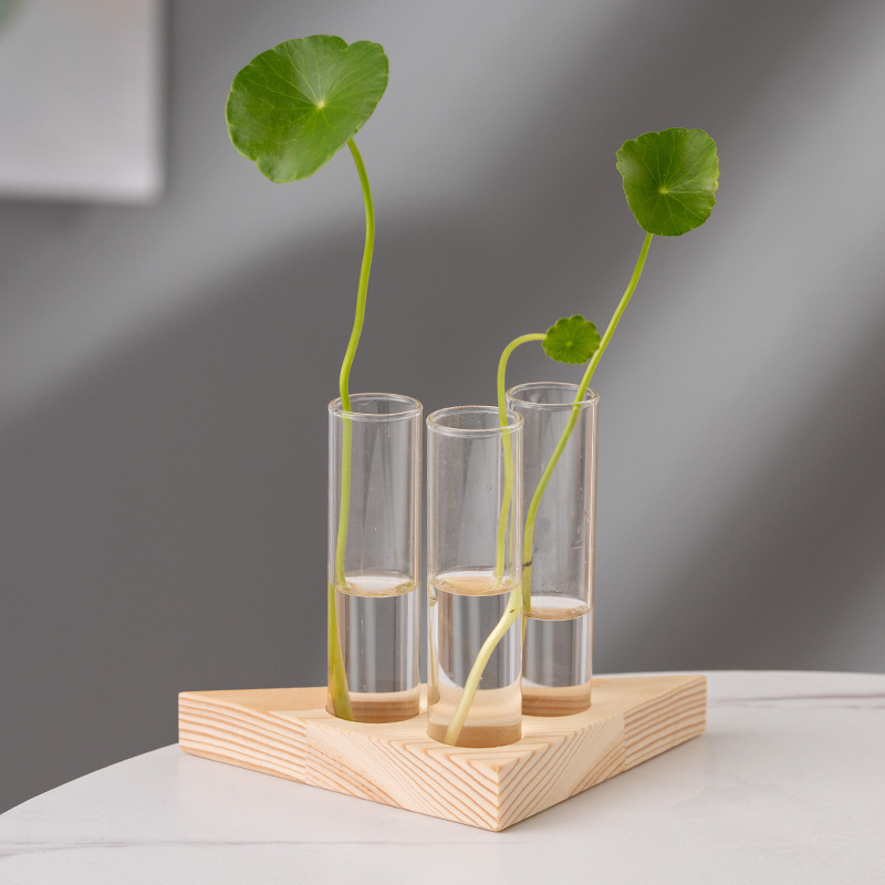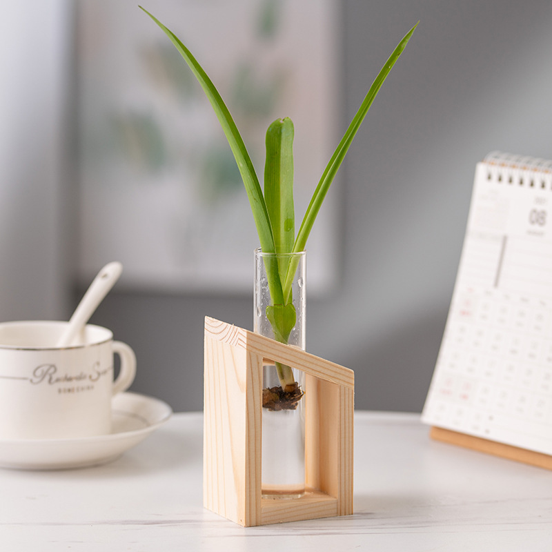 나무 프레임 수경 투명 테스트 튜브 유리 병 탁상 수경 녹색 식물 작은 꽃병 실내 테이블 간단한 작은 꽃스토어 가기