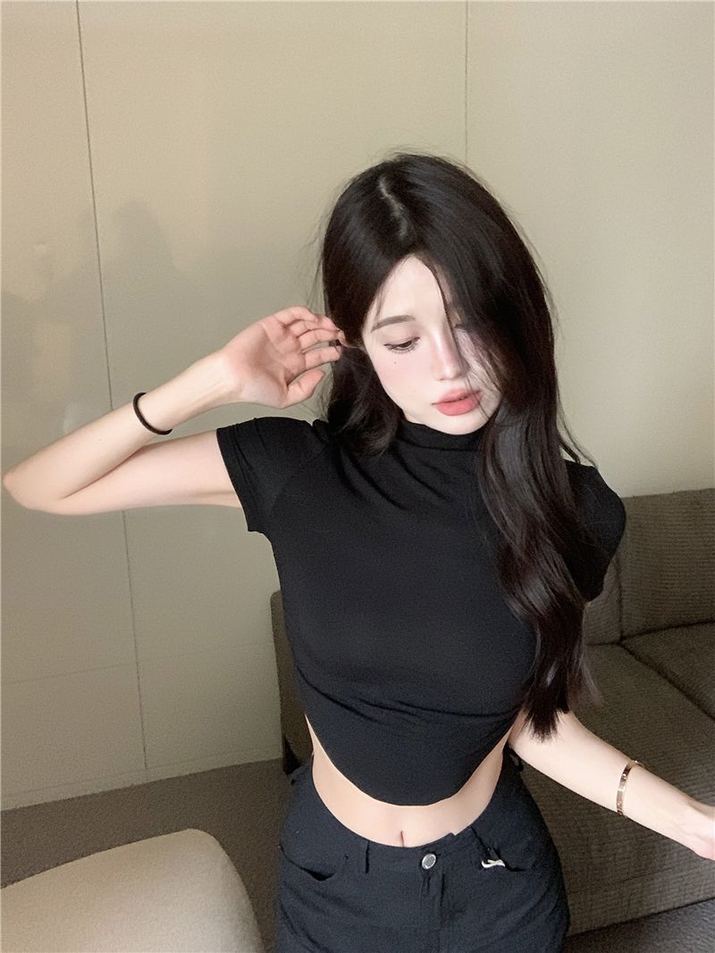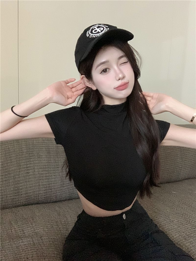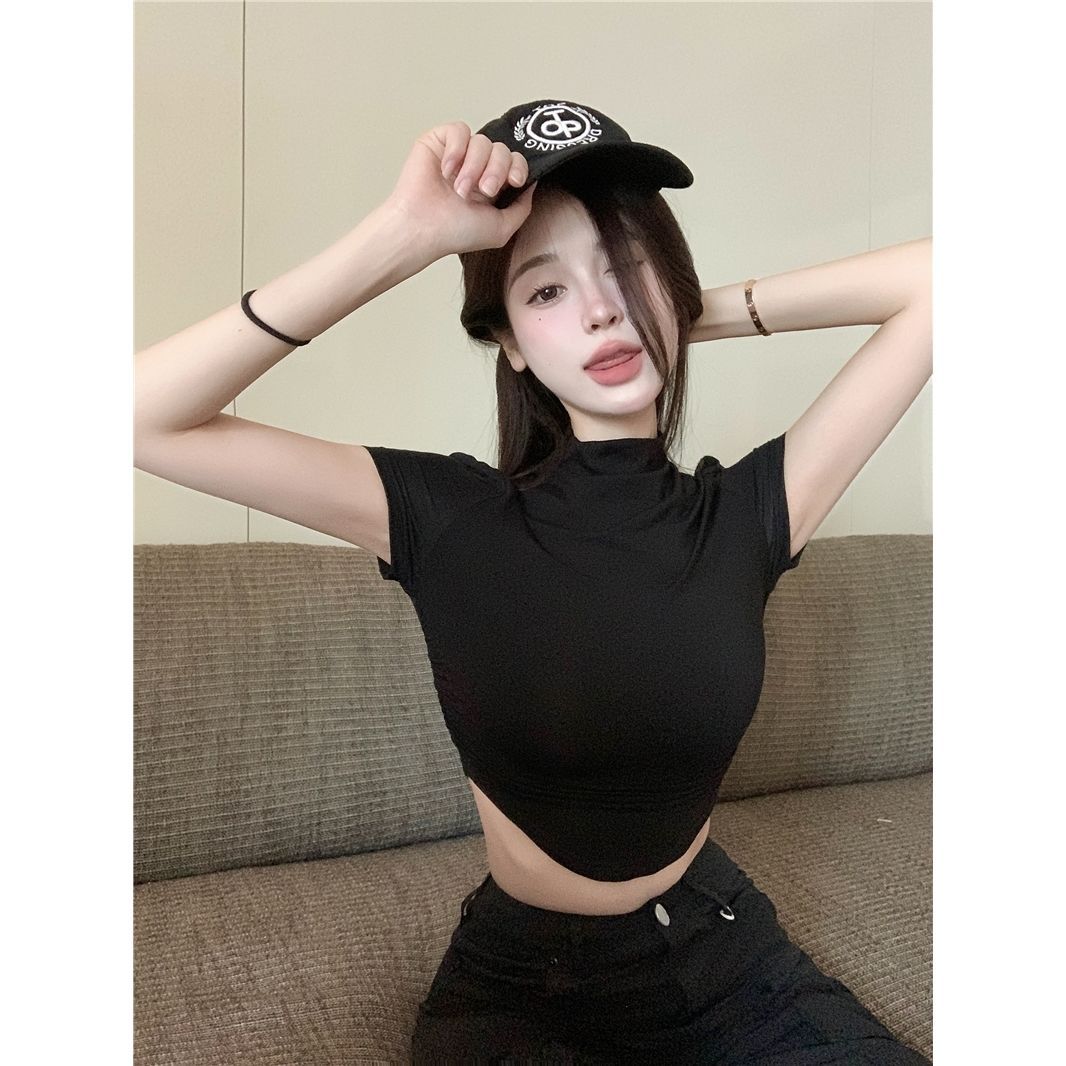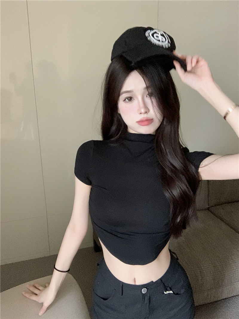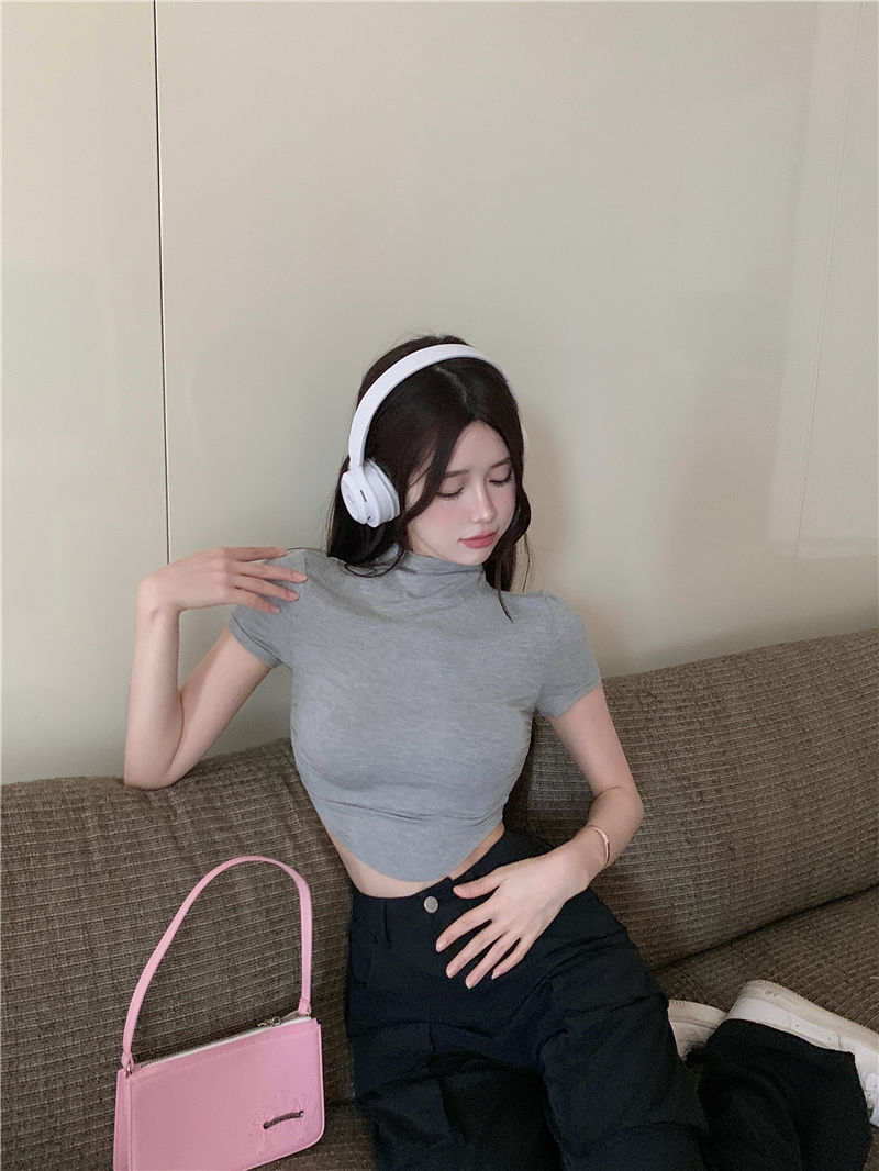 불규칙한 작은 터틀넥 반팔 티셔츠 여성 바닥 셔츠 여름 순수한 욕망 뜨거운 소녀 섹시한 꽉 짧은 디자인 탑스토어 가기
