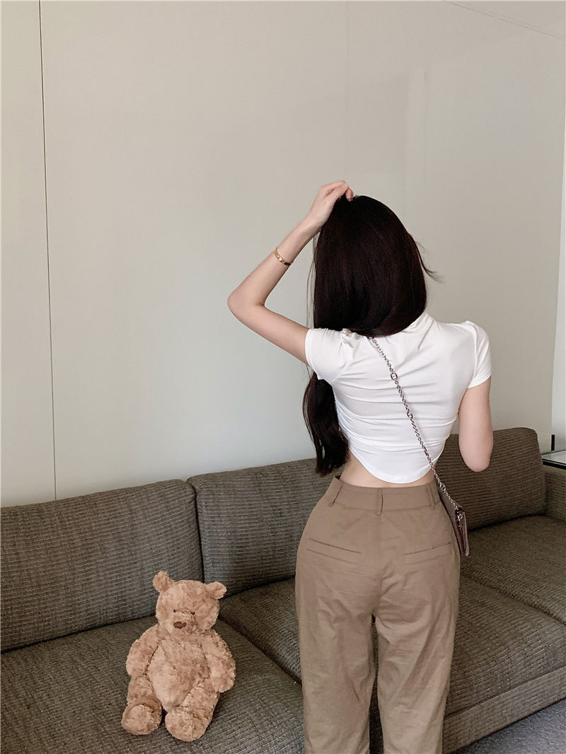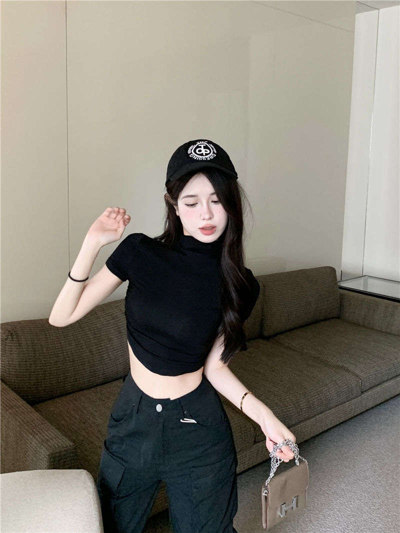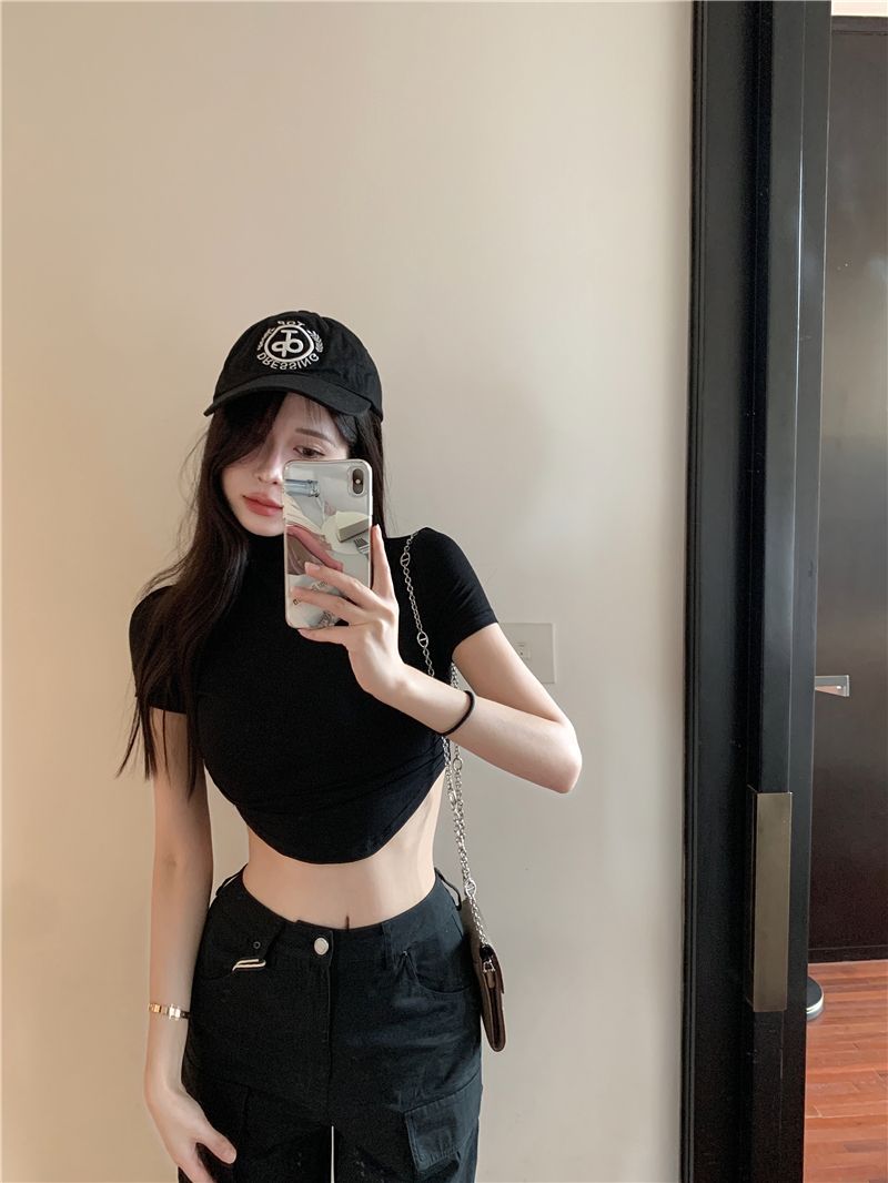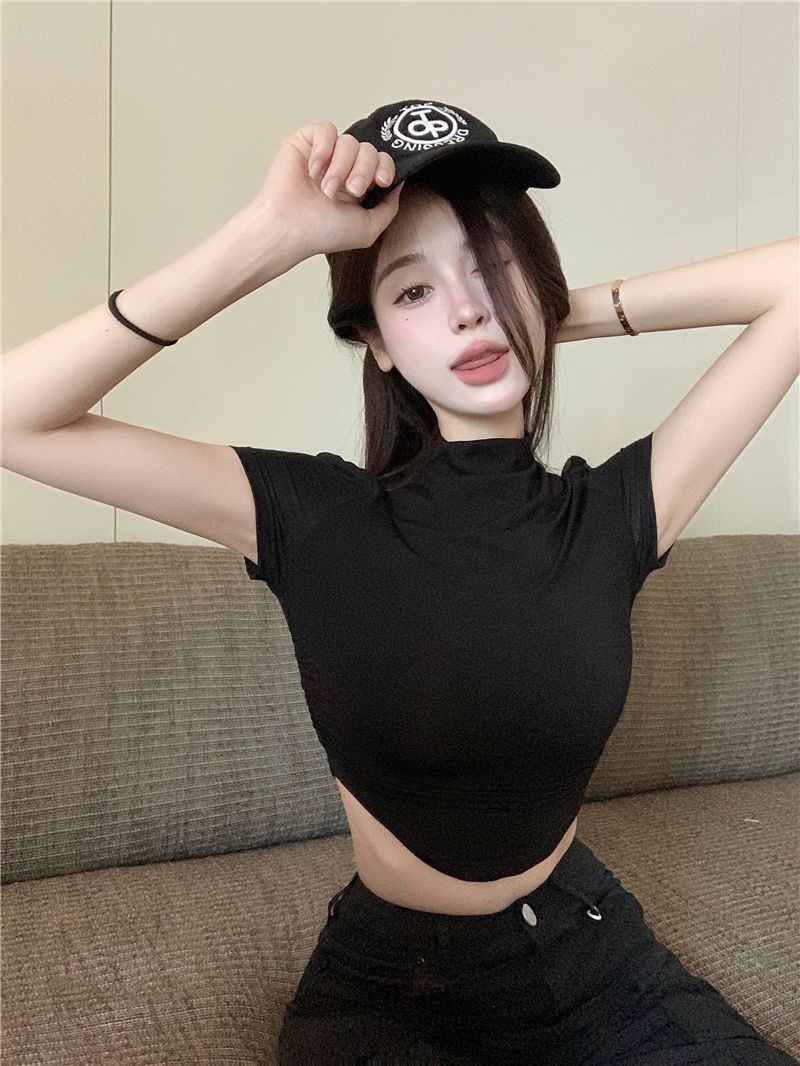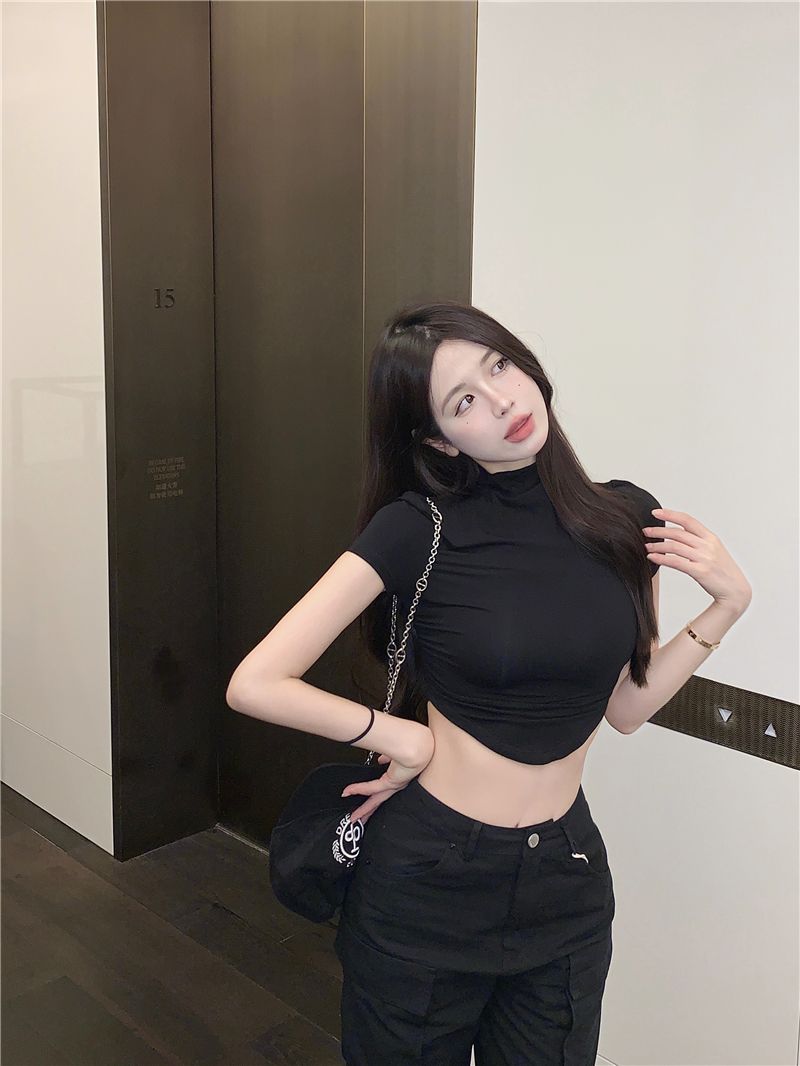 불규칙한 작은 터틀넥 반팔 티셔츠 여성 바닥 셔츠 여름 순수한 욕망 뜨거운 소녀 섹시한 꽉 짧은 디자인 탑스토어 가기