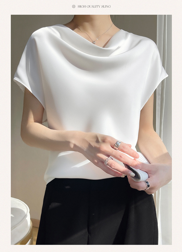 실크 새틴 2025 봄 여름 신작 짧은 여성 프렌치 칼라 기질 티셔츠 심플 반팔 대형 탑