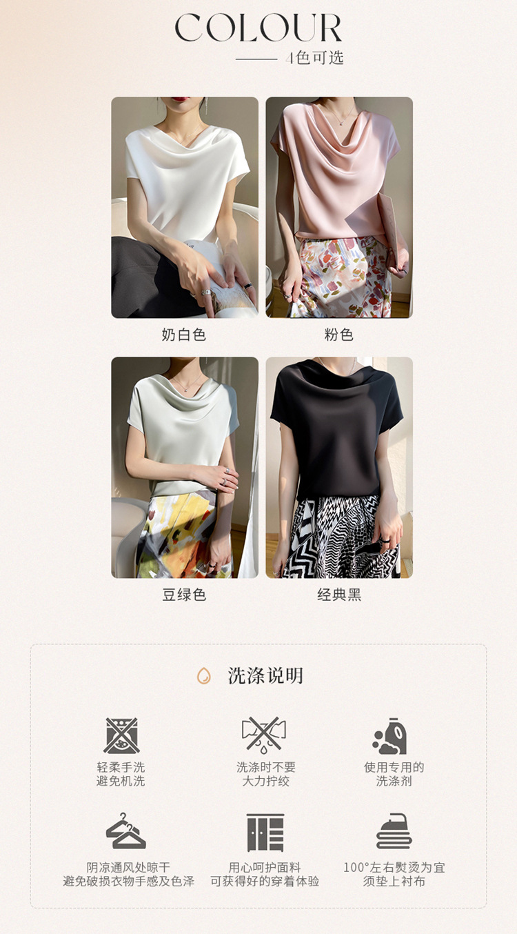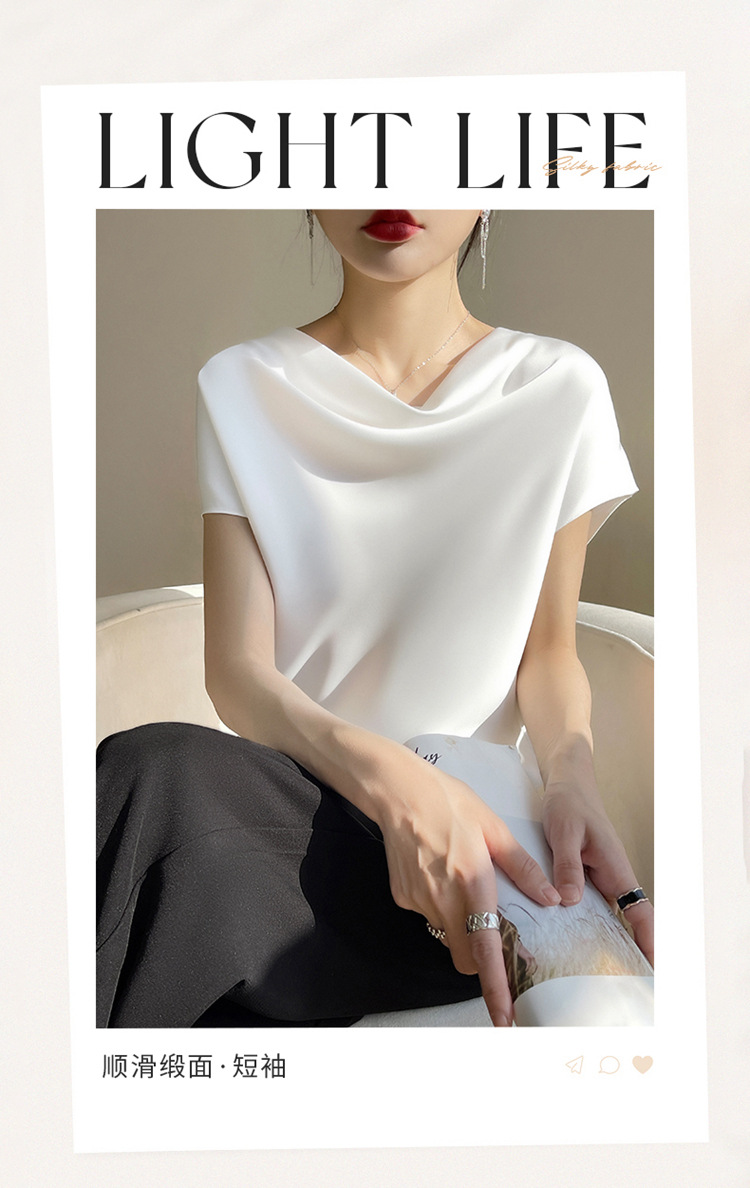 실크 새틴 2025 봄 여름 신작 짧은 여성 프렌치 칼라 기질 티셔츠 심플 반팔 대형 탑스토어 가기