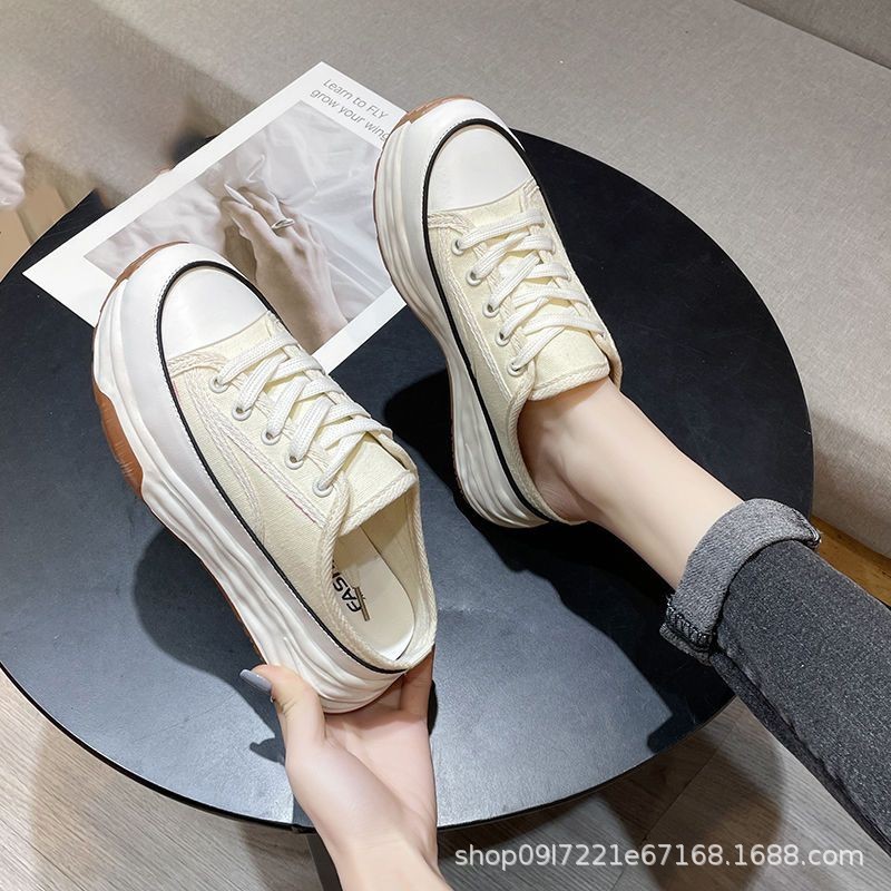 여성용 여름용 두꺼운 밑창 바오터우 반 슬리퍼 2025 새로운 플랫폼 밑창 증가 캐주얼 게으른 반 컵 캔버스 슬리퍼스토어 가기