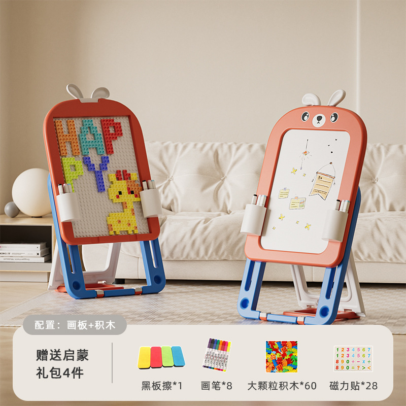 • 토끼 접이식 드로잉 보드 [빨강] + 빌딩 블록 + 의자/보내기 브러시 + 지우개 + 자석 스틱 + 빌딩 블록