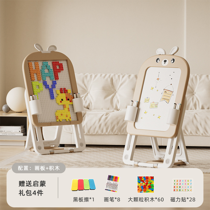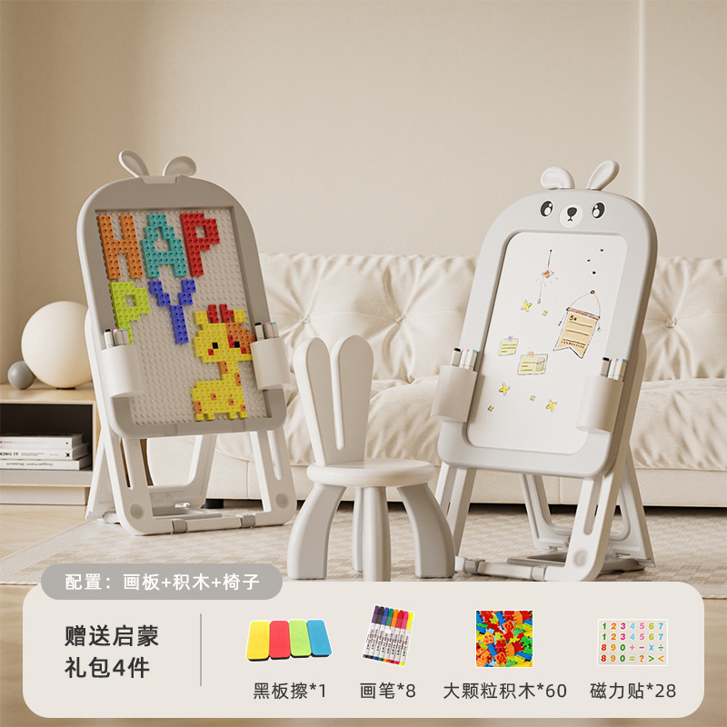 • 토끼 접이식 드로잉 보드 [그레이] + 빌딩 블록 + 의자/보내기 브러시 + 지우개 + 자석 스틱 + 빌딩 블록