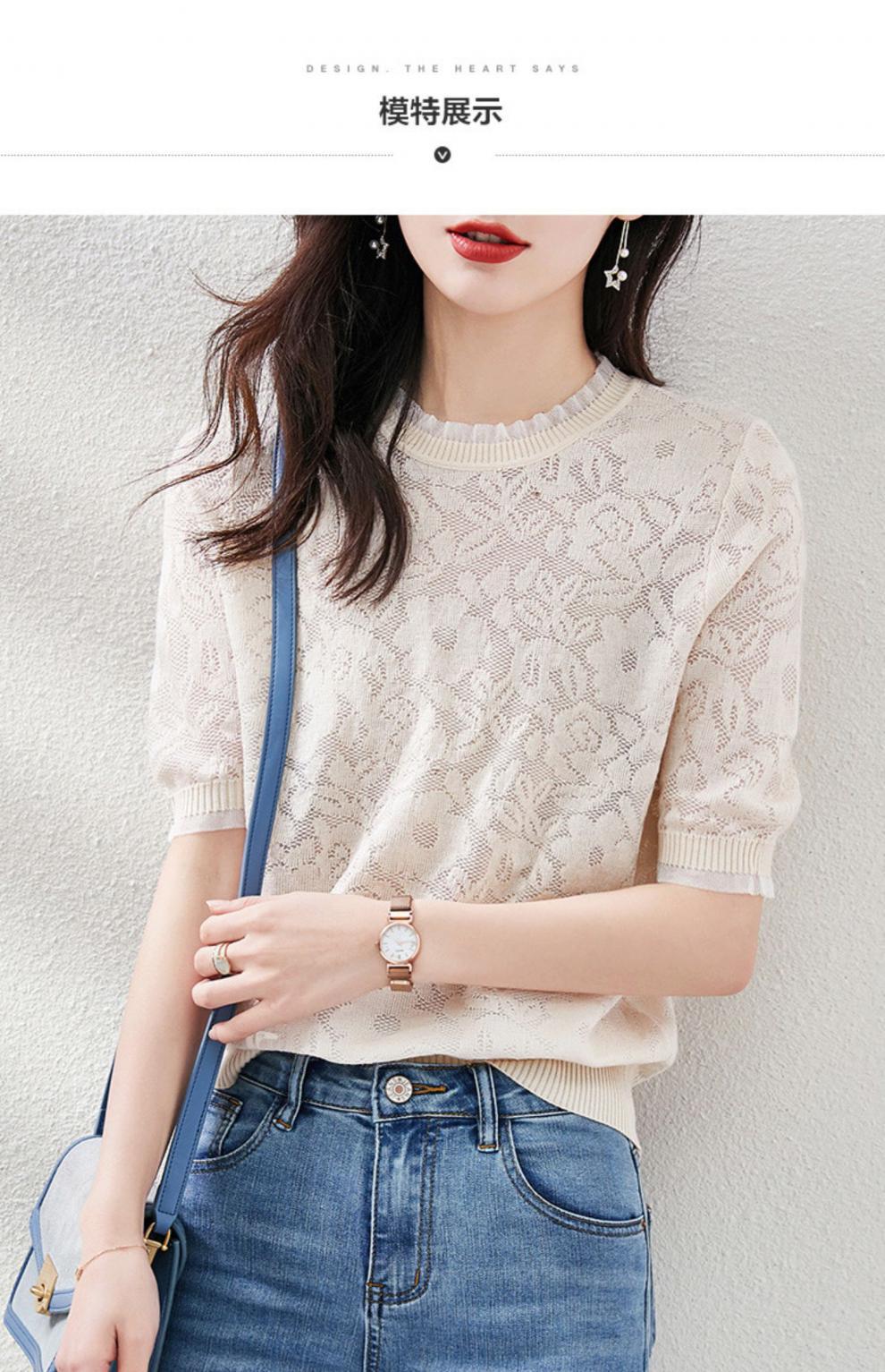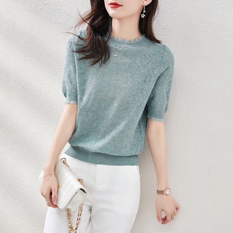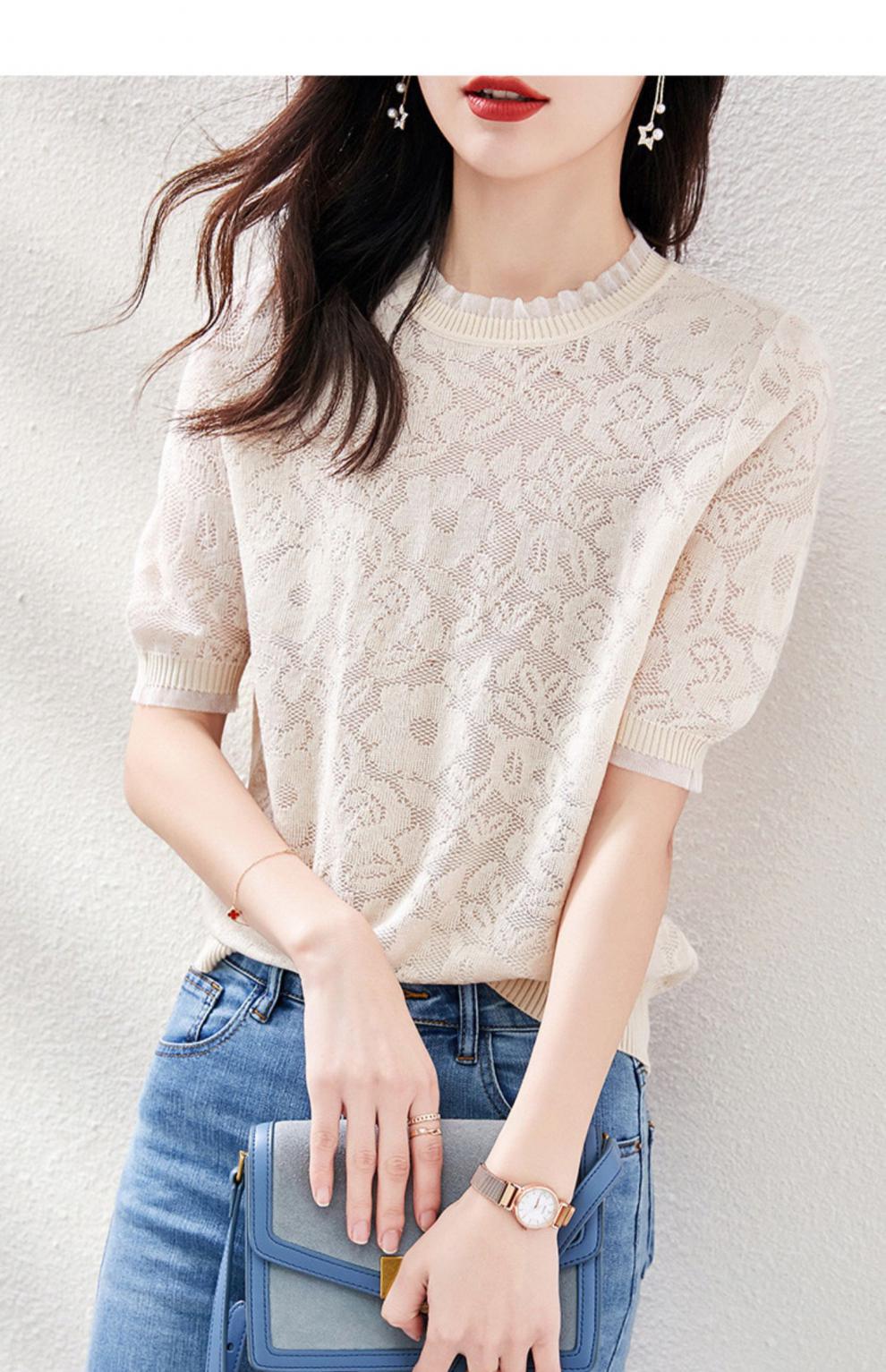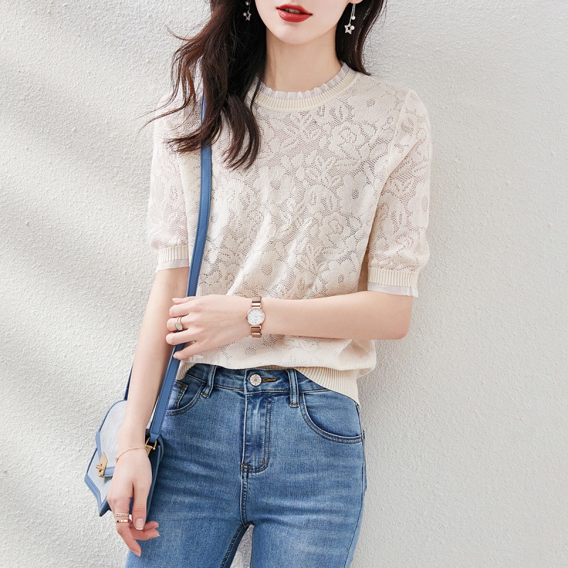 레이스 엣지 반팔 티셔츠 여성용 2023 여름 새로운 중공 크로 셰 뜨개질 얇은 니트 스웨터 짧은 우아한 작은 탑스토어 가기